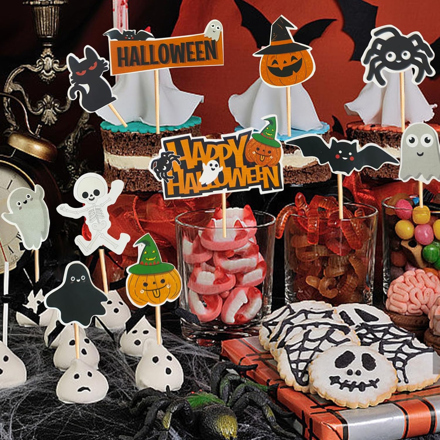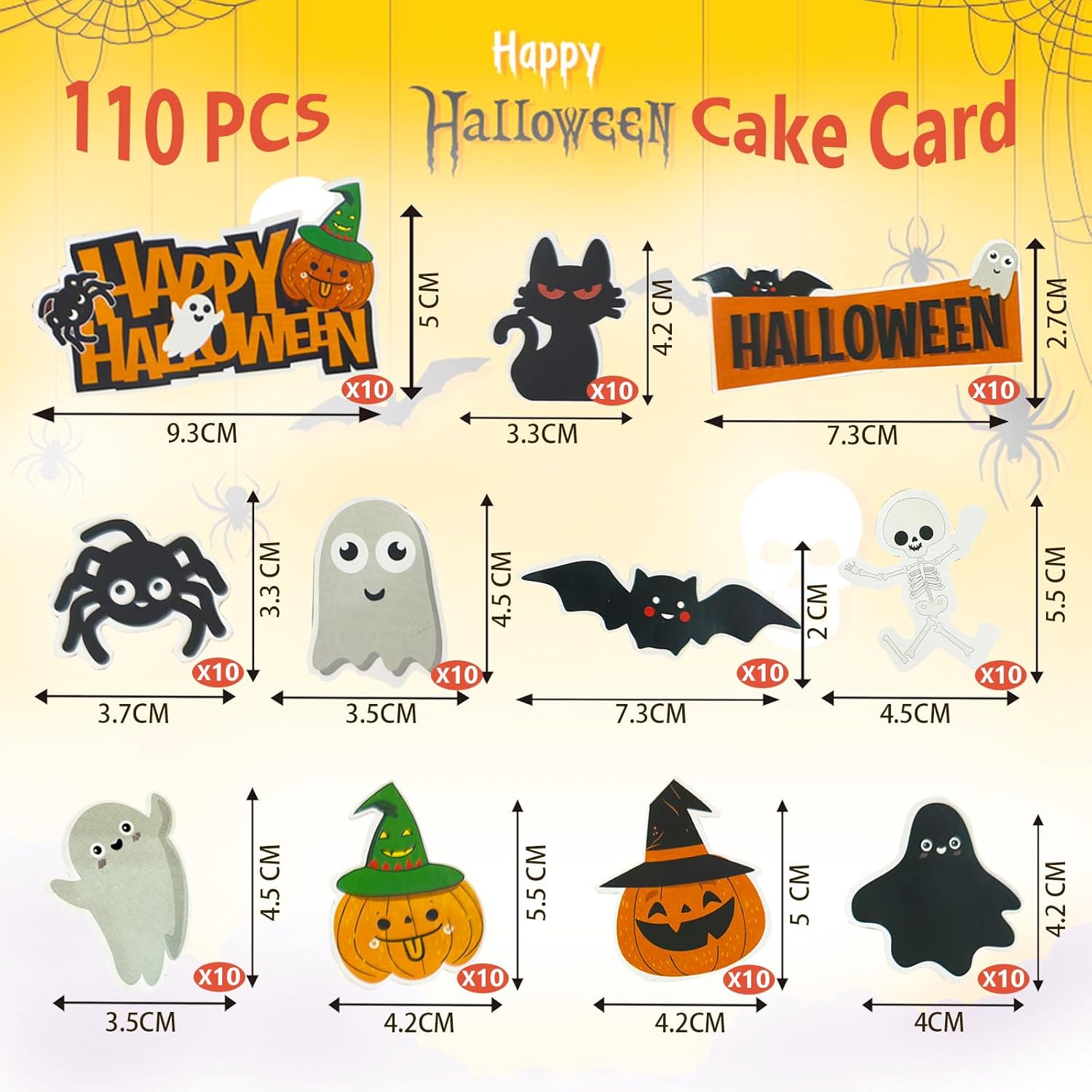 Materiale - Cake topper di Halloween è progettato con cartoncino,fine e resistente, possono abbinarsi a diversi tipi di torta e rendere la tua torta più attraente. Set di Decorazioni di Halloween - 110 pezzi nella confezione, hanno 11 diversi design di decorazioni per torte, zucche, gatti neri, fantasmi bianchi, pipistrelli, scheletri, Happy Halloween e ragni neri, ecc. Regalo di Halloween - La decorazione della torta per feste di Halloween può facilmente creare un evento a tema Halloween.Renderanno i tuoi cupcake più attraenti e porteranno divertimento alla tua festa. per gli amici a cui piace organizzare feste, una decorazione per torte molto ideale. Ampia applicazione - Questo portacarte per torta di compleanno non è solo per decorare torte, ma può anche decorare dessert, muffin,biscotti e altre decorazioni fai-da-te, il che non solo ti fa risparmiare scelte, ma rende anche la festa più interessante e ti offre un'esperienza accogliente e divertente. Facile da Usare - Puoi assemblarlo in pochi minuti. Fare attenzione durante il montaggio. Il prodotto è relativamente fragile, non smontarlo violentemente.Questi simpatici toppers per cupcake di Halloween non sono commestibili, e per favore non metterli nel forno, solo per la decorazione del cibo.