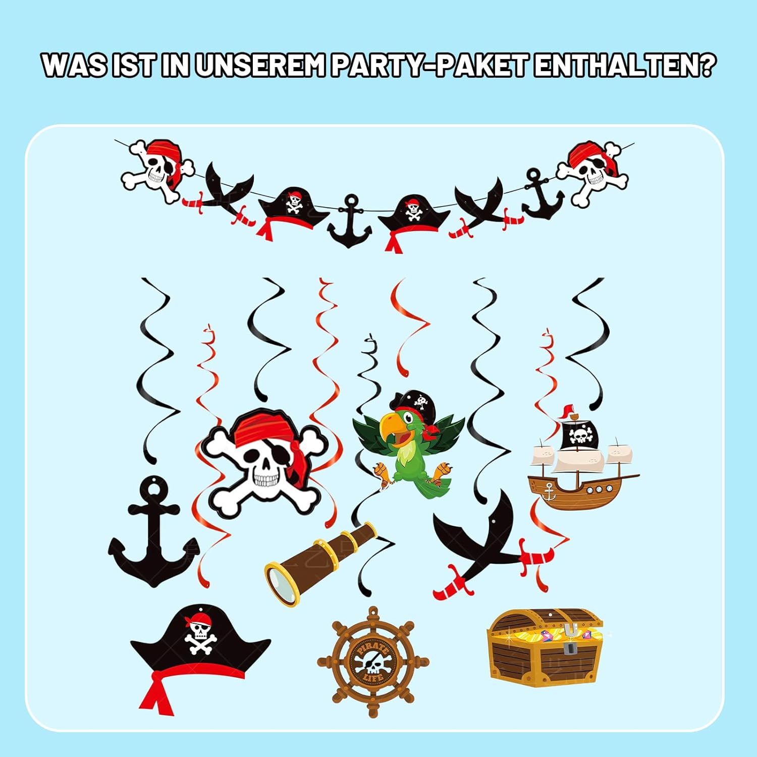Ampio set decorativo pirata: contiene 9 carte con diversi motivi pirati, 9 spirali e ganci per appenderla facilmente; più un ulteriore striscione con motivo pirata per una maggiore varietà di decorazioni Materiali di alta qualità: realizzato in cartone resistente e foglio di alluminio durevole; stampato su entrambi i lati per creare un'atmosfera pirata vivace ad ogni festa dei pirati Facile installazione: spirali e carte si collegano facilmente; ideale per soffitti, pareti e porte; decorazione rapida per feste di compleanno dei pirati Design versatile: contiene motivi come navi, capitano, teschi e tesori; perfetto per decorazioni pirate e temi del tesoro dei pirati Riutilizzabile e versatile: abbastanza resistente per un uso ripetuto; ideale per feste a tema pirata, compleanni dei pirati e altri eventi a tema