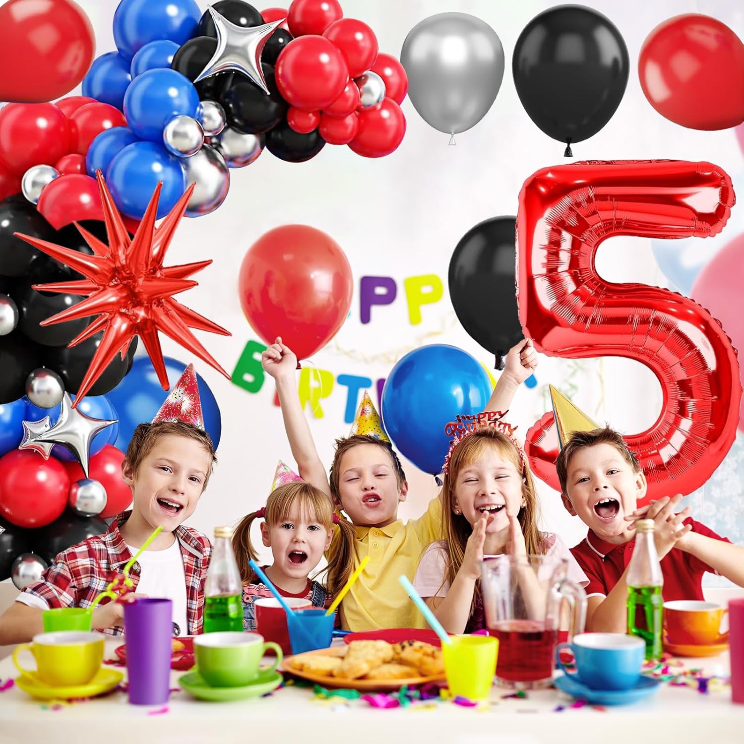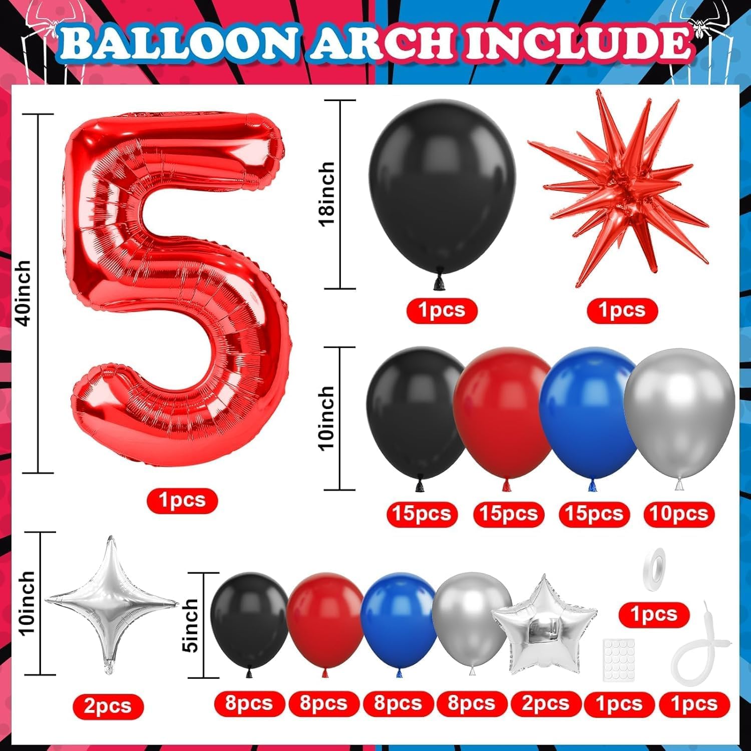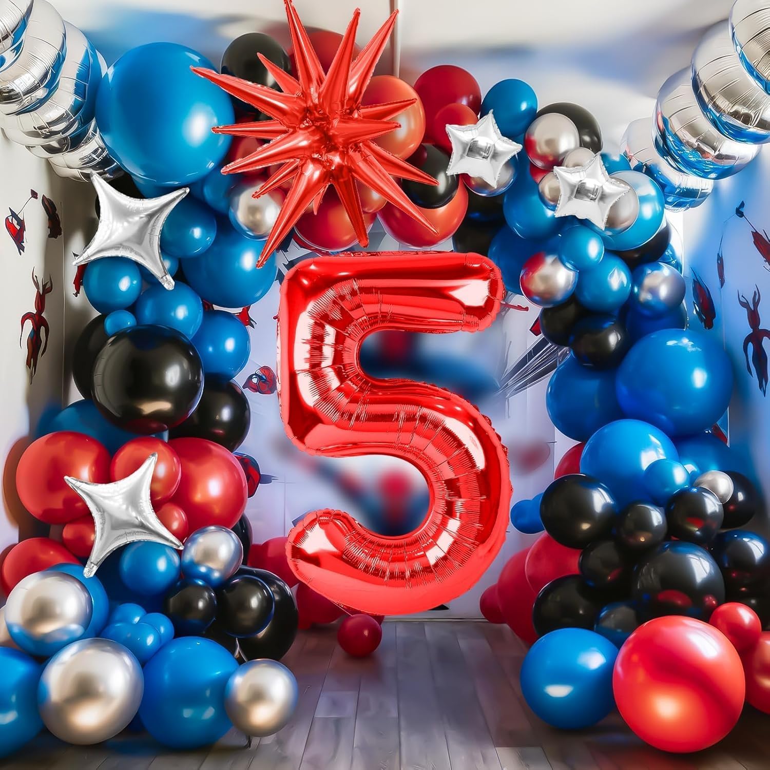 🕷 Palloncini 5 Anni Compleanno Rosso: include un palloncino con il numero 5, un Stella Esplosiva Palloncino in Foil, quattro palloncini a forma di stella, palloncini in lattice neri (18 pollici * 1, 10 pollici * 15 e 5 pollici * 8), palloncini in lattice blu (10 pollici * 15 e 5 pollici * 8), palloncini in lattice rossi (10 pollici * 15 e 5 pollici * 8), palloncini argento metallizzato (10 pollici * 10 e 5 pollici * 8), e un palloncino lungo bianco. 🕸 Alta Qualità: realizzati con materiali di alta qualità, i Kit Arco Palloncini Nero Rosso Blu sono resistenti, atossici e sicuri. Non scoppiano né si sgonfiano facilmente, mantengono la loro forma a lungo e sono adatti a bambini e animali domestici. Questi palloncini luminosi e resistenti aggiungeranno più divertimento ed entusiasmo alla tua festa. Riutilizzabili. 🕷 Design Unico: il Kit Arco Palloncini Nero Rosso Blu crea un look visivamente accattivante e vivace. Adatto sia per occasioni formali che informali, renderà sicuramente la tua festa unica. 🕸 Facile da Usare: i Kit Arco Palloncini Nero Rosso Blu possono essere gonfiati ad aria o elio. Si consiglia l'uso di una pompa ad aria. Il nastro incluso consente di disporre facilmente i palloncini in gruppi, archi o fondali senza passaggi complicati. Anche le composizioni preliminari possono essere create rapidamente, ispirando la tua creatività e permettendoti di divertirti con le decorazioni fai da te. 🕷 Ampia Applicazione: il Kit Arco Palloncini Nero Rosso Blu è perfetto per feste a tema, compleanni per bambini, baby shower, feste di laurea, matrimoni e feste di fidanzamento, festival e vari eventi al chiuso e all'aperto. Può anche essere facilmente appeso ad alberi, porte, pareti, pilastri, tavoli da pranzo, finestre e altro ancora.