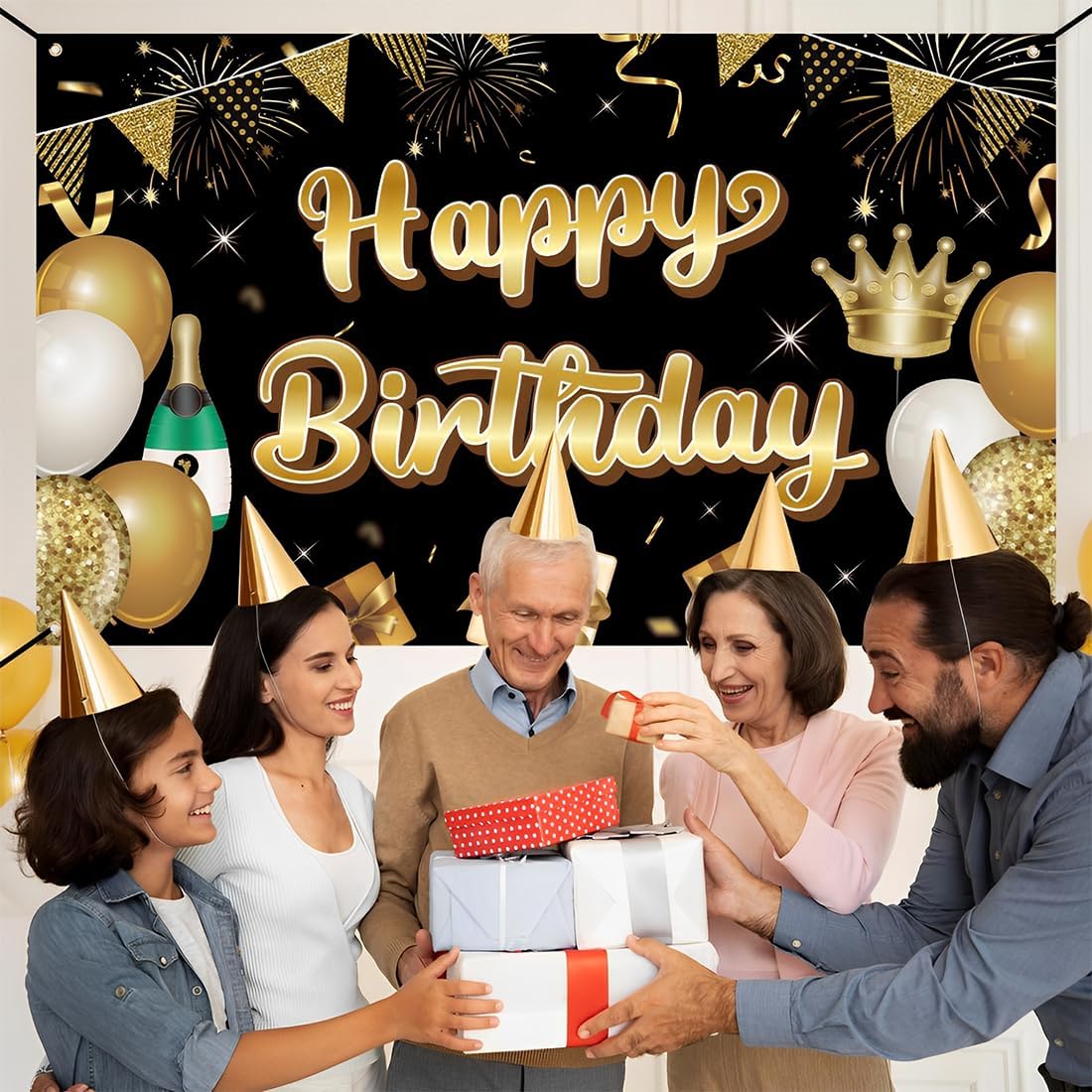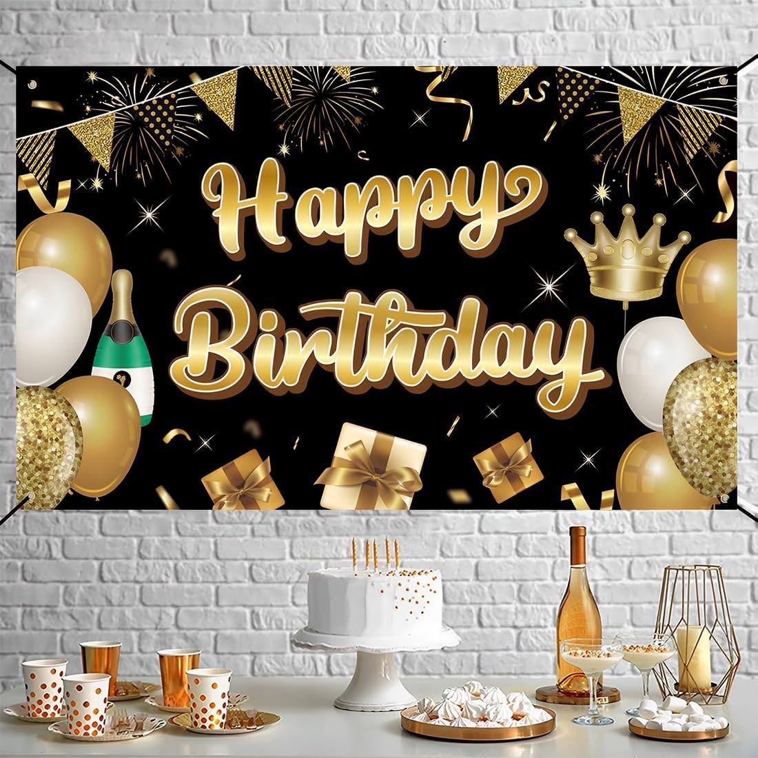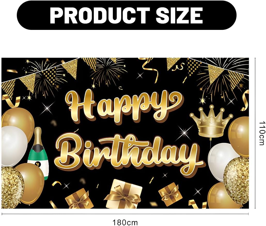 Design luminoso: i classici nero e oro come colori principali, con cartelli dorati con la scritta "Happy Birthday", completati da palloncini, scatole regalo, corone e altri elementi, alla moda e accattivanti, per creare un'atmosfera lussuosa e gioiosa. Dimensioni adatte: 180 cm x 110 cm, dimensioni adatte, può essere utilizzato come sfondo per una festa di compleanno, diventa il fulcro visivo del luogo, adatto a diverse esigenze di disposizione del luogo. Ottima qualità: realizzato in materiale durevole, immagine nitida, colori brillanti, non sbiadisce facilmente, non si rompe, può essere utilizzato più volte, aggiungendo un fascino duraturo alla festa di compleanno. Installazione comoda: dotato di accessori di montaggio, facile da installare, può essere rapidamente appeso alla parete, alle recinzioni esterne e in altri luoghi, risparmiando tempo di preparazione della festa. Ampiamente utilizzato: adatto a tutti i tipi di feste di compleanno, che si tratti di compleanni di adulti o bambini, può essere perfetto, migliorare lo stile della festa e lasciare un bel ricordo.