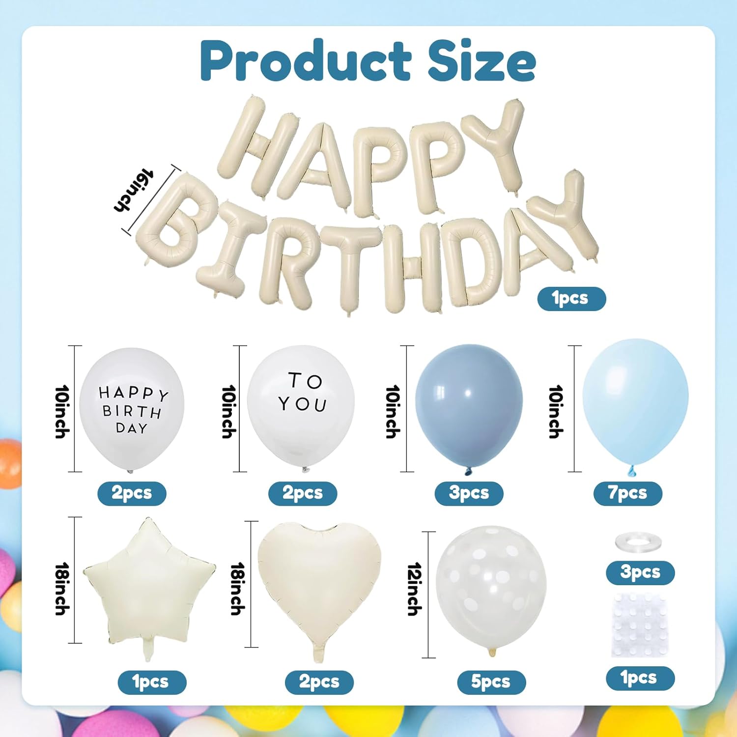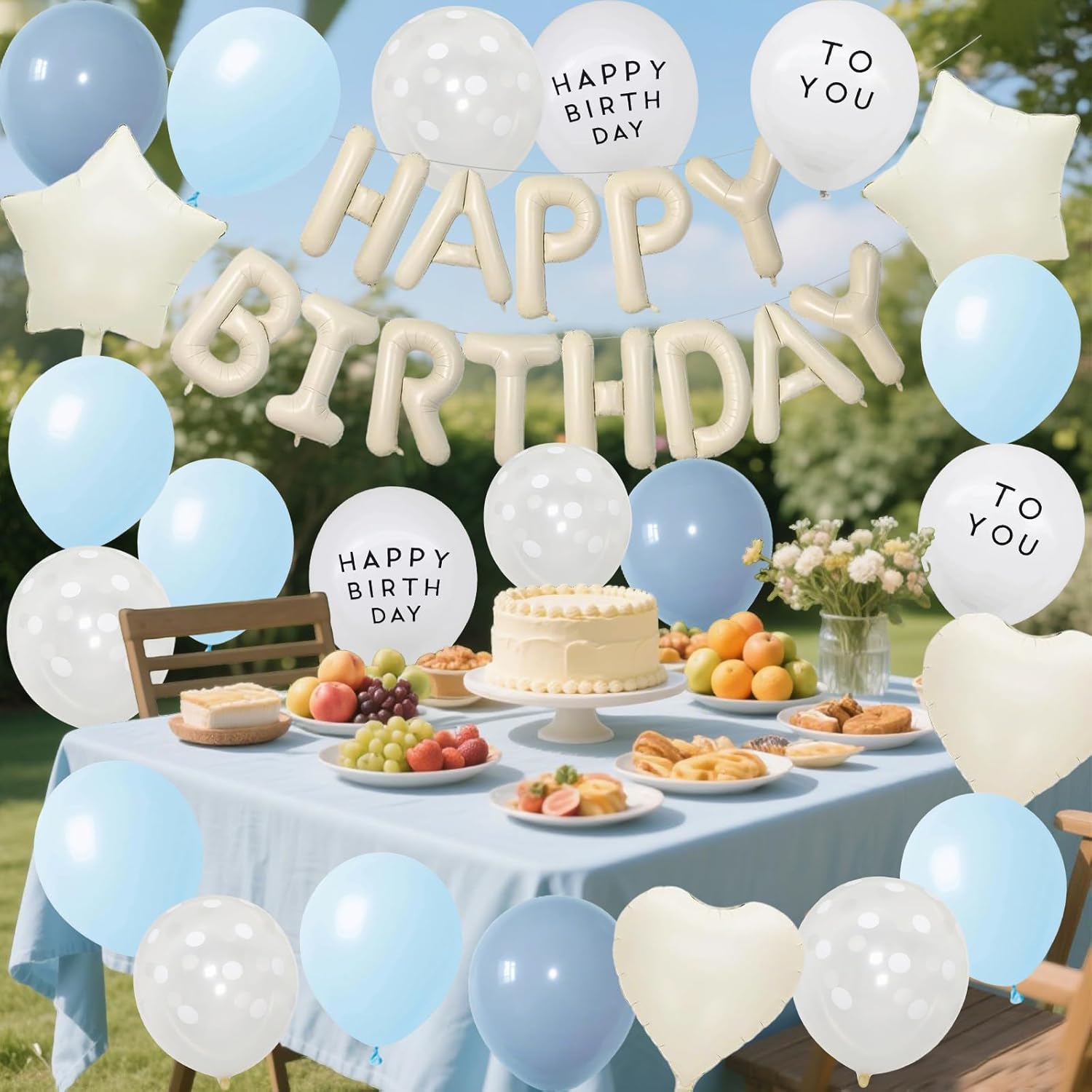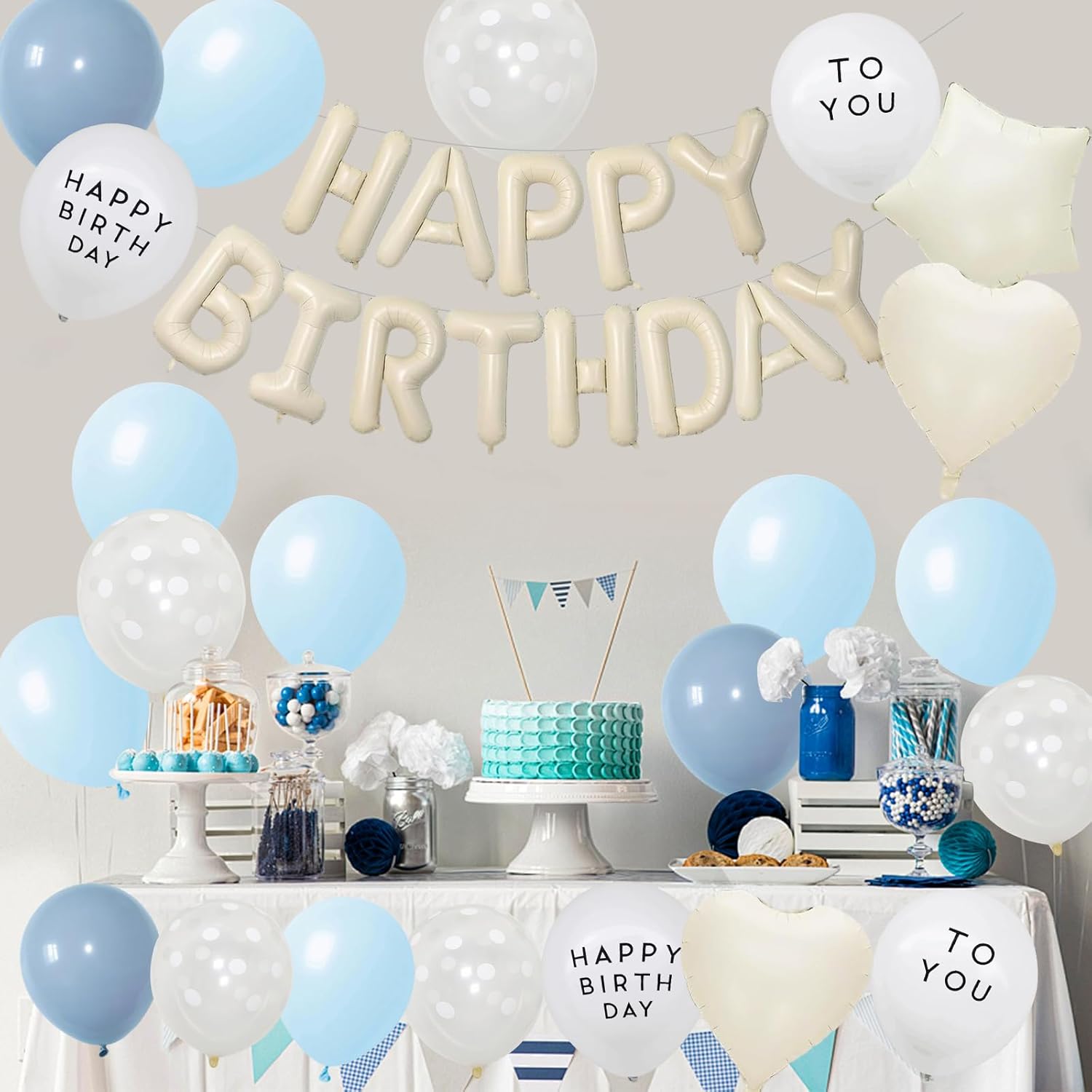 Set completo di decorazioni: striscione Happy Birthday con palloncini di diverse dimensioni e nastri decorativi. Questo è un set regalo attentamente pianificato che crea un'atmosfera da sogno per la tua festa di compleanno. Aggiornamento materiale: lo striscione Happy Birthday è realizzato in resistente foglio di alluminio. I palloncini sono robusti, durevoli, non facili da scoppiare e possono essere riutilizzati, rendendoli la scelta ideale per la decorazione della festa di compleanno. Festa di compleanno indimenticabile: questo set di palloncini color crema, bianchi e blu, combinato con palloncini con benedizione, può aggiungere vitalità ai compleanni. Basta gonfiarlo e assemblarlo per creare facilmente splendidi sfondi per le feste, rendendo le occasioni speciali ancora più indimenticabili. Adatto a molte occasioni: questo set di decorazioni con palloncini Happy Birthday è la scelta ideale per festeggiare compleanni, riunioni di famiglia, feste a sorpresa o attività all'aperto, rendendo facile decorare feste al chiuso e all'aperto. Facile da montare: il palloncino è facile da montare e può essere decorato dopo il gonfiaggio. Puoi esprimere liberamente la tua creatività e decorare il palloncino ovunque tu voglia, che sia appeso, impilato o utilizzato come decorazione da tavolo, può essere facilmente realizzato.