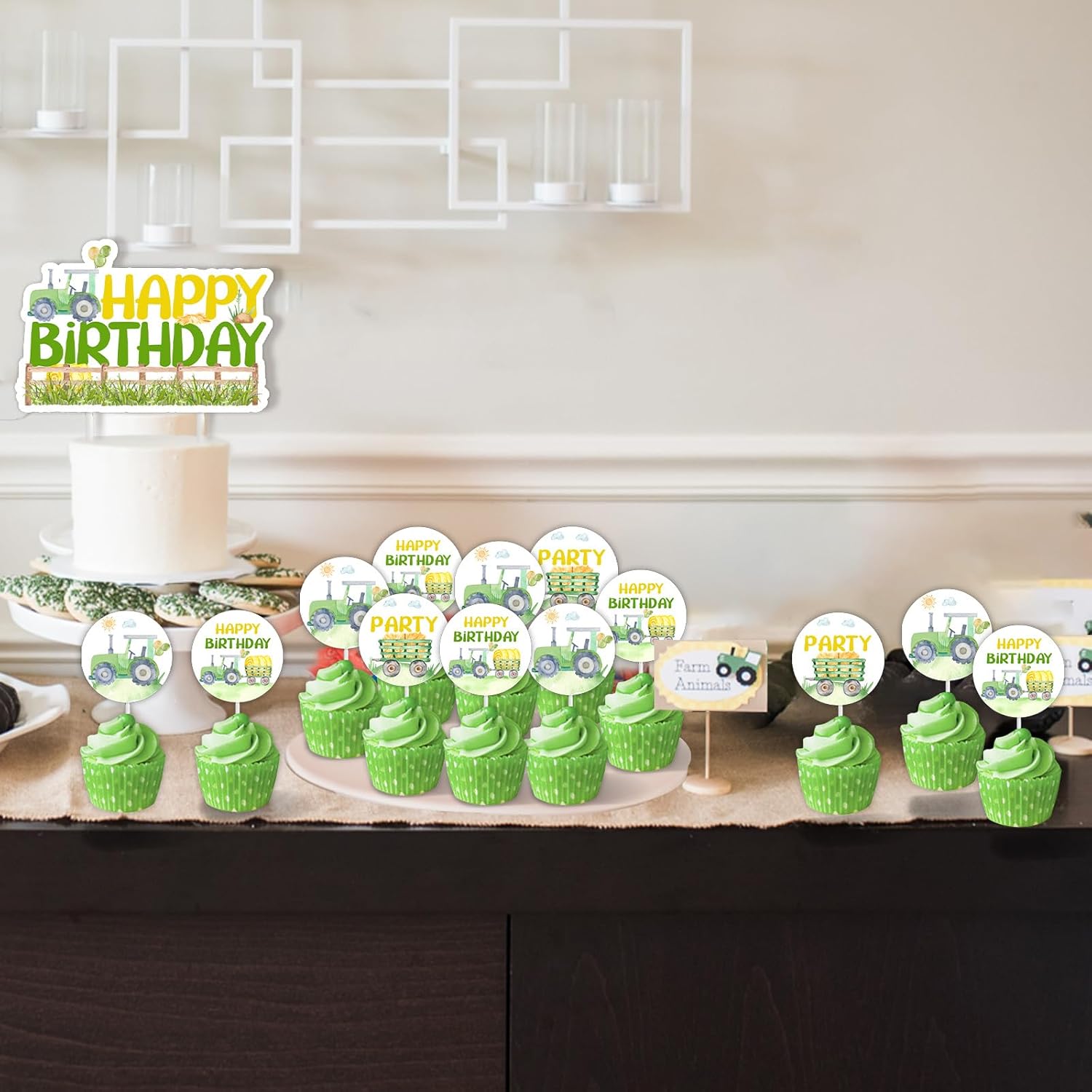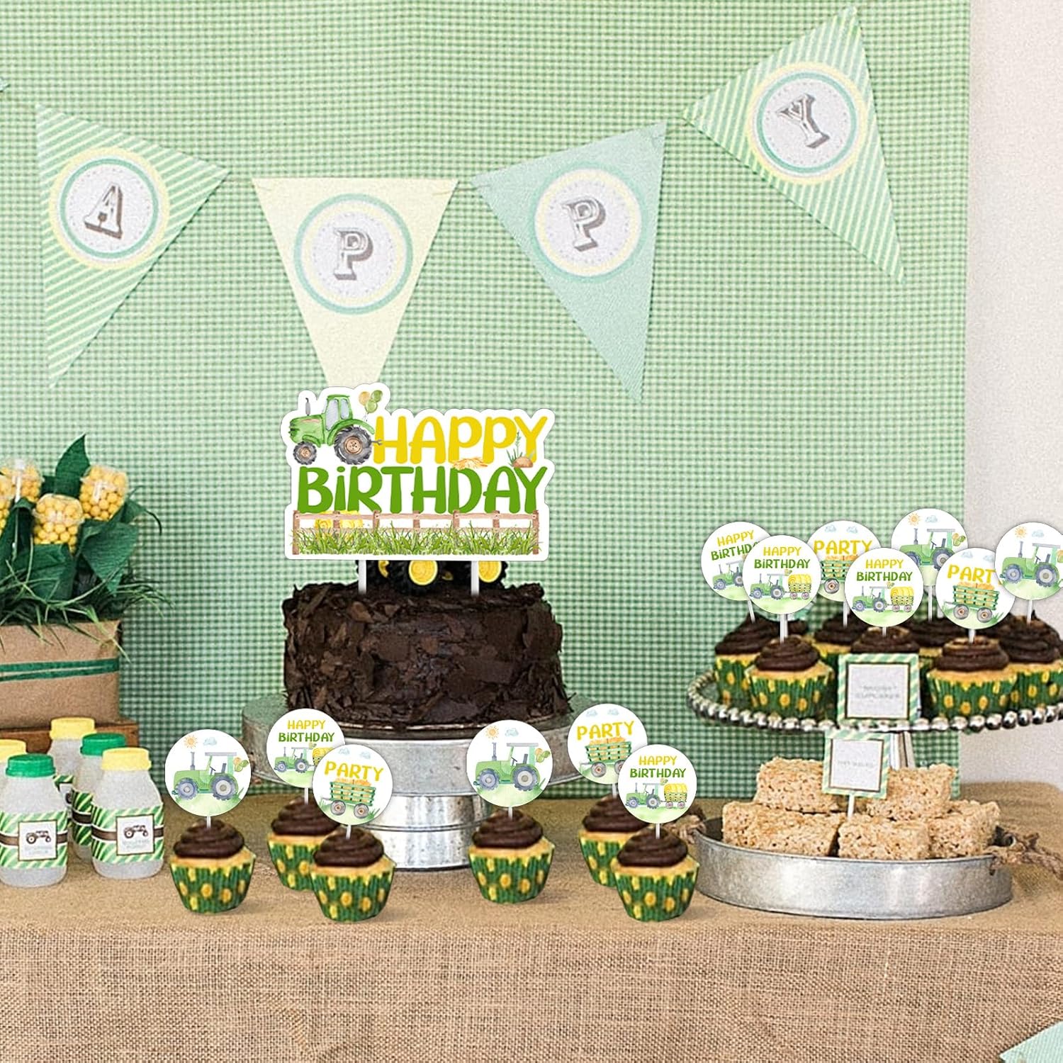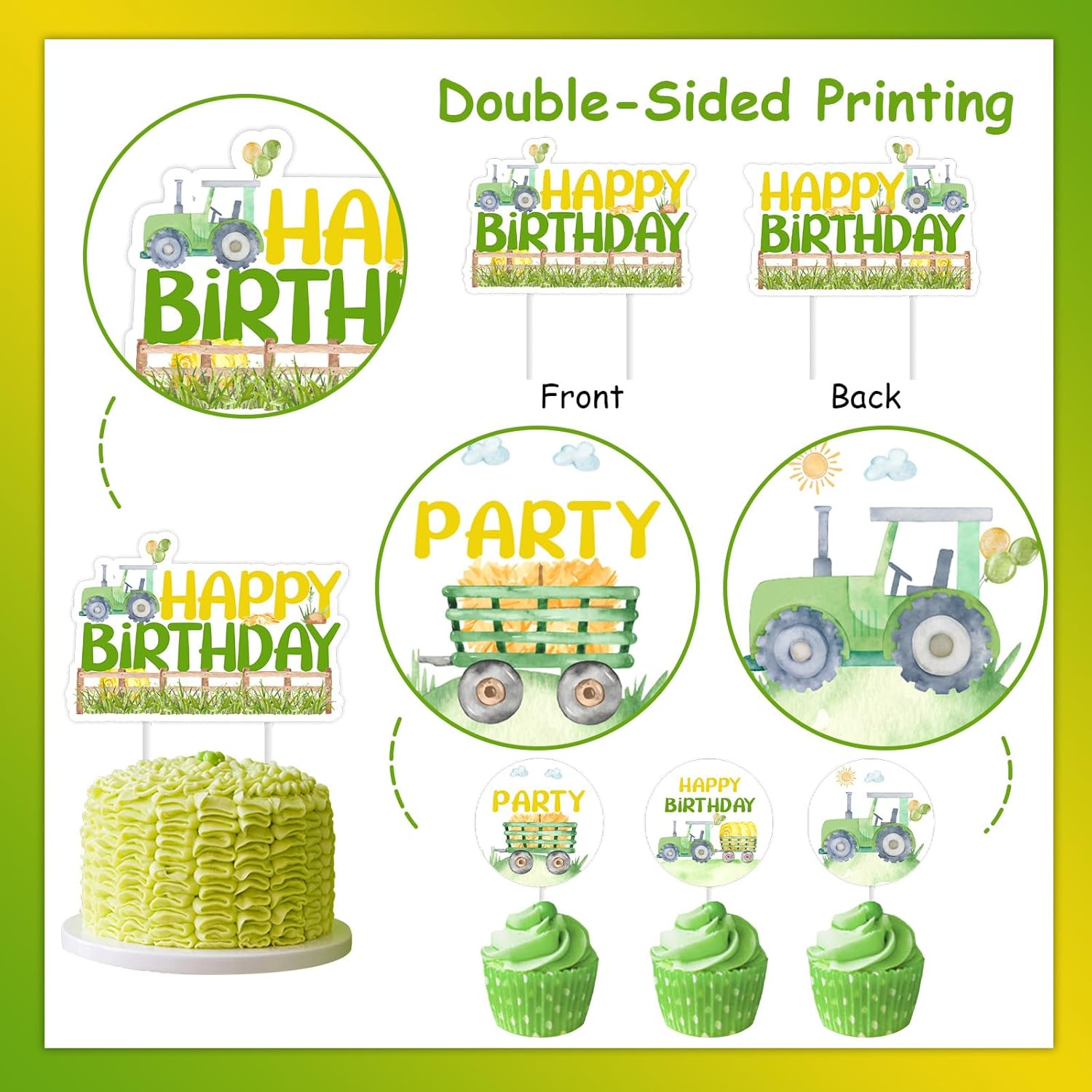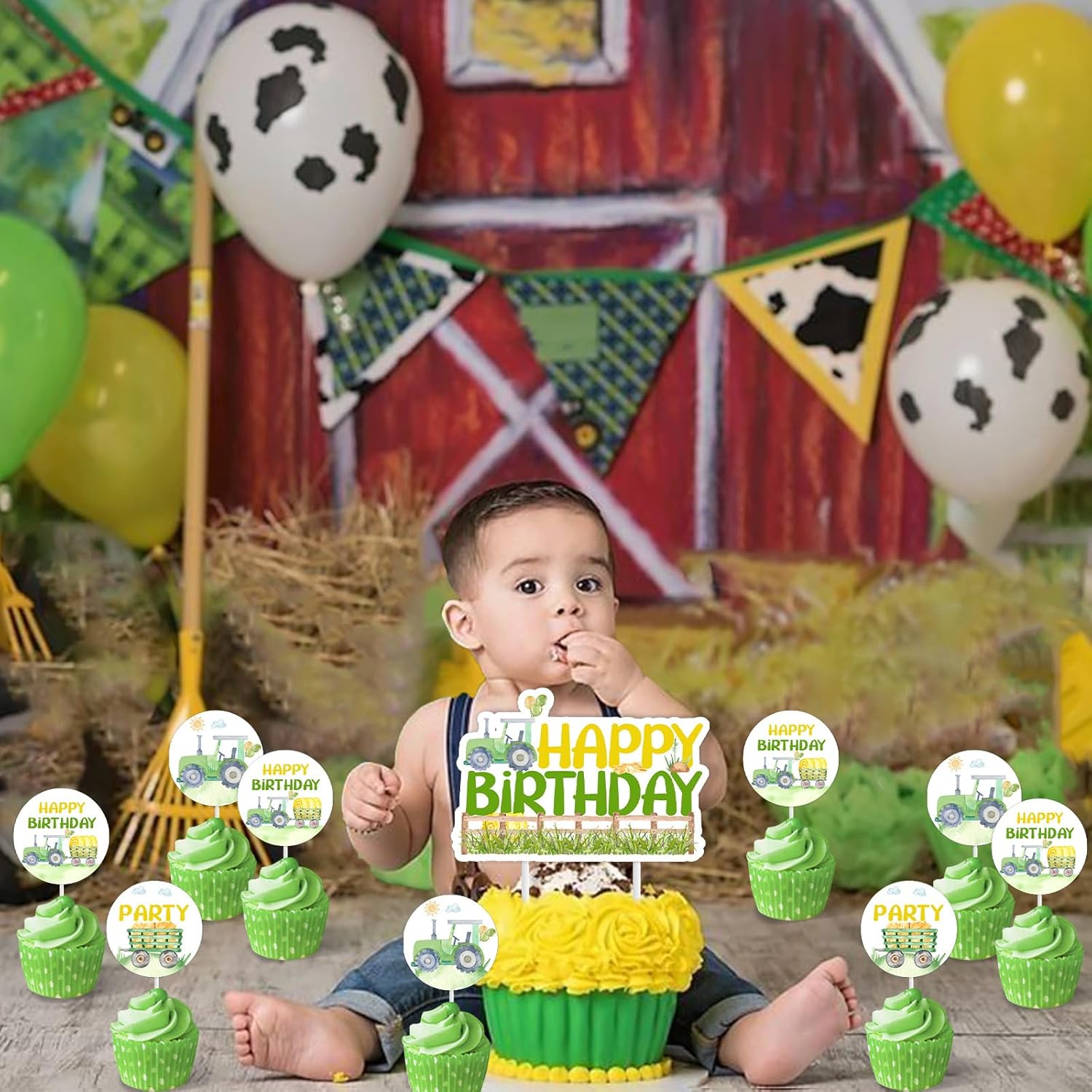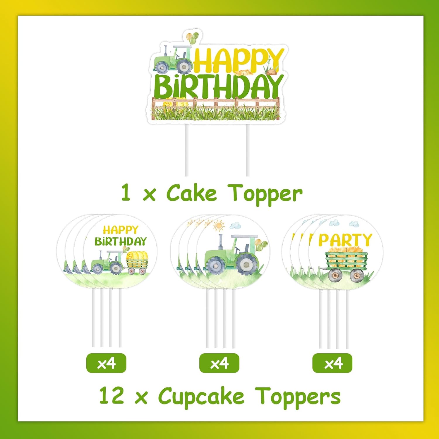 Decorazioni di compleanno per il trattore: i nostri toppers per torta per trattore aggiungeranno un tocco affascinante alla festa di compleanno del tuo trattore agricolo, renderanno le tue torte e cupcakes più attraenti. La confezione include: 1 toppers per torta di compleanno per trattore, 12 toppers per cupcake per trattore. Materiale: le decorazioni per la festa di compleanno del trattore sono realizzate in cartoncino stampato fronte-retro, robusto, atossico e inodore. Design unico: i toppers cupcake del trattore sono progettati in 3 modelli diversi, che attirano l'attenzione per una festa di compleanno di un trattore agricolo. Ampia applicazione: i toppers per torte e cupcake con trattore sono perfetti per feste di compleanno di trattori, 1° compleanno, 2° compleanno di ragazzi, feste di compleanno a tema fattoria, compleanni di tosaerba, torte schiacciate, ecc.