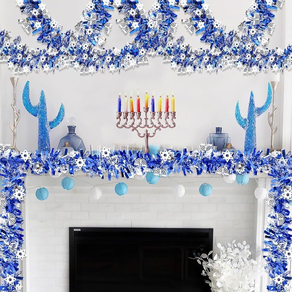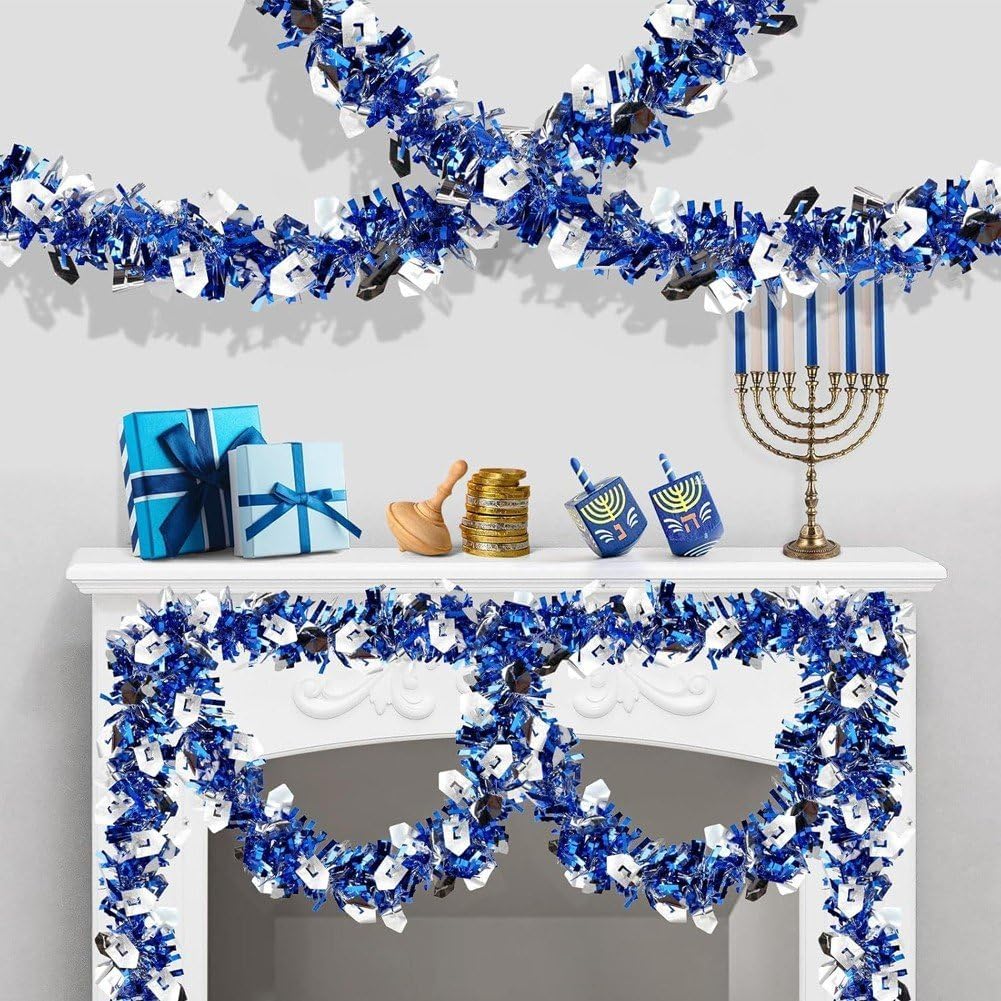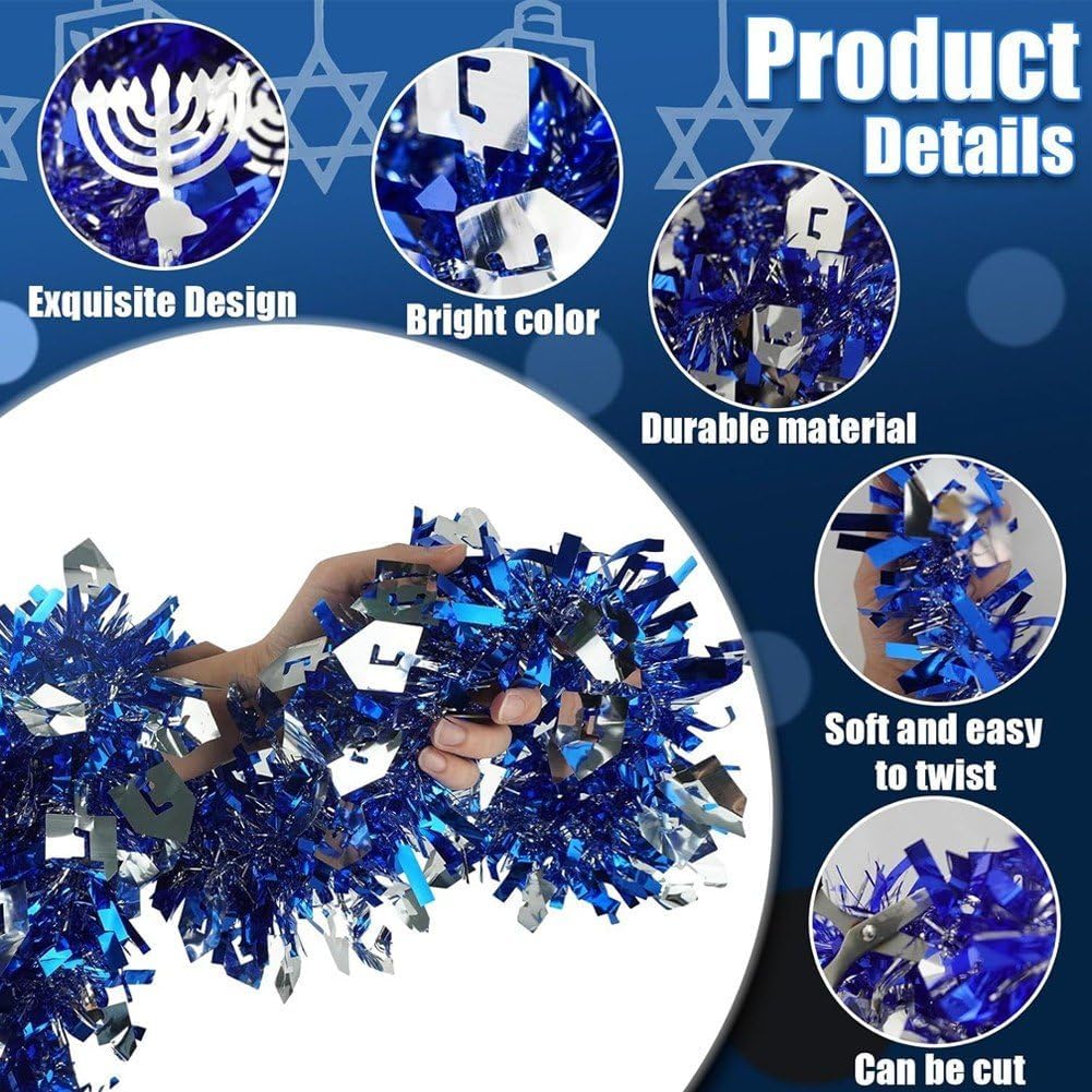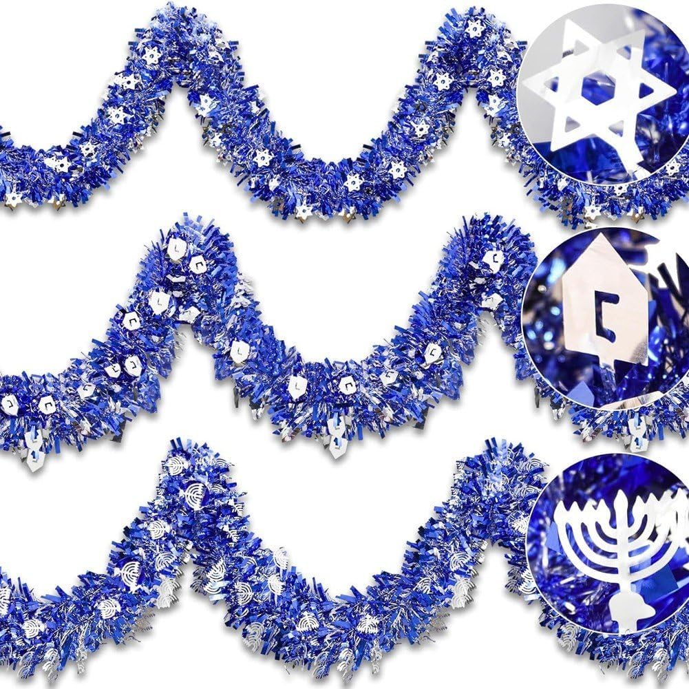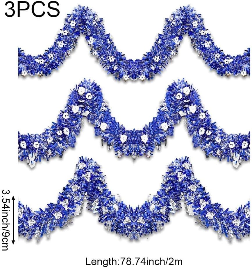 DESIGN INNOVATIVO: confezione totale da 3 ghirlande blu di Hanukkah che includono la stella di David, menorah e ritagli a forma di dreidel, nonché orpelli sottili e spessi per farli sembrare stratificati e soffici, lucenti e scintillanti. Materiale e dimensioni: realizzata in filo morbido e plastica, ogni ghirlanda ha le stesse dimensioni. La lunghezza e lo spessore sono sufficienti per soddisfare le esigenze di decorazione della casa di Hanukkah. Ampie applicazioni: gli streamer metallici di Hanukkah non sono adatti solo per la decorazione interna ed esterna della casa, puoi anche appenderli all'albero di Natale di Hanukkah, decorare ringhiere delle scale, telai di porte, pareti, finestre, portici, recinzioni, feste di Hanukkah e altro ancora. Decorazioni natalizie: la ghirlanda di Hanukkah in blu e argento evoca ricordi della storia di Hanukkah, affascinerà i tuoi ospiti e diventerà una parte preziosa delle tue celebrazioni di Hanukkah, creando ricordi duraturi per gli anni a venire. Realizzazione fai-da-te: ghirlanda di Hanukkah flessibile e versatile, facile da appendere e regolare. Puoi tagliarli a qualsiasi lunghezza e girarli nella tua forma preferita per abbinarli alla decorazione della tua casa, creando una vacanza potente!