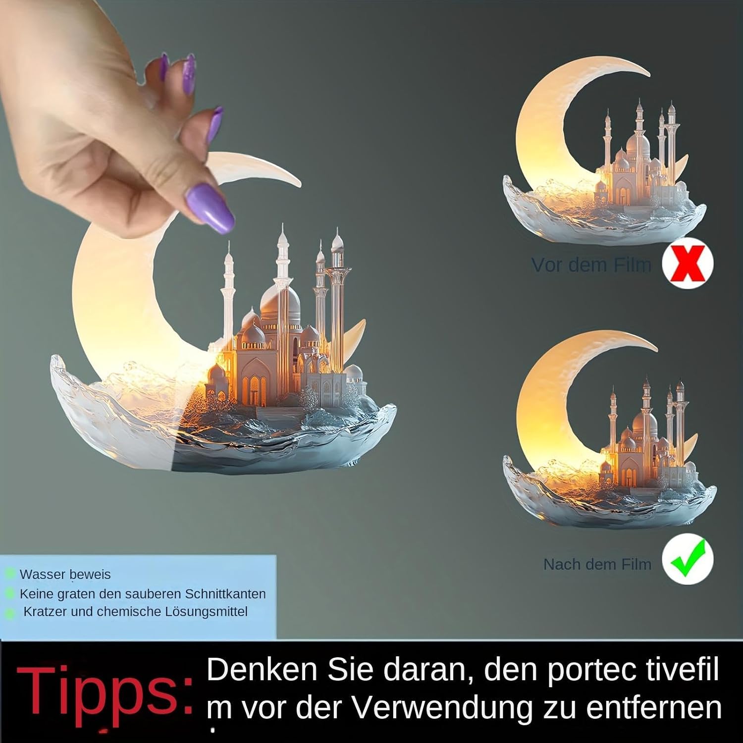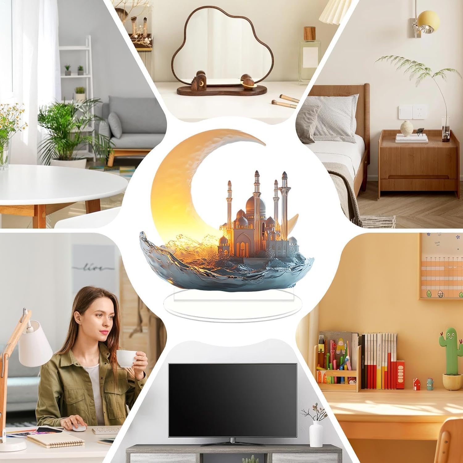 Design bohémien: porta un tocco di esotico stile bohémien alla tua casa con queste decorazioni Eid. Progettate con motivi unici e colori vivaci, queste decorazioni aggiungono un tocco artistico che trasformerà il tuo spazio in un incantevole paese delle meraviglie. Aggiunta squisita: immergiti nello spirito tranquillo dell'Eid con questa squisita decorazione ispirata alla luna. Il suo design dalla forma elegante e i dettagli intricati catturano la natura della luna e migliorano l'atmosfera festosa con un'atmosfera tranquilla. Artigianato squisito: aggiungi un tocco elegante alla tua celebrazione dell'Eid con le nostre decorazioni da tavola accuratamente realizzate a mano. Con linee morbide e motivi chiari, la nostra pregevole fattura migliora la tua tavola festiva. Aumenta la tua celebrazione: queste decorazioni Eid sono appositamente progettate per creare una forte atmosfera festosa. Miglioreranno qualsiasi tavola e aggiungeranno uno splendido tocco festivo. Ampia gamma di applicazioni: evidenzia le tue celebrazioni Eid con queste eleganti decorazioni, versatili per soggiorni, camere da letto e scrivanie, creando un'atmosfera deliziosa e allegra