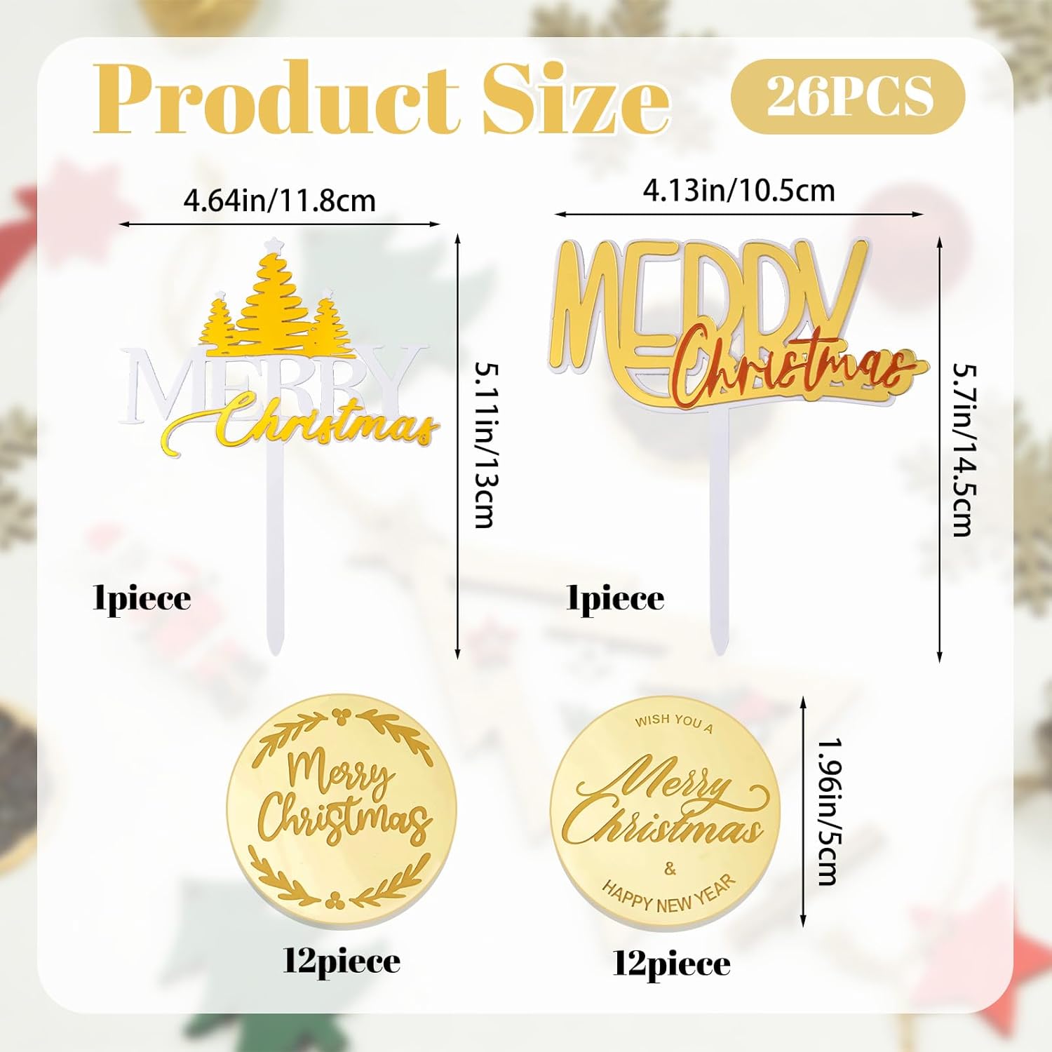 Contenuto della confezione: riceverai 26 decorazioni per torta in acrilico dorato Merry Christmas. La quantità sufficiente e il design interessante possono soddisfare le vostre esigenze di arredamento, la dimensione dei grandi topper per torta misura 10 cm x 14,5 cm e 11,8 cm x 13 cm, il diametro del piccolo topper rotondo per torta è di 5 cm. Rivestimento superficiale: al fine di garantire che il prodotto sia in buone condizioni quando viene consegnato, entrambi i lati del prodotto sono coperti con pellicola di plastica. Si prega di staccare la pellicola di plastica quando lo si utilizza, in modo che il prodotto sia più accattivante e rendere la torta più bella. Materiale di qualità: questo prodotto è realizzato in materiale acrilico a specchio atossico e inodore, che può decorare in modo sicuro torte. Leggero, facile da trasportare e riporre. Facile da pulire, riutilizzabile e può essere lavato con acqua. Ampia applicazione: questi affascinanti topper per torte a tema natalizio sono il tocco finale perfetto per tutti i tuoi dessert festivi! Sia che tu stia decorando una torta a strati festiva, adorabili cupcake, gelato cremoso o anche biscotti, budini o cioccolata calda, questi deliziosi topper aggiungono istantaneamente un'atmosfera di vacanza felice. Nota: questo non è commestibile ed è solo per scopi decorativi, si prega di non utilizzare in forno o microonde. Si prega di staccare la pellicola protettiva sul topper in acrilico prima dell'uso.