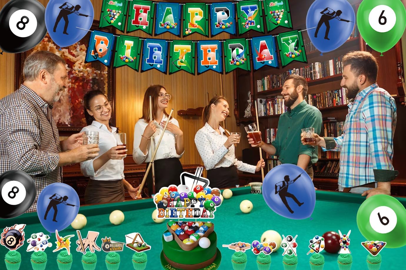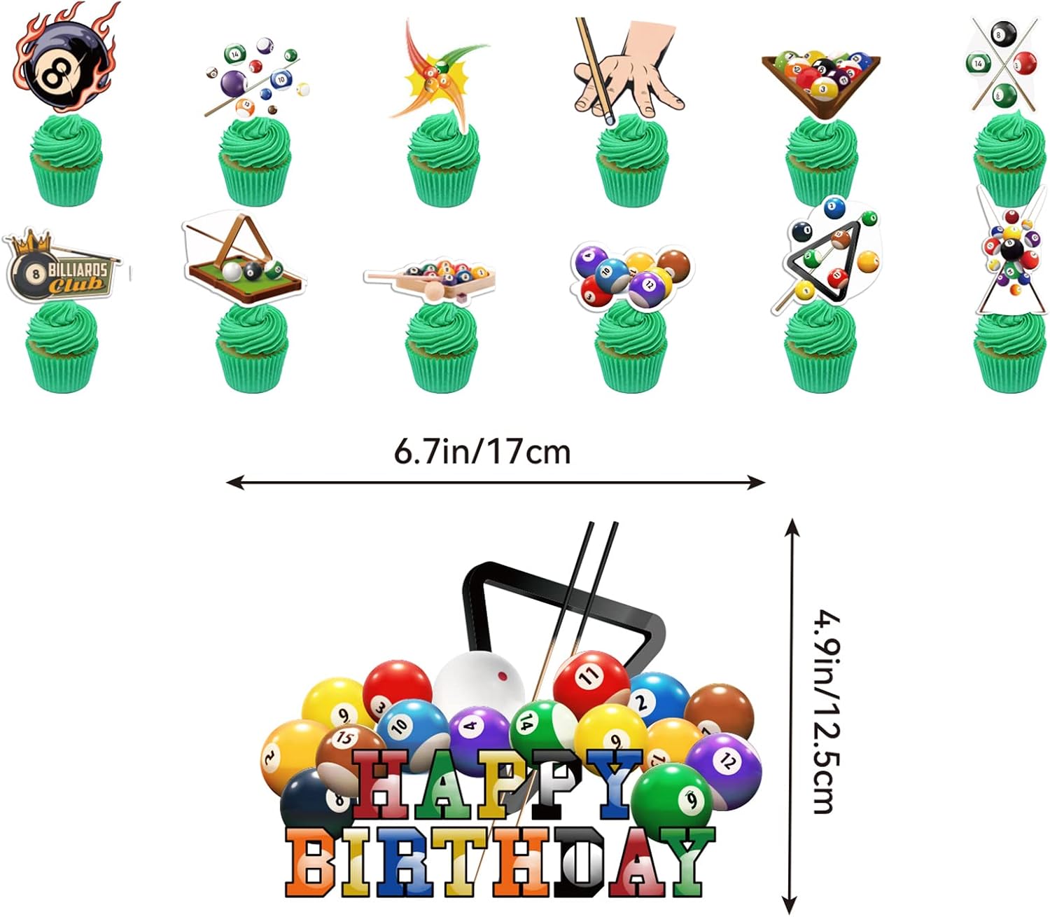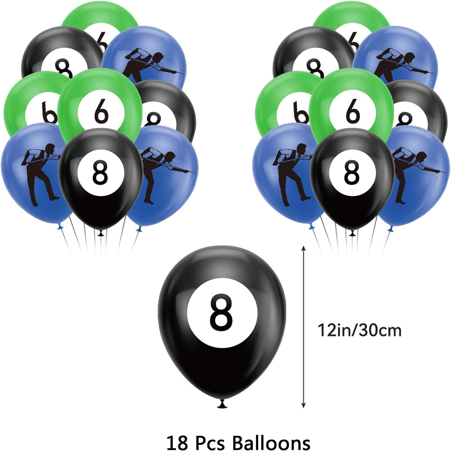 Decorazione per feste da biliardo: la confezione include 1 striscione di buon compleanno da biliardo, 1 topper per torta di buon compleanno da biliardo, 12 toppers per cupcake da biliardo, 18 palloncini da biliardo. Sarà una fantastica festa da biliardo. Materiale: striscioni di compleanno da biliardo e toppers per torta sono realizzati in cartone resistente, i palloncini sono in lattice naturale. Poiché i palloncini sono di nuova produzione e hanno un odore di lattice unico, saranno molto migliori se posizionati in un luogo ventilato per 1-2 giorni. Design perfetto: l'intera festa è progettata con il tema del biliardo. Le forme da biliardo in diversi colori e forme rendono la tua festa più innovativa, attirano rapidamente l'attenzione e lasciano un'impressione bella e profonda sulla famiglia e sugli amici che partecipano alla festa. Facile da decorare: gli striscioni di compleanno da biliardo sono preassemblati e non richiedono tempo. Basta estrarli dalla confezione e appenderli al soffitto, alle pareti, alle finestre, alle porte, ai rami e ad altri luoghi che desideri decorare. Quindi gonfia i palloncini e decorali nella scena della tua festa, crea un'atmosfera felice apprezzata da adulti e bambini. Occasioni: perfette per oggetti di scena per feste di biliardo, decorazioni per feste di compleanno di biliardo, feste di compleanno di biliardo, feste a tema di biliardo, feste sportive, feste di amici e altre feste di felicità.
