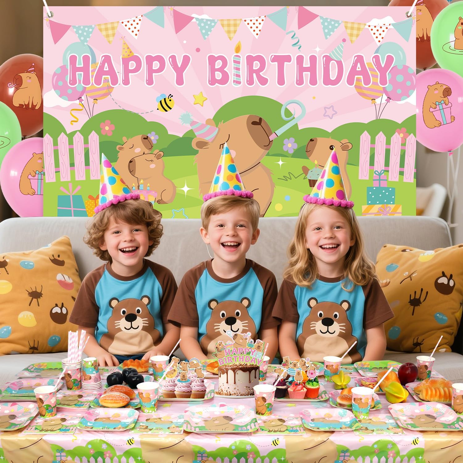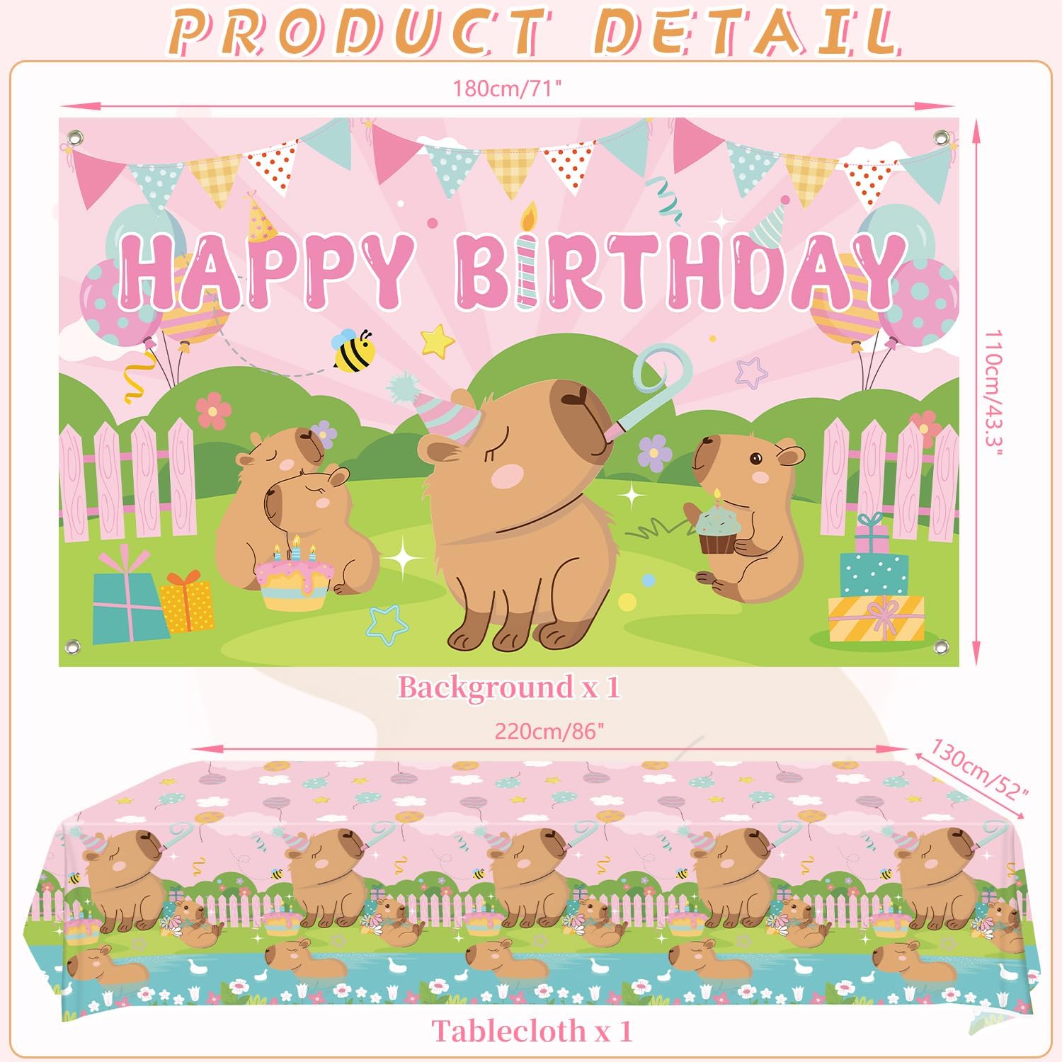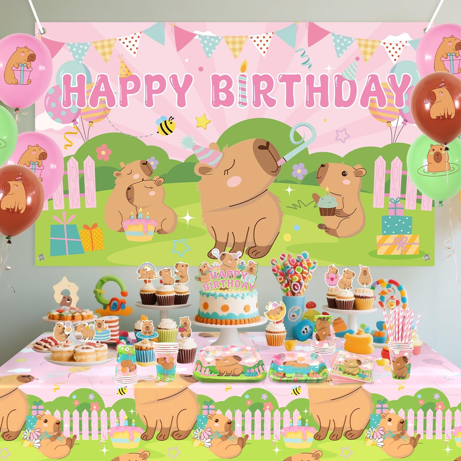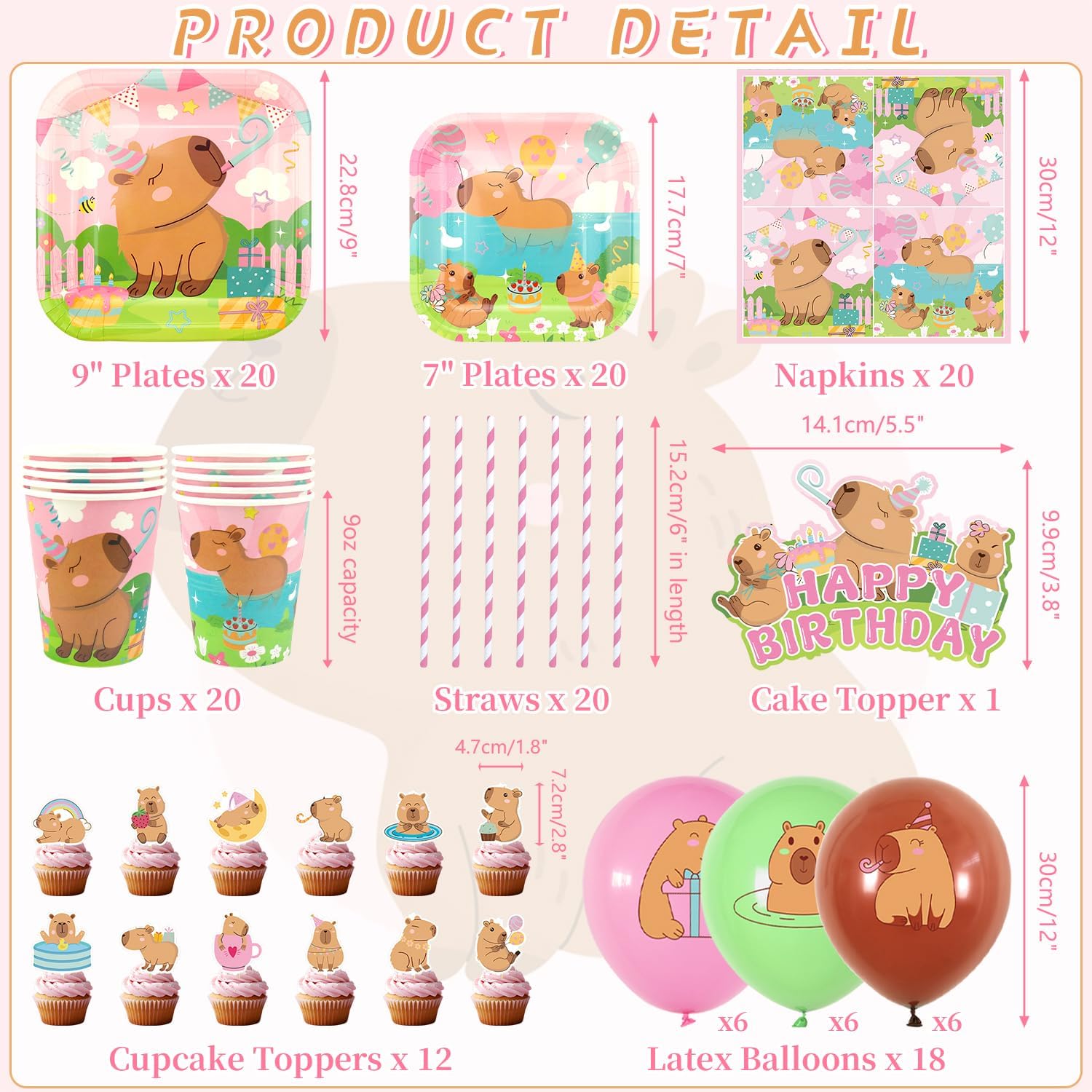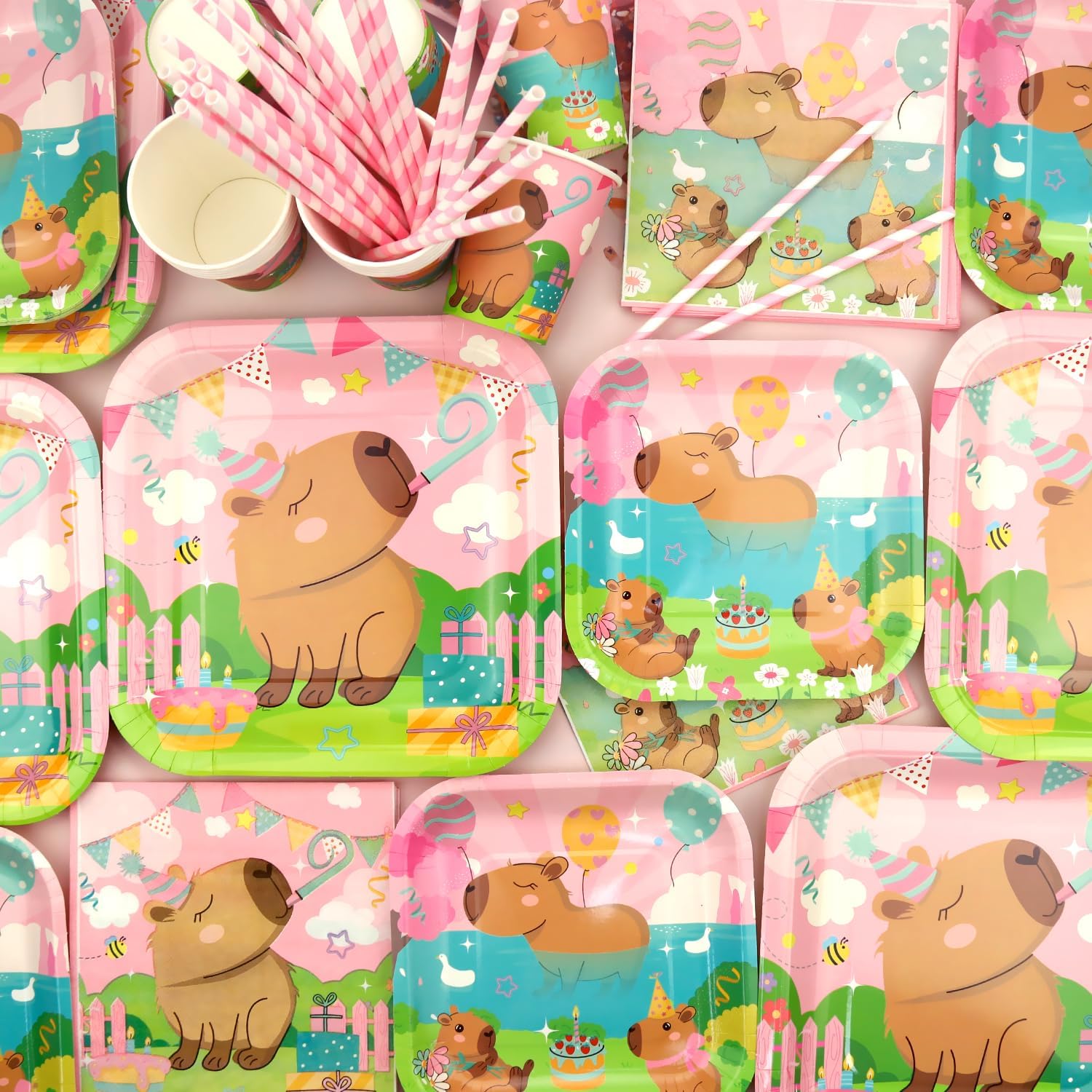Set di forniture per feste rosa Capybara: riceverai 1 sfondo di buon compleanno, 1 grande decorazione per torte, 12 topper per cupcake, 18 palloncini stampati, 20 piatti da 22,9 cm, 20 piatti da 17,8 cm, 20 tazze, 20 tovaglioli, 20 cannucce, 1 tovaglia. Design a tema Capybara: il design carino e unico dell'elemento capibara rende la tua festa più attraente, l'abbinamento dei colori vivaci può aggiungere atmosfera di festa e fare una profonda impressione! Alta qualità: lo sfondo a tema Capybara Happy Birthday è realizzato in tessuto, morbido, leggero e resistente, le stoviglie per piatti capibara sono realizzate in cartone spesso riciclabile, non facile da piegare. Le tovaglie sono impermeabili e non facili da strappare, in modo che tu e la tua famiglia possiate godervi la festa con più tranquillità. Facile da usare: il set contiene tutti gli accessori necessari per la festa. Può aiutarti a organizzare facilmente la festa. Dopo che la festa è finita, è possibile utilizzare la tovaglia per imballarla e gettarla nel bidone della spazzatura, molto facile da pulire. Ampiamente usato: le decorazioni per feste Capybara sono adatte per feste di compleanno per ragazze, baby shower, feste al parco, picnic, aziendali e così via.
