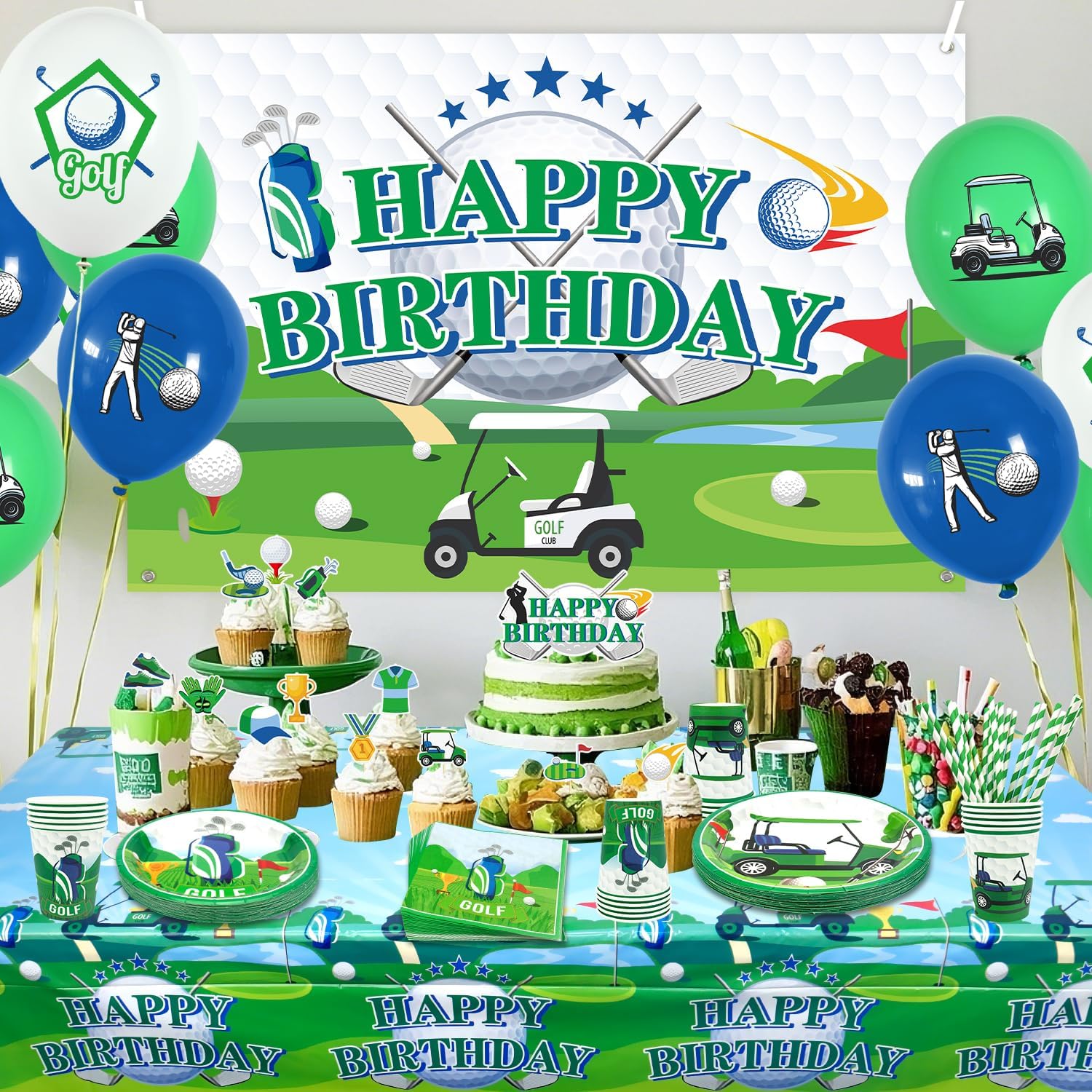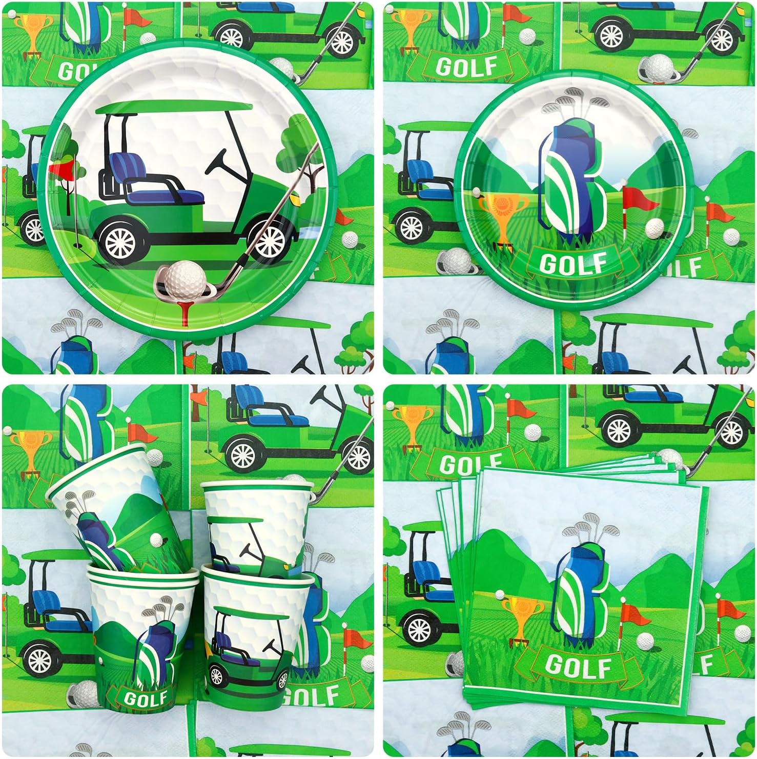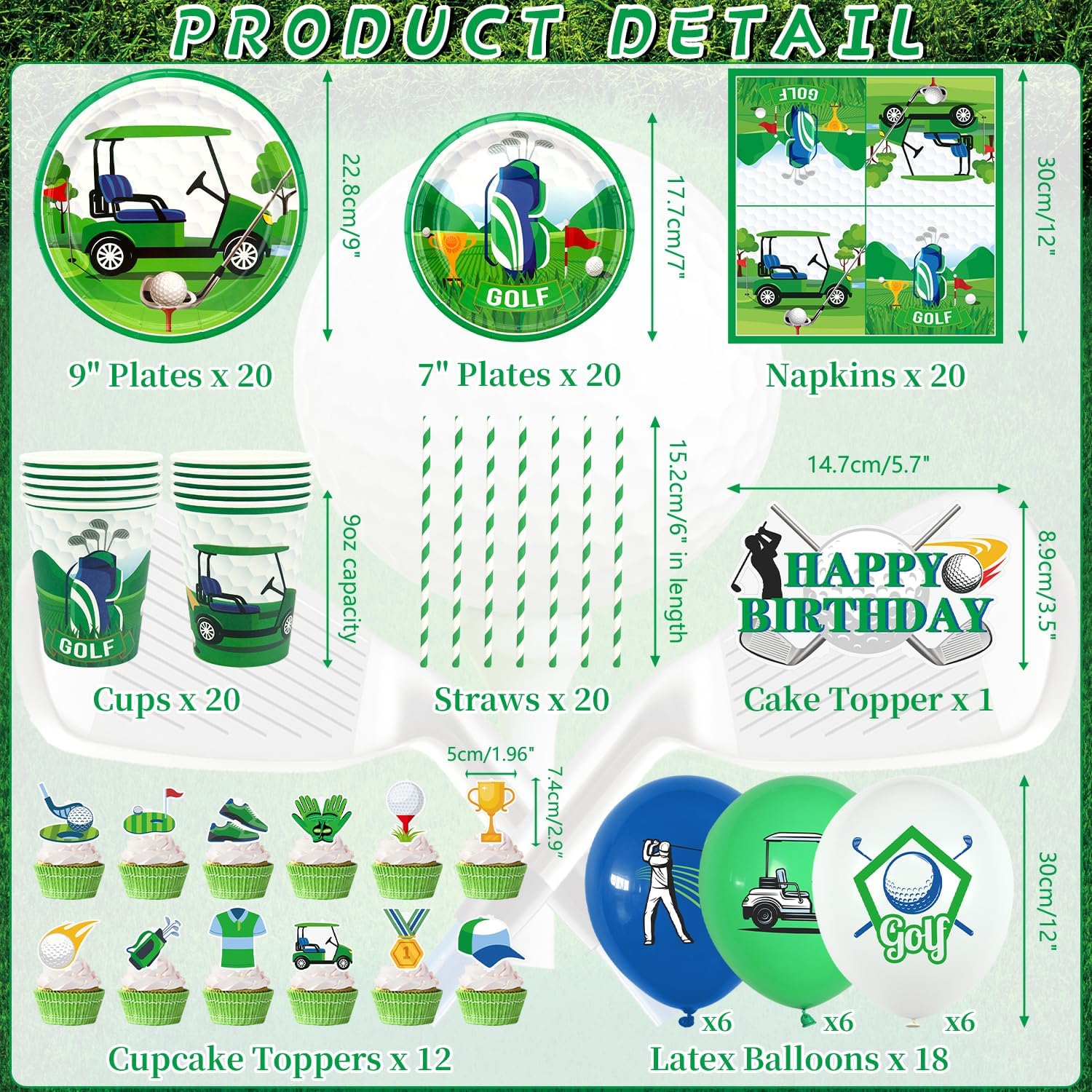 Set di forniture per feste da golf: riceverai 1 sfondo di buon compleanno, 1 grande decorazione per torte, 12 topper per cupcake, 18 palloncini stampati, 20 piatti da 22,9 cm, 20 piatti da 17,8 cm, 20 tazze, 20 tovaglioli, 20 cannucce, 1 tovaglia Design a tema golf: il design carino e unico dell'elemento da golf rende la tua festa più attraente, l'abbinamento dei colori vivaci può aggiungere atmosfera di festa e fare una profonda impressione! Alta qualità: lo sfondo a tema golf Happy Birthday è realizzato in tessuto, morbido, leggero e resistente, le stoviglie sono realizzate in cartone spesso riciclabile, non facile da piegare. Le tovaglie sono impermeabili e non facili da strappare, in modo che tu e la tua famiglia possiate godervi la festa con più tranquillità. Facile da usare: il set contiene tutti gli accessori necessari per la festa. Può aiutarti a organizzare facilmente la festa. Dopo che la festa è finita, è possibile utilizzare la tovaglia per imballarla e gettarla nel bidone della spazzatura, molto facile da pulire. Ampiamente usato: le decorazioni per feste di golf sono adatte per feste di compleanno di ragazzi e ragazze, baby shower, feste al parco, picnic, aziendali e così via.