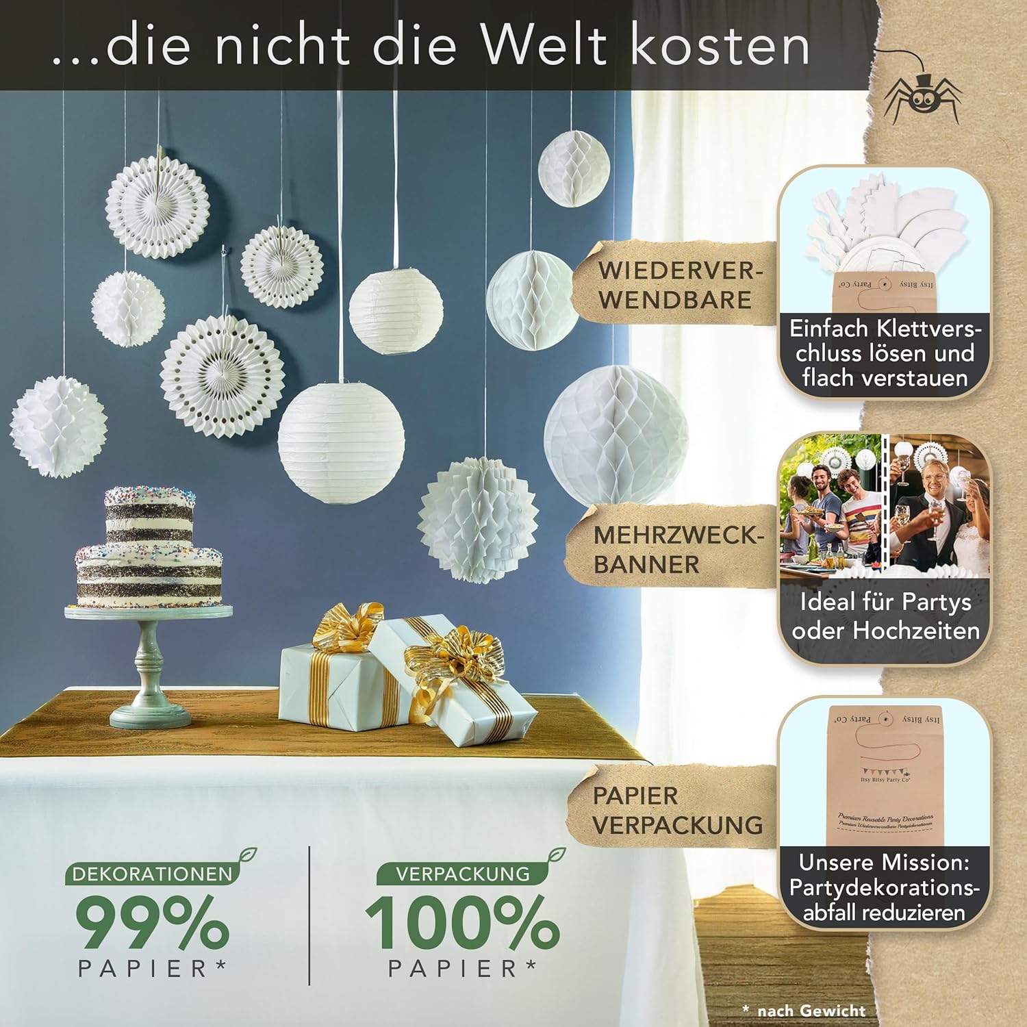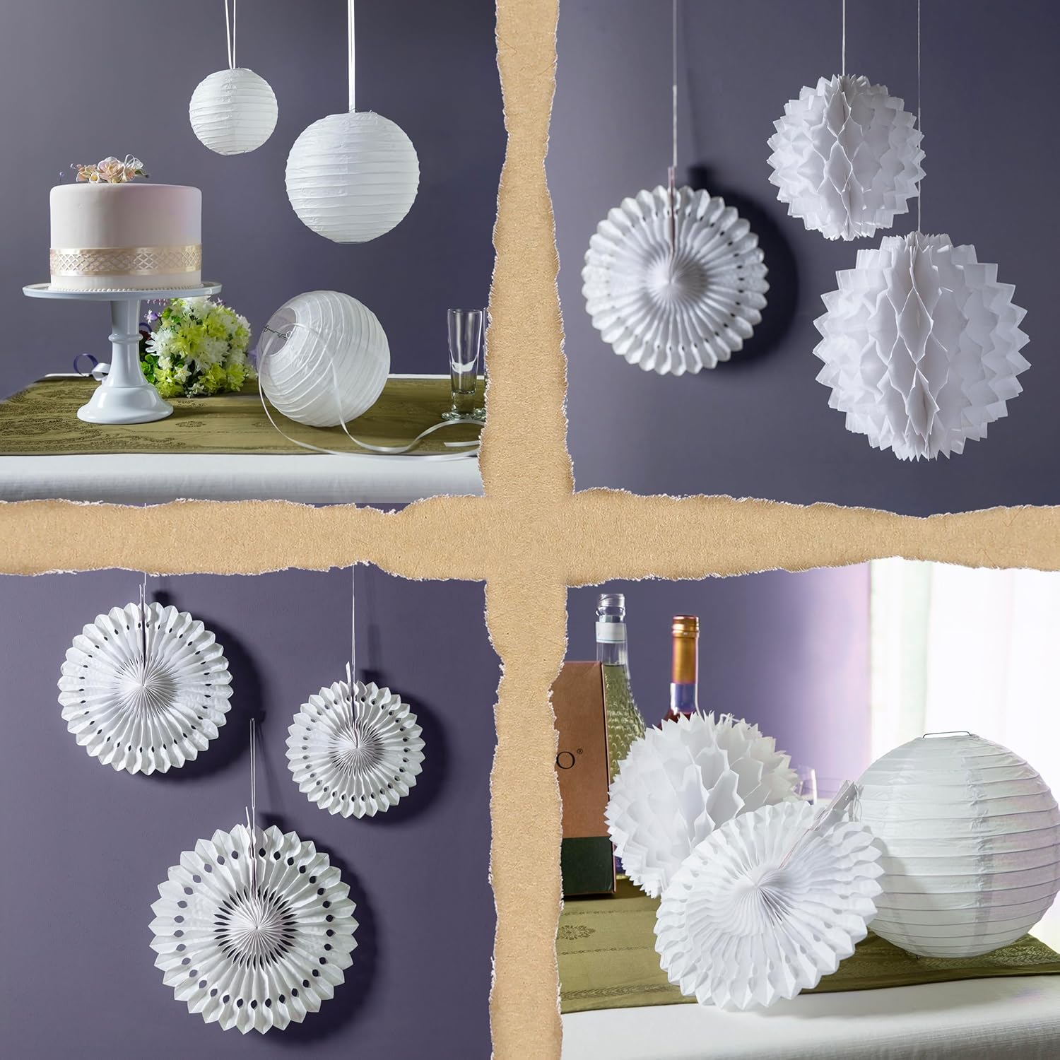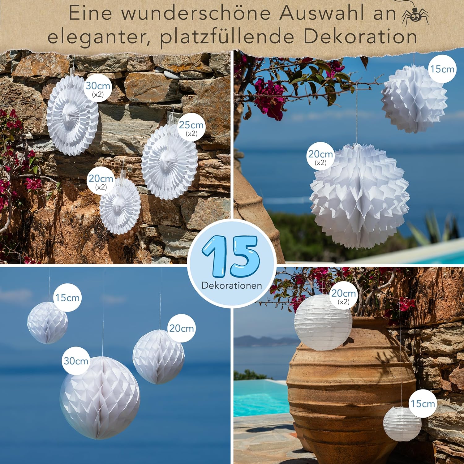 Decorazione bianca per feste: aggiungi uno splendido sfondo al tuo matrimonio o festa. Grazie alla chiusura in velcro, l'intero set di decorazioni in carta può essere assemblato in pochi minuti ed è facilmente riutilizzabile. Altri marchi richiedono un assemblaggio complicato e utilizzano nastro usa e getta. Preparati a stupire i tuoi ospiti e a creare ricordi duraturi con il nostro versatile set di decorazioni per le feste. Riutilizzabile e incredibilmente versatile: eleva la tua festa con le nostre decorazioni eleganti e riutilizzabili. Perfette per ogni occasione, queste decorazioni chic aggiungeranno un tocco di eleganza al tuo spazio anno dopo anno. Progettato per comodità, facile da riporre e occupa uno spazio minimo. Per la tua occasione speciale: queste decorazioni bianche per donne, ragazze, uomini e ragazzi sono perfette come decorazioni per compleanni, decorazioni per feste in giardino, decorazioni per feste di fidanzamento, decorazioni per ricevimenti di nozze o decorazioni per il tè pomeridiano. Niente plastica nella confezione... MAI! - Altre marche hanno ogni decorazione confezionata singolarmente. Queste sono fino a 16 parti in plastica per il cestino. La nostra missione è ridurre i rifiuti nelle discariche. Fatti: le nostre decorazioni per feste riutilizzabili di alta qualità sono progettate nel Regno Unito. Qualità e sostenibilità sono al centro di tutto ciò che facciamo. Questo pacchetto include: 6 ventagli di carta a nido d'ape, 3 palline a nido d'ape, 3 fiori di carta a nido d'ape e 3 lanterne di carta di diverse dimensioni da 15 a 30 cm.