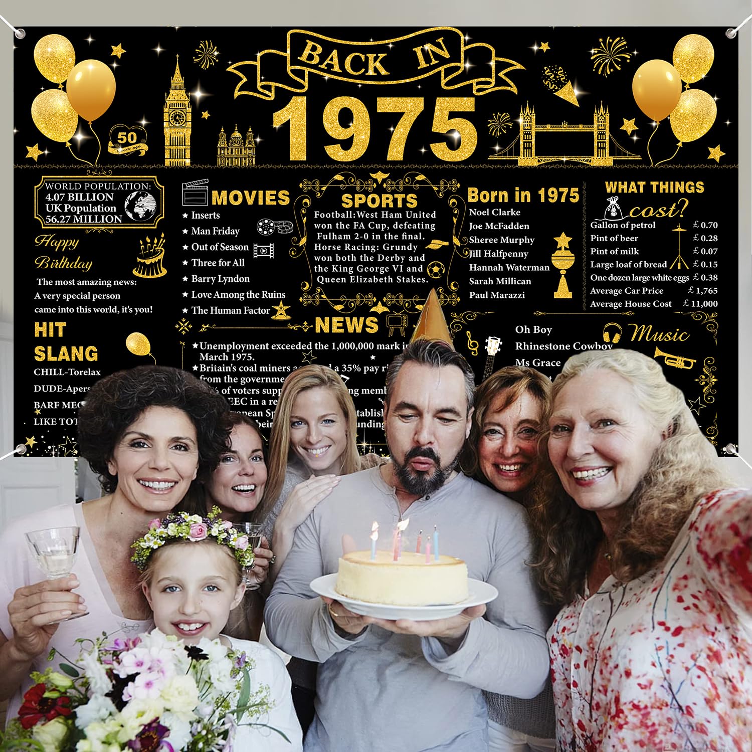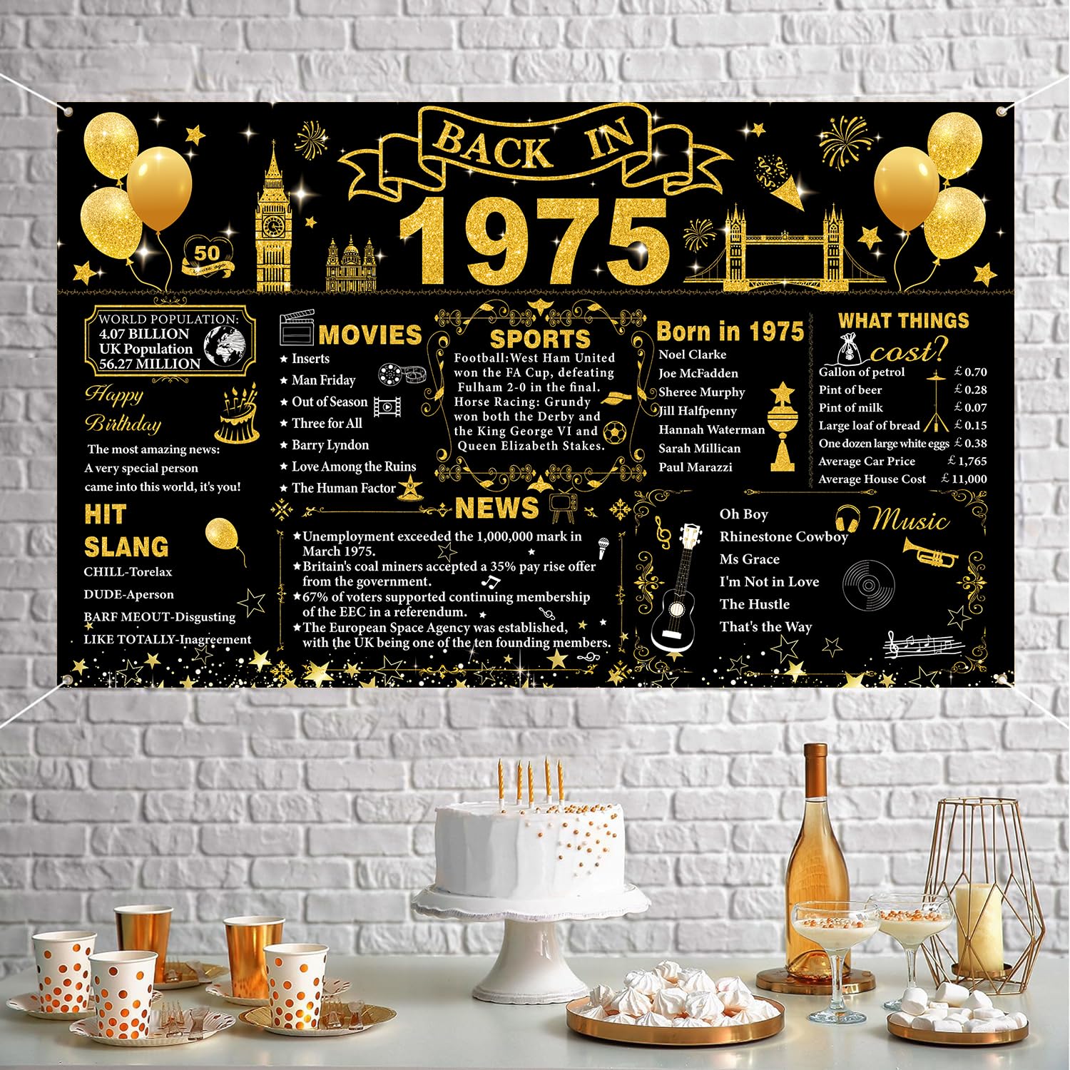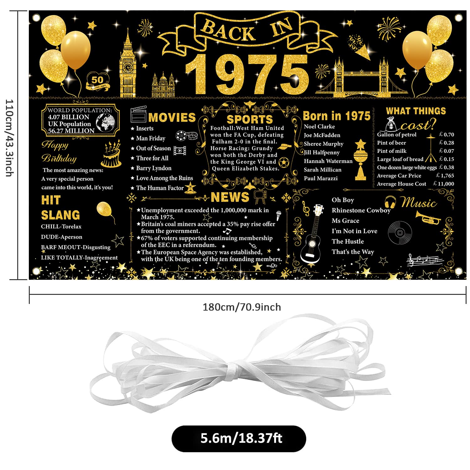 Tema del 1975: lo striscione grande del 1975 è squisitamente progettato con interessanti elementi a tema di compleanno e testo storico chiaro con motivi squisiti, in nero brillante e oro, con caratteri accattivanti, per un piacevole divertimento visivo. Decorazioni per il 50° compleanno: lo striscione per il 50° compleanno misura 180 x 110 cm. È abbastanza grande per la tua festa di 50° compleanno. Questo banner di compleanno può aggiungere più divertimento a te, al tuo amante, alla famiglia e agli amici. Materiali di alta qualità: questo banner per sfondo Back in 1975 è realizzato in tessuto di poliestere, pieghevole e può durare a lungo. Facile da usare: lo striscione per 50 anni con corda, basta attaccarlo attraverso 4 fori agli angoli e appenderlo alla parete, alla cabina fotografica o alla recinzione. Ampia applicazione: il poster del Regno Unito del 1975 può essere applicato come sfondo fotografico per feste di 50° compleanno, decorazione da parete, decorazione per la casa, decorazione da tavolo per torte, fotografia in studio fotografico e molto altro ancora. Usali per creare l'evento memorabile e aumentare un'atmosfera felice per i tuoi amici e familiari, questo sarà un modo perfetto per scattare foto a una festa.