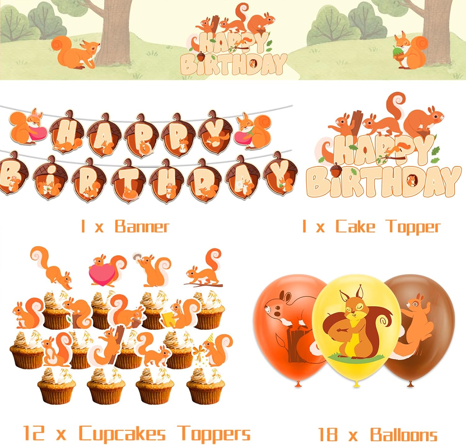 Forniture per feste scoiattolo: la confezione include 1 set di striscioni di buon compleanno scoiattolo, 1 topper per torta di buon compleanno scoiattolo, 12 toppers cupcake scoiattolo, 18 palloncini scoiattolo, 1 nastro. Quantità sufficiente per soddisfare le tue esigenze di decorazione. Materiale: il topper per torta con striscione di compleanno scoiattolo e il topper per cupcake sono realizzati in cartone, i palloncini scoiattolo sono in lattice naturale. Tutti i materiali sono sicuri ed ecologici, durevoli, non facili da piegare e strappare, possono essere utilizzati a lungo. Design unico: il design della festa dello scoiattolo è unico, con motivi squisiti e stampa di alta qualità, che rendono la decorazione della festa dello scoiattolo più realistica e semplice per attirare l'attenzione degli altri e lasciare un ricordo bello e indimenticabile. Facile da decorare: il nostro striscione di compleanno scoiattolo è preassemblato, basta rimuoverlo dalla confezione e appenderlo a finestre, soffitti, pareti, porte, rami e altri luoghi che desideri decorare. Gonfia il palloncino alla dimensione adeguata e decoralo nella scena della festa degli scoiattoli per completare la decorazione che è molto semplice. Decorazioni per feste con scoiattoli: le nostre decorazioni per feste con scoiattoli sono la scelta perfetta per feste di compleanno di scoiattoli, feste a tema scoiattoli, feste con animali del bosco, baby shower, feste allo zoo, feste di compleanno e collezioni di amici e altre attività allegre. L'esclusivo design a forma di scoiattolo attira più attenzione e rende la tua festa più popolare.