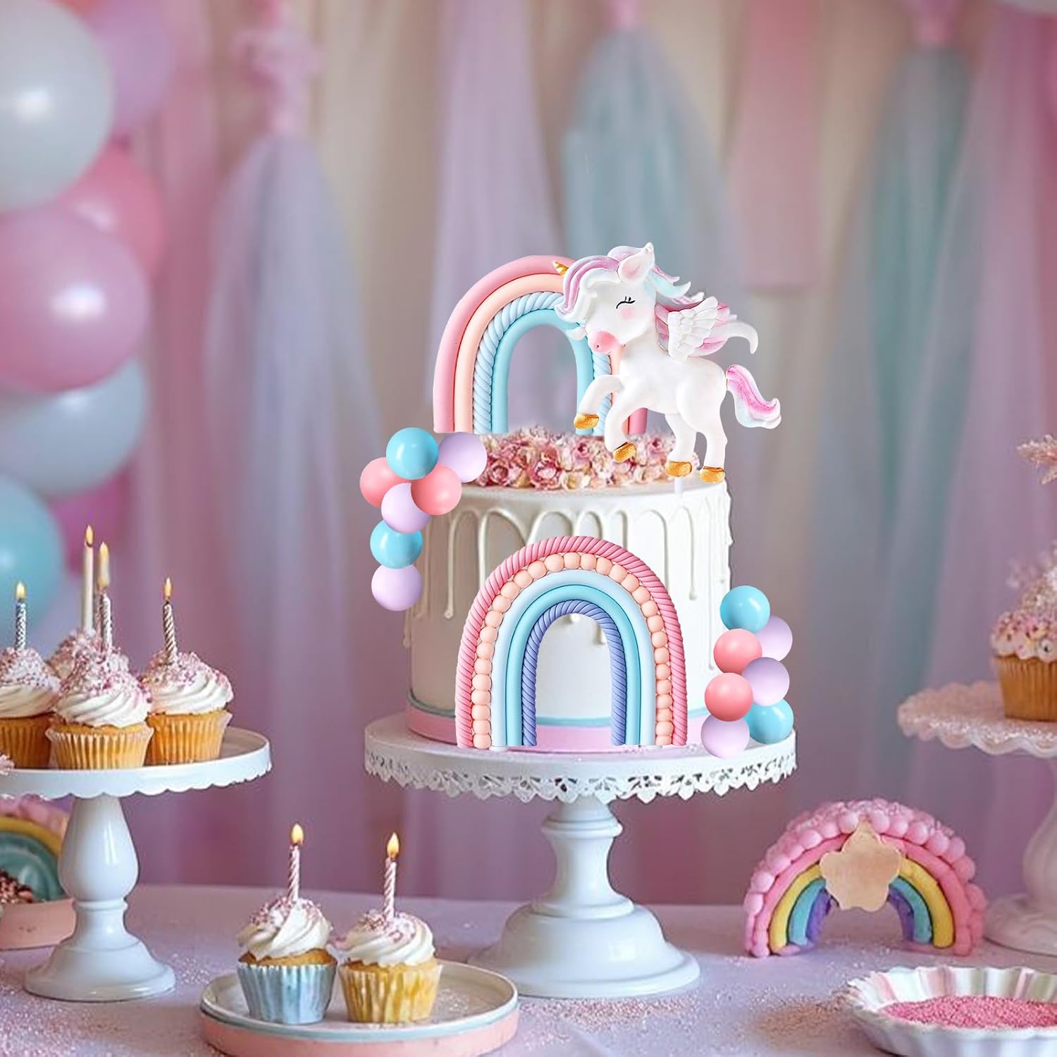 🦄【Contenuto della confezione】Riceverai 1 toppers per torta unicorno, 2 toppers per torta arcobaleno, 5 palline viola chiaro da 1 pollice, 5 palline rosa da 1 pollice, 5 palline blu da 1 pollice. Abbastanza per soddisfare tutte le tue esigenze di decorazione. 🦄【Atmosfera da sogno】Il design del topper per torta con unicorno trasuda divertimento infantile. La combinazione di toni tenui e forme giocose crea un'atmosfera di festa romantica e fantasiosa, rendendo ogni celebrazione unica. 🦄 【Materiali di alta qualità】 Il cake topper è realizzato con materiali di alta qualità con colori duraturi, non sbiadisce, non si rompe né si deforma. Durevole, riutilizzabile e facile da riporre. 🦄【Versatile】Questo kit per decorare torte è adatto a varie occasioni, come feste a tema unicorno, feste arcobaleno, feste per ragazze, feste per bambini, attività scolastiche, ecc., e garantisce gioia e divertimento. 🦄【Facile da usare】Non sono necessari strumenti o passaggi complicati. Posiziona semplicemente le decorazioni dell'unicorno, dell'arcobaleno e della pallina direttamente sulla torta. Decora velocemente e facilmente secondo i tuoi desideri e bisogni.