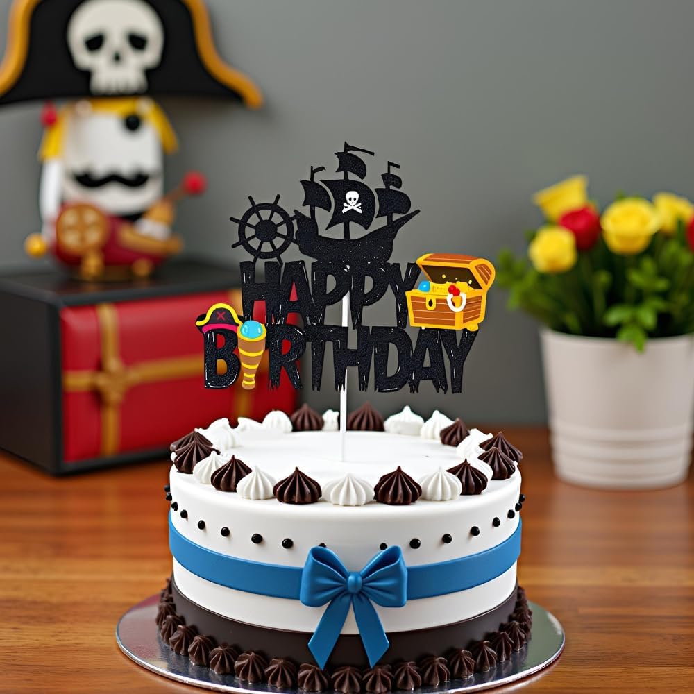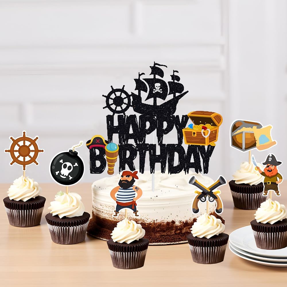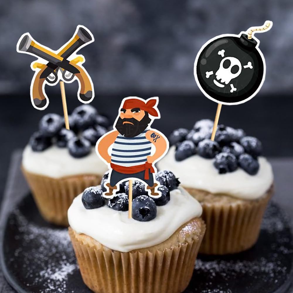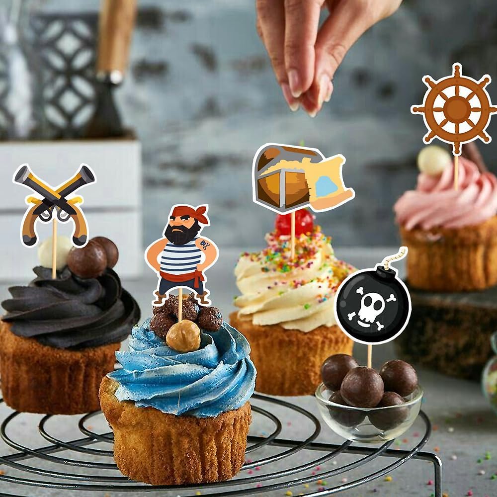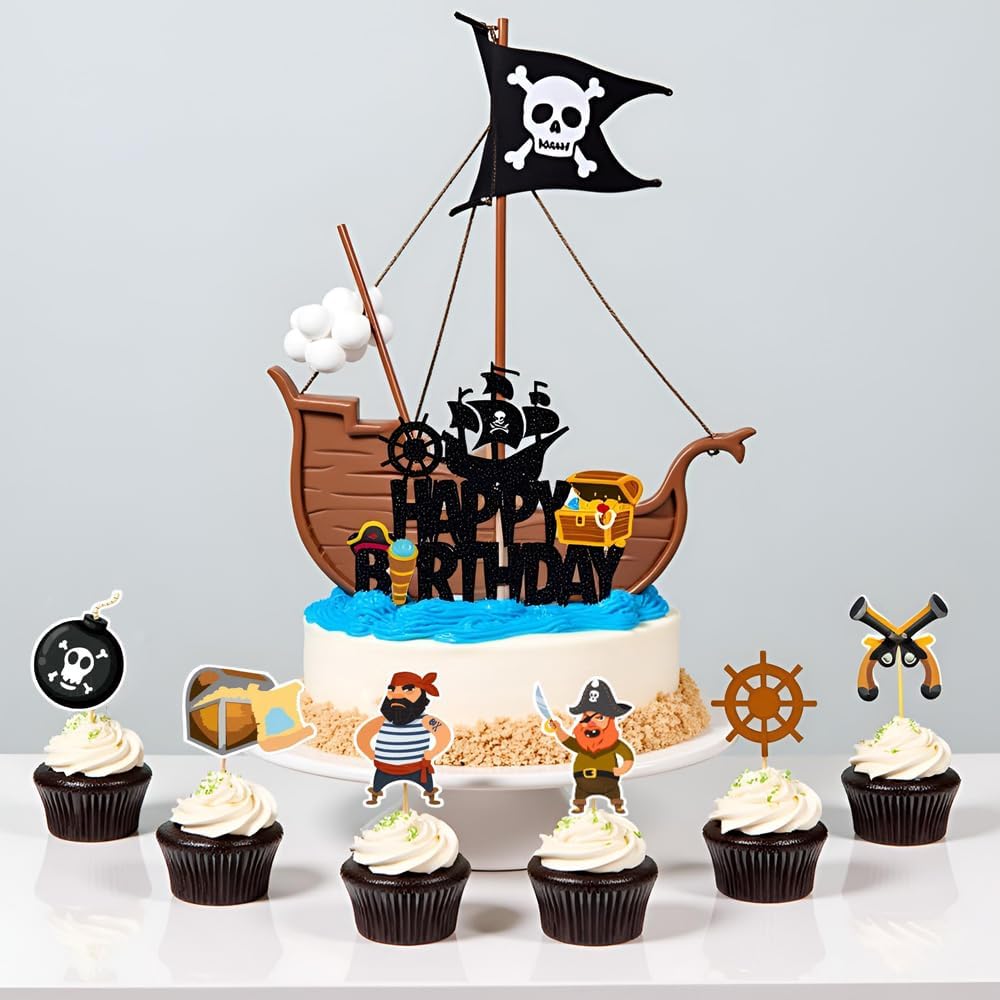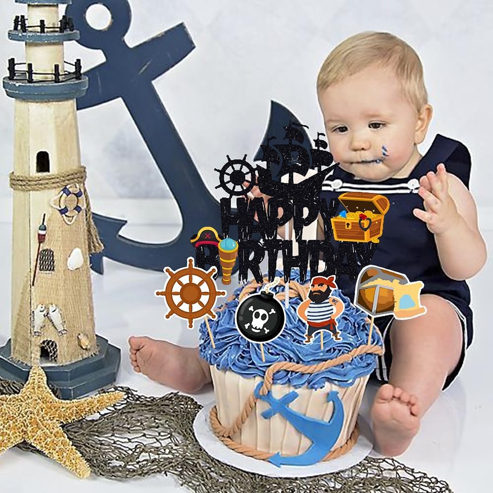 Tema pirati --- Il cake topper dei pirati è progettato per feste a tema pirati. Molto vivaci e carini, stimolano la fantasia dei bambini. Sono perfetti per feste di compleanno dei pirati, baby shower pirata o decorazioni per la cameretta dei bambini. Materiale di alta qualità --- Questi toppers per torta a tema pirata sono realizzati in carta ecologica e sono adatti per decorare torte o dessert. Sono belli, resistenti e facili da usare. Personalizza la decorazione della tua torta --- Puoi regolare la profondità di inserimento nella superficie della torta per adattarla alla decorazione di torte, dessert o altri pasticcini per rendere unica la tua torta. Contenuto della confezione --- Riceverai 7 piatti da torta, incluso 1 piatto da torta pirata con "Happy Birthday" e 6 piccoli piatti da torta. Puoi decorare la tua torta a seconda della situazione. Decorazione per torta di compleanno --- Questo topper per torta pirata è ideale per decorare torte, cupcake, gelati, dessert, tavoli, ecc. Per aggiungere più gioia alla tua festa e creare un'atmosfera molto romantica.