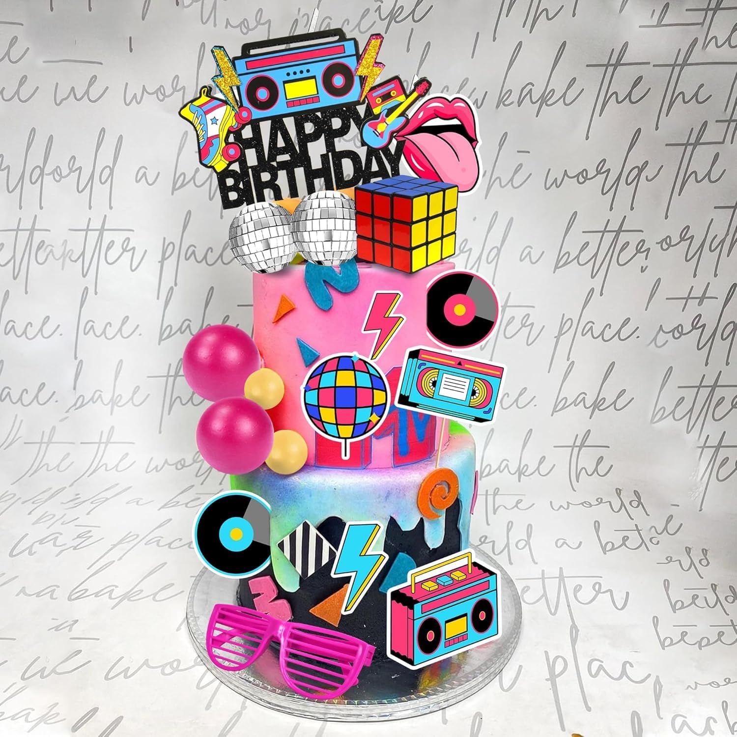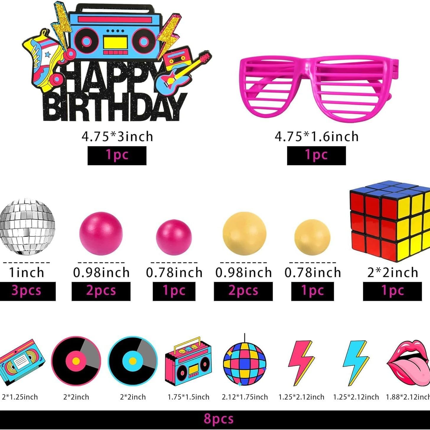🎼DECORAZIONI PER TORTE: 20 decorazioni per torte anni '80 e '90, tra cui 1 topper per torta Happy Birthday, 1 topper per occhiali rosa, 3 palline argentate, 3 palline rosa e 3 palline gialle, 1 mini cubo e 8 (mini nastro, mini disco, mini radio, ecc.) festa a tema molto anni '80 e '90. 👓 MATERIALE ECOLOGICO: questi toppers per torta sono realizzati in cartone. Sono colorati e non commestibili. Queste decorazioni per torte sono facili da montare. Devi solo posizionare il cake topper direttamente sulla torta, molto semplice e conveniente 🎶DESIGN UNICO: Decorazioni uniche per torte degli anni '80 e '90, contenenti ricordi classici e colorati di quell'epoca, renderanno la tua torta un vero e proprio eye-catcher e ti faranno sentire come se fossi tornato agli anni '80 e '90, per un'indimenticabile festa di compleanno con i tuoi amici. 📀FACILE DA USARE: Ogni decorazione per torta viene fornita con uno stuzzicadenti in legno che è molto ecologico e può aiutarti a fissare la torta, il cibo o la frutta, facile da usare. Questi toppers per cupcake devono essere assemblati, basta incollare insieme il bastoncino e il cartone. 🎸MULTIUSO: i toppers per torta anni '80 e '90 possono essere utilizzati non solo per decorazioni di torte di compleanno, ma anche per cupcake, muffin, macedonie e altro ancora. Adatto per feste di compleanno, feste anni '80-'90, feste rock'n'roll, feste di famiglia, per stupire i vostri ospiti.