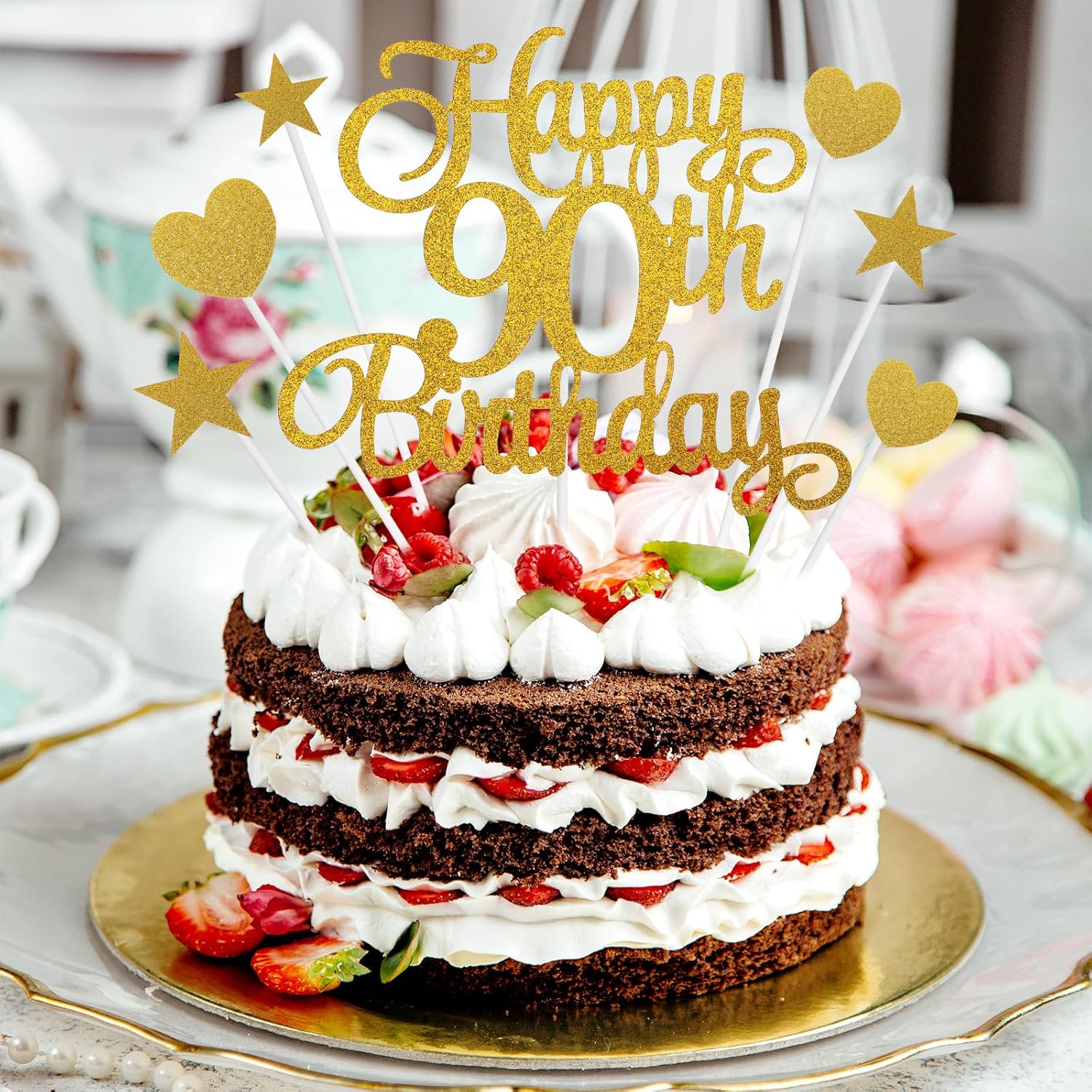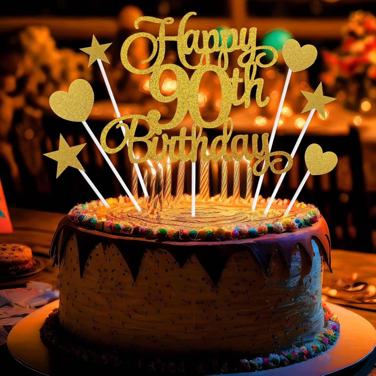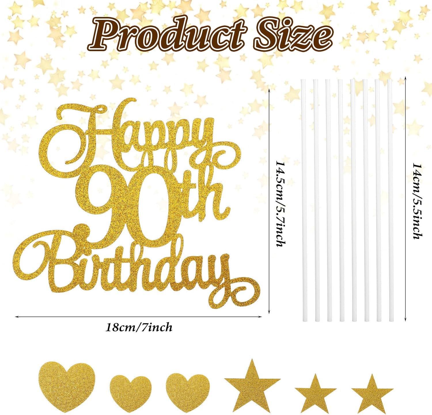 Decorazioni per torte per 90° compleanno, 7 pezzi, personalizzabili, con scritta "Happy 90th Birthday", con stecchini per cupcake a forma di cuore e stella, con glitter dorati, per compleanni e feste
