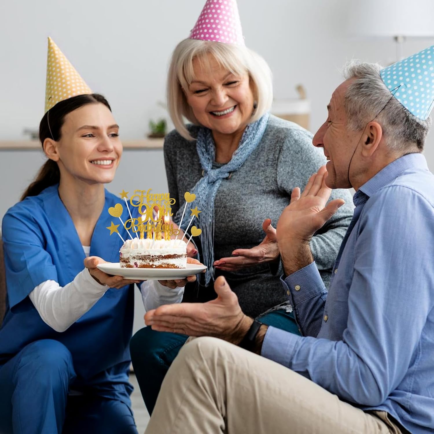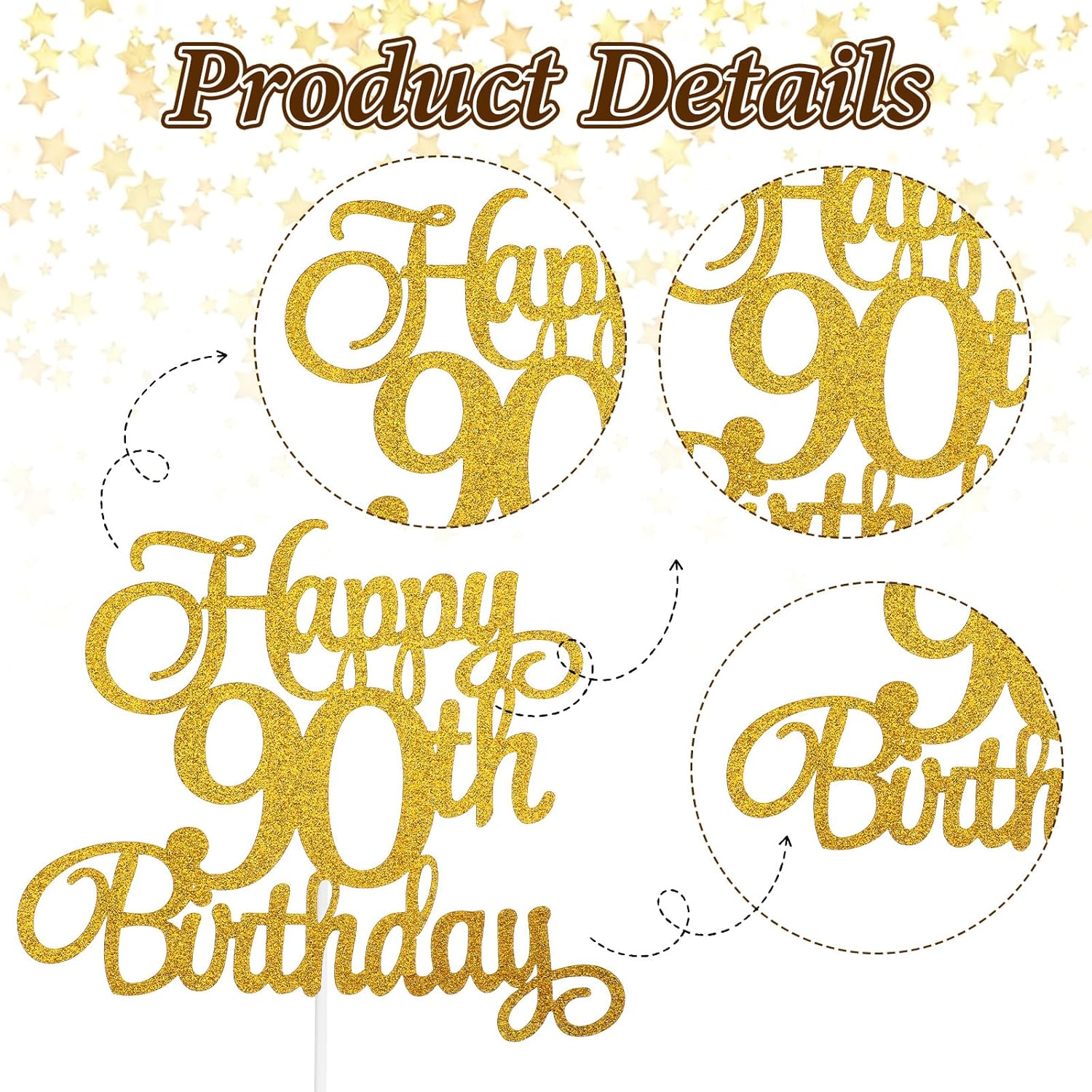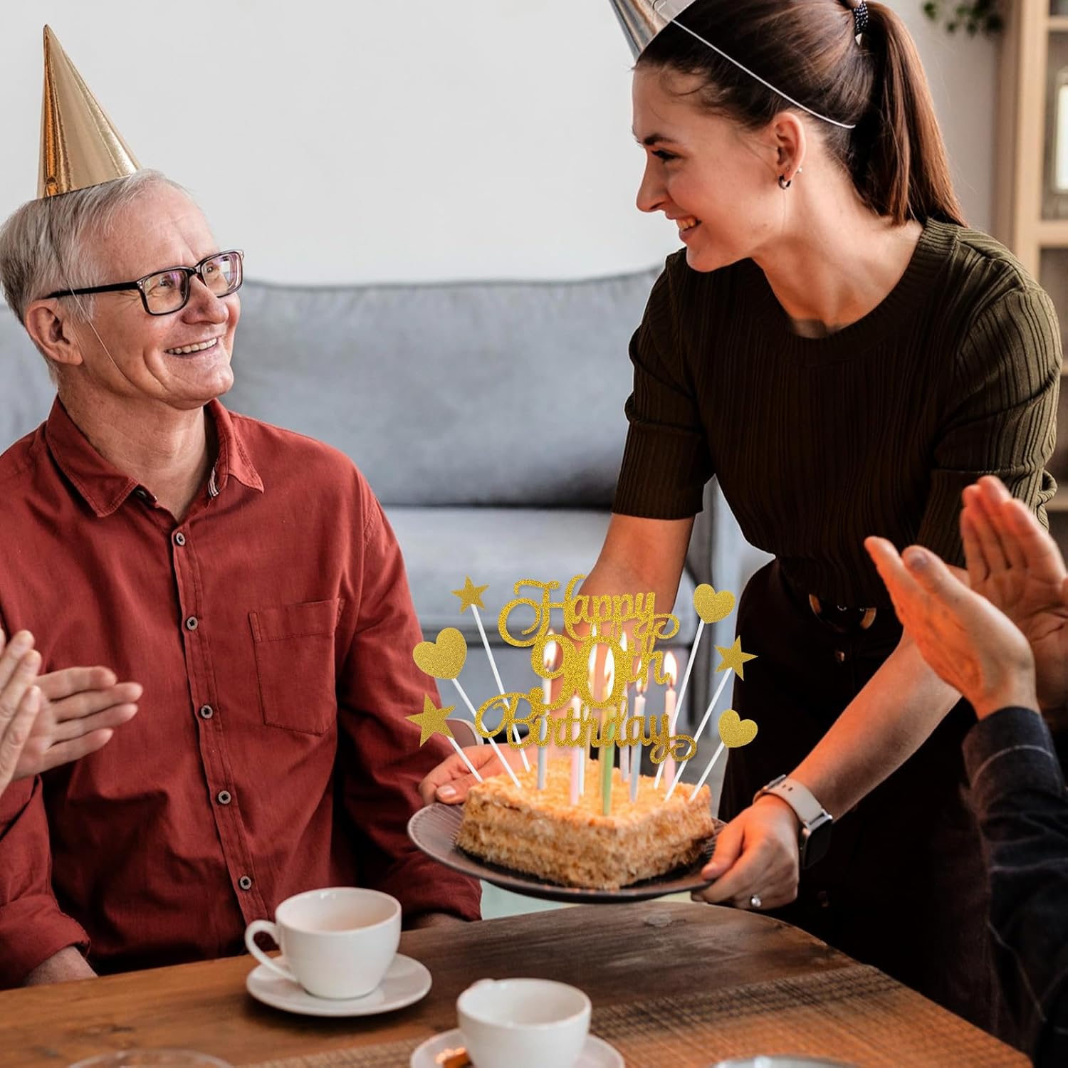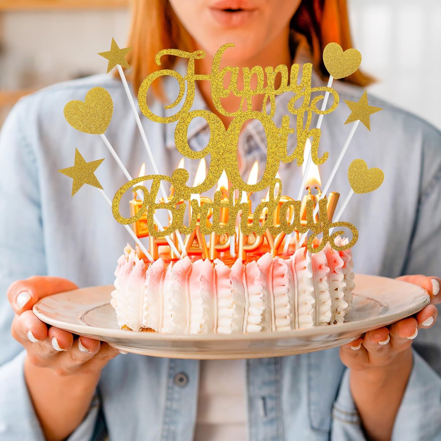 Decorazioni per torte per 90° compleanno, 7 pezzi, personalizzabili, con scritta "Happy 90th Birthday", con stecchini per cupcake a forma di cuore e stella, con glitter dorati, per compleanni e feste