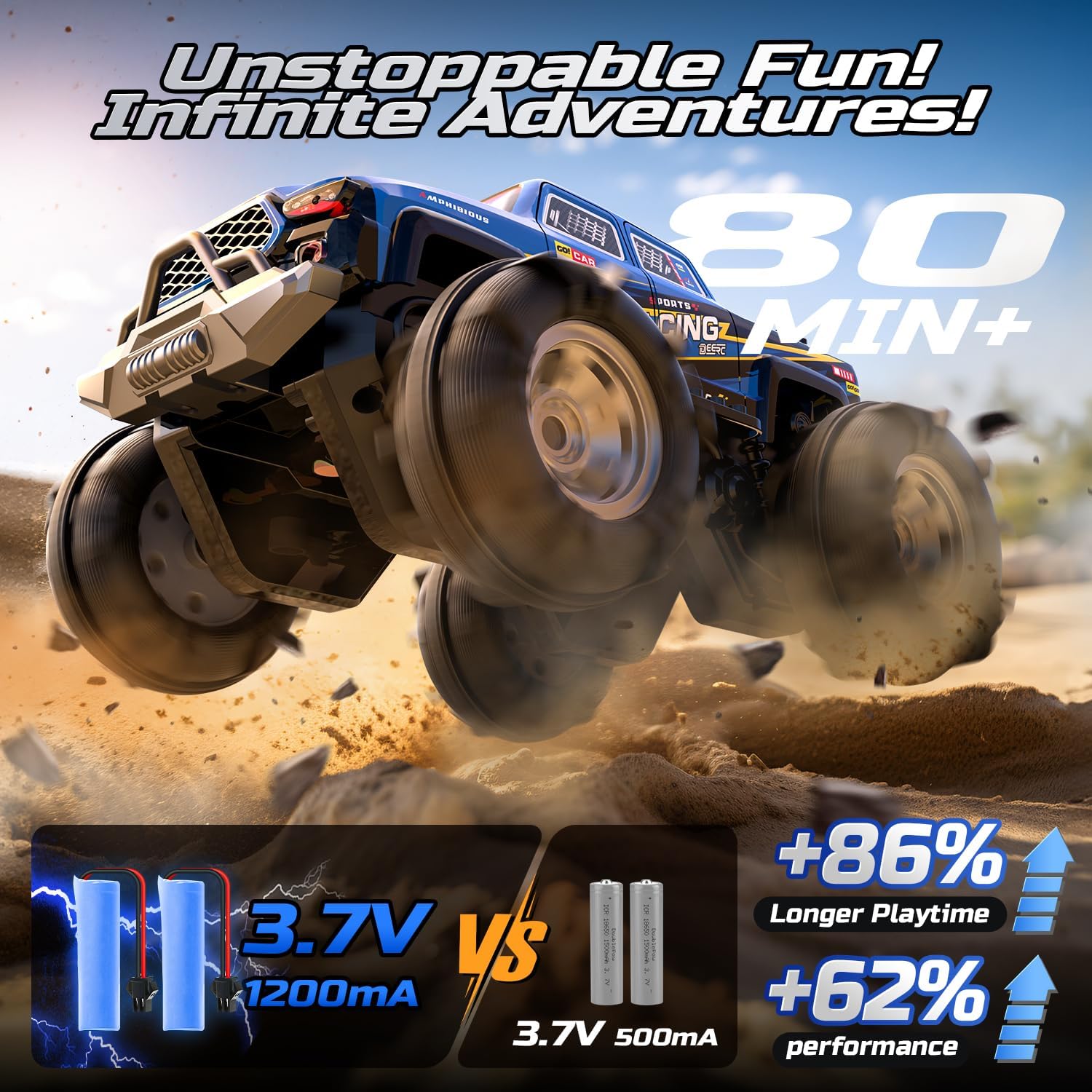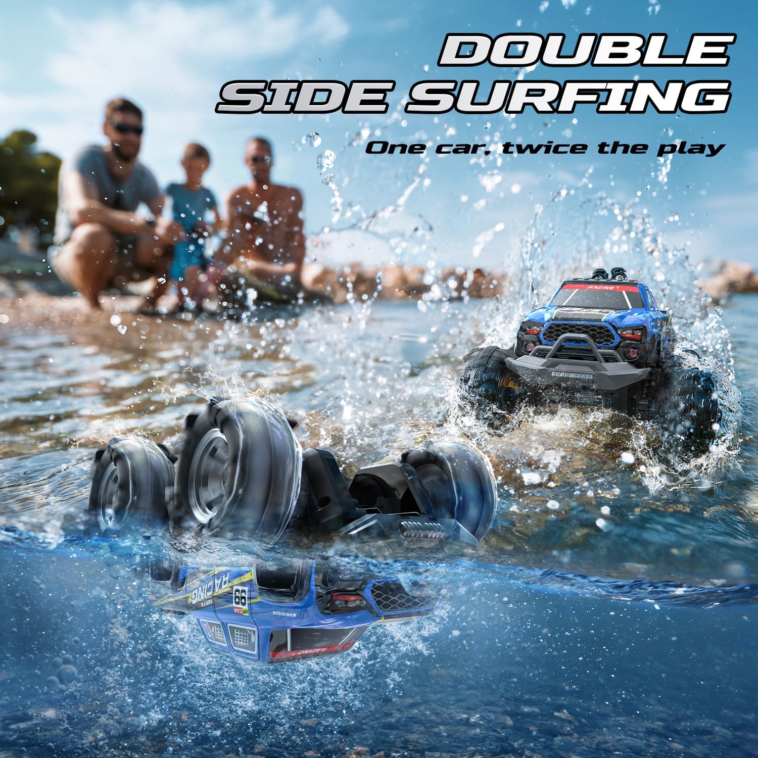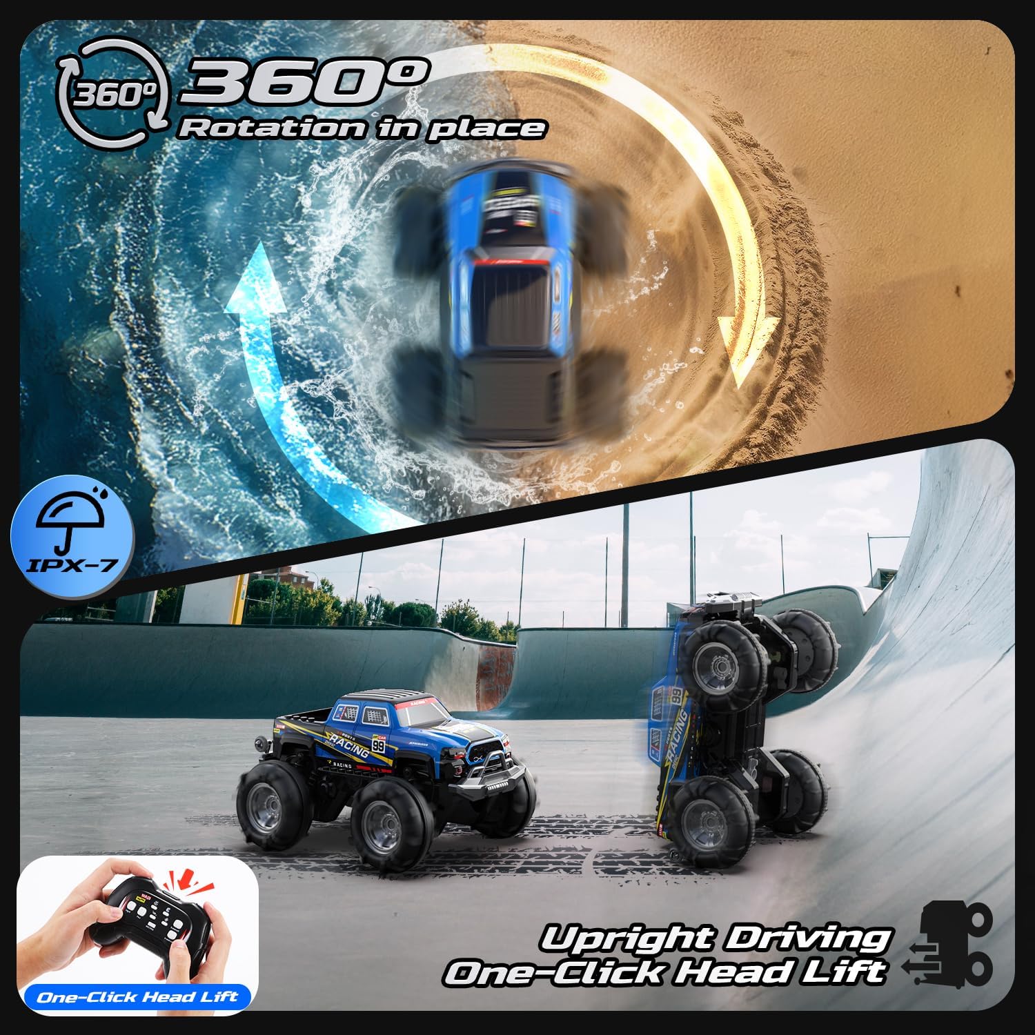 【Monster Truck RC Anfibio】Grazie alla sua impermeabilità IPX7, questo camion RC può essere guidato sia su terra che in acqua, il che lo rende perfetto per le avventure all'aria aperta. Inoltre, può essere guidato sott'acqua a testa in giù e viaggiare sulla superficie dell'acqua senza sforzo grazie al suo fantastico design a doppia faccia. Quanto è fantastico avere un camion che offre due esperienze di guida completamente diverse! 【Facile da controllare con rotazione a 360°】Questa auto acrobatica RC ruota di 360° sul posto, esegue fantastiche acrobazie di guida in posizione verticale, ruota anche da fermo e dispone di una fantastica modalità demo automatica che mostra le sue mosse con una sola pressione. Facile da controllare e perfetto per i principianti, questo giocattolo acquatico offre grandi emozioni su terra e in acqua con controlli semplici e adatti ai bambini. 【Spettacolo di luci arcobaleno e avventura acrobatica fai da te】Attiva l'acrobazia a 360° in modalità flusso di luce dinamico per creare il tuo mondo arcobaleno! Questa auto radiocomandata anfibia è dotata di 7 vivaci colori LED che seguono la direzione di guida, grazie alla sua scocca in ABS ad alta trasparenza che crea un abbagliante effetto a fascio di luce. Puoi anche passare alla modalità lampeggiante monocromatica e alternare tutti e 7 i colori. Inoltre, c'è uno slot per mattoncini sul retro: porta con te i tuoi mattoncini preferiti e personalizza il tuo veicolo per un'avventura acrobatica unica nel suo genere! Telecomando 2 in 1】Prendi il controllo a modo tuo con 2 fantastiche modalità di guida! Usa il controller portatile a 2,4 GHz per una sterzata precisa: è veloce da staccare e facile da maneggiare. Oppure passa alla modalità con sensore di gravità con un cinturino a scatto che si trasforma istantaneamente in un fantastico telecomando in stile orologio. Entrambe le modalità offrono un controllo fluido e reattivo senza interferenze di segnale, così più giocatori possono gareggiare ed eseguire acrobazie insieme per un divertimento competitivo senza sosta! Preparati, scegli la tua modalità e che la competizione abbia inizio! 【80 minuti di azione senza sosta】Questo monster truck è dotato di 2 batterie ricaricabili per un massimo di 80 minuti di gioco totale. Sostituire le batterie è un gioco da ragazzi: basta ruotare la manopola per aprire il vano batteria, senza bisogno di viti o attrezzi! (Il telecomando richiede 2 batterie AAA, non incluse.) Dopo ogni avventura, è sufficiente rimuovere la batteria e asciugare l'auto per mantenerla in perfette condizioni per la prossima corsa piena di spruzzi! 【ASSISTENZA CLIENTI 24/7 - DEERC】Assistenza senza pensieri! Il nostro team di assistenza clienti dedicato è disponibile 24 ore su 24, 7 giorni all'anno. Ottieni risposte e soluzioni rapide per qualsiasi domanda su utilizzo, ricarica o manutenzione. Siamo qui per aiutarti in qualsiasi momento!