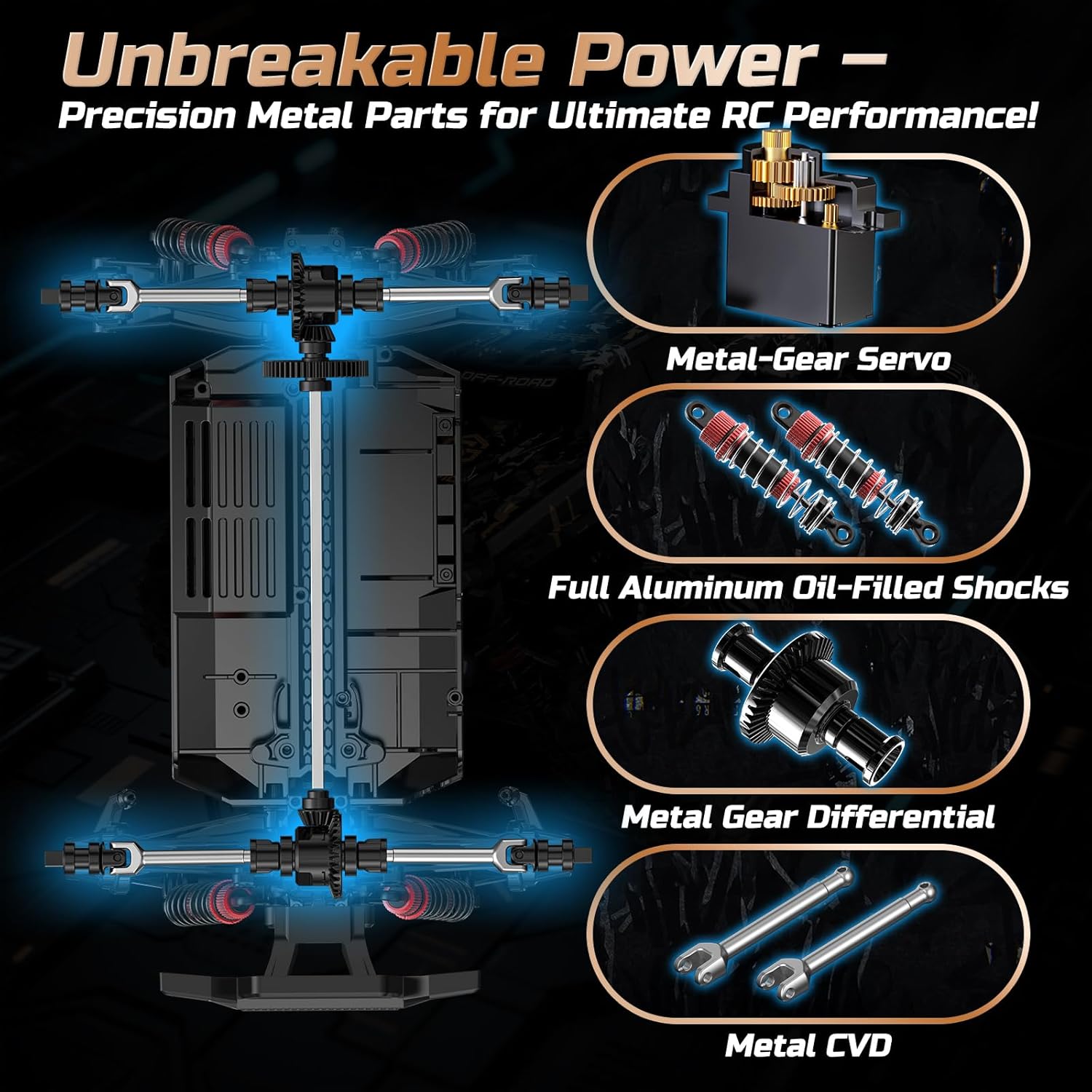 【 Sistema di propulsione interamente in metallo – Costruito per massimizzare le prestazioni】 Dotato di ammortizzatori di pressione dell'olio, differenziale, alberi di trasmissione e servo – tutto in metallo – questo camion RC offre un sistema di propulsione completamente in metallo per una durata e una trasmissione di potenza eccezionali. Che si tratti di sabbia, fango, ghiaia o prato, questa centrale elettrica gestisce facilmente qualsiasi terreno. Prova da vicino l'emozione di una vera corsa fuoristrada! 【40 km/h massima velocità + motore 380 con coppia elevata】 Prendi il prato attraverso i sentieri con un potente motore a spazzola da 380 e raggiungi velocità fino a 40 km/h. Con la trazione integrale e il regolatore impermeabile IPX4 potrete gestire pozzanghere, colline e urti come un professionista: questa bestia non conosce compromessi! Doppia batteria da 1500 mAh – 40 minuti di divertimento ininterrotto: include due potenti batterie da 1500 mAh per un massimo di 40 minuti di riproduzione ininterrotta. Niente più brevi viaggi o ricarica costante: basta più tempo per conquistare il terreno e creare ricordi! 【Faro LED & Wheelie Bar – Stile Monster truck】 Progettato come un vero monster truck fuoristrada con fari a LED funzionanti e una barra posteriore per una maggiore stabilità durante l'accelerazione. Grazie alle sospensioni ammortizzanti, puoi dominare il terreno giorno e notte – preparati per acrobazie epiche! Regalo perfetto per bambini e adulti – Divertimento per tutte le età: sia per hobbisti che per principianti, questa auto RC ad alta velocità è il regalo perfetto per compleanni, vacanze o semplicemente così. Condividi il piacere di guidare, alleviare lo stress e sperimentare il lato selvaggio del divertimento con il telecomando – non dimenticheranno mai.