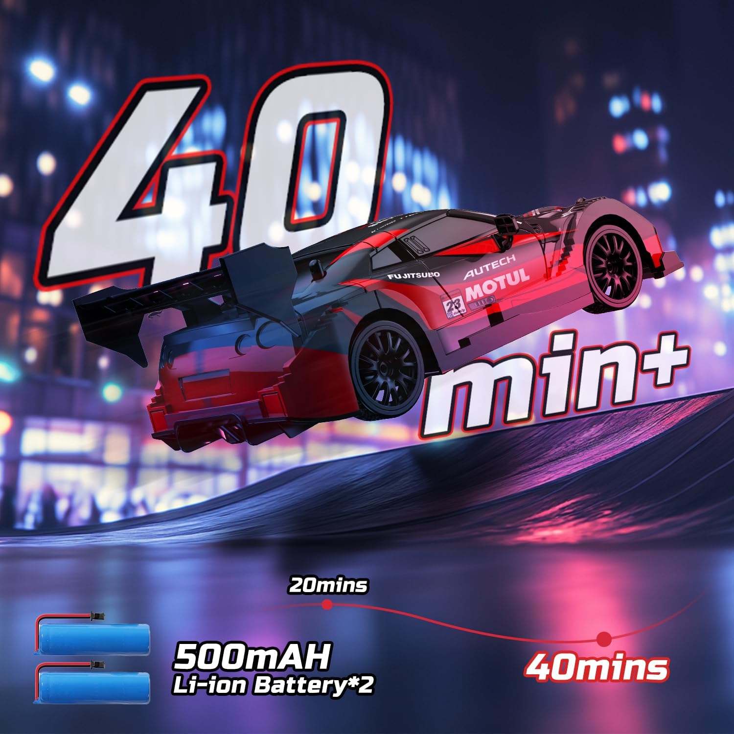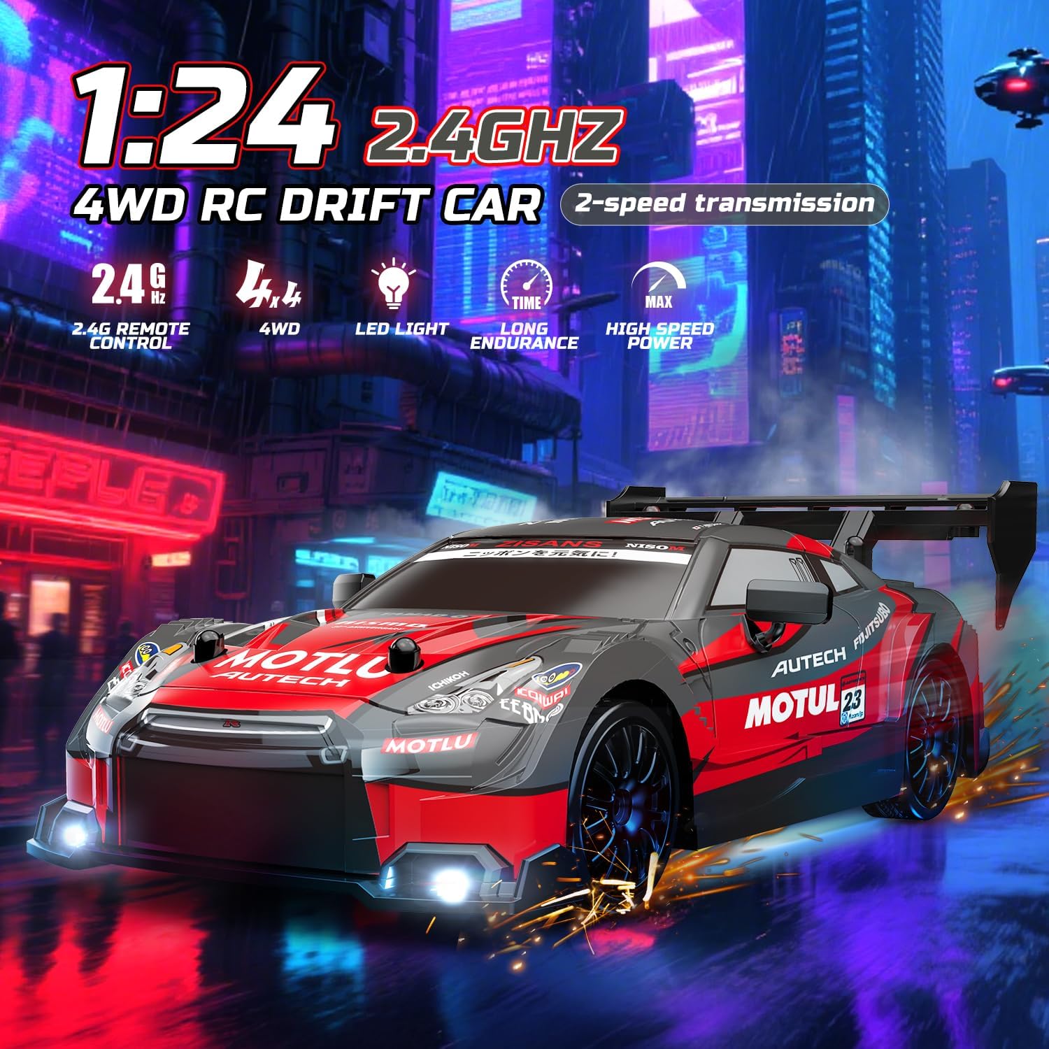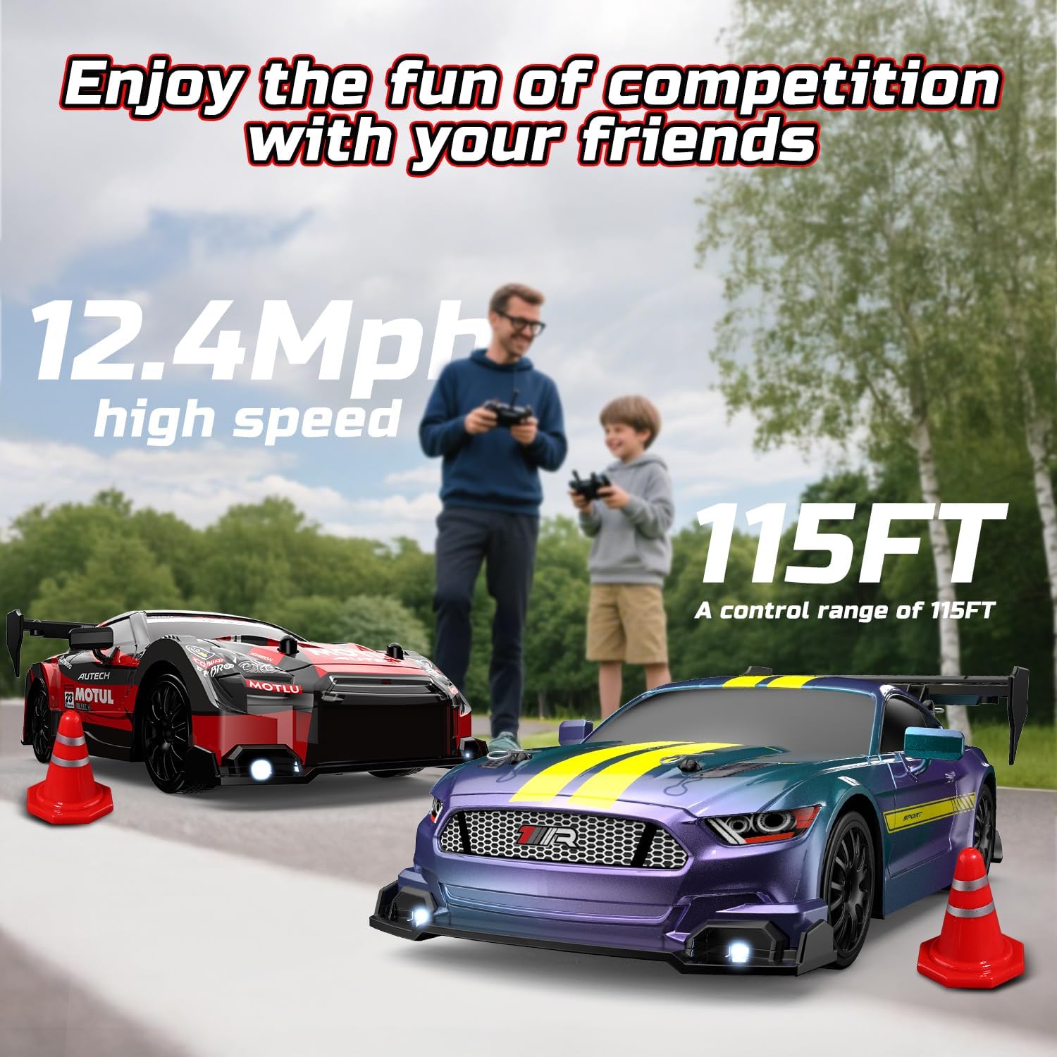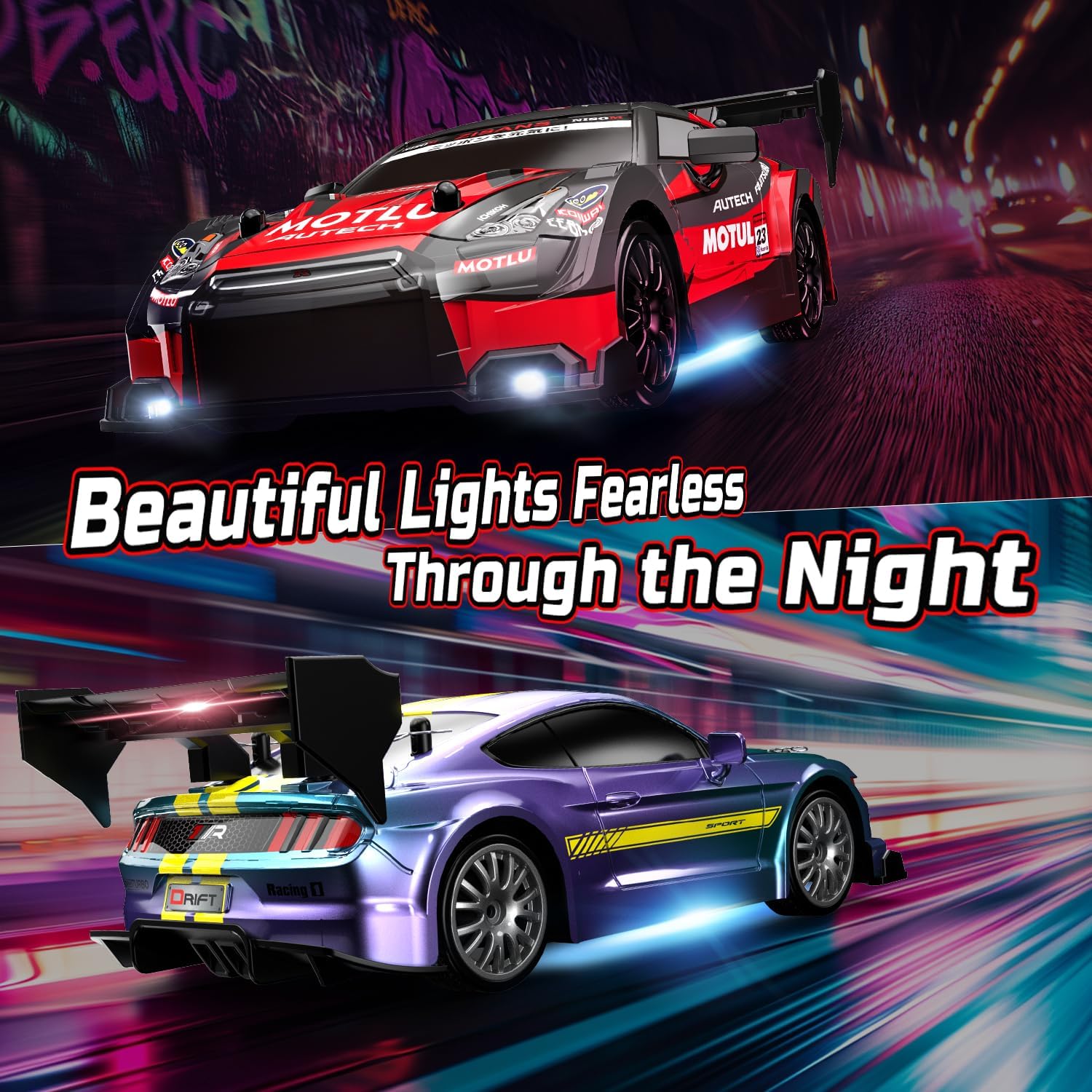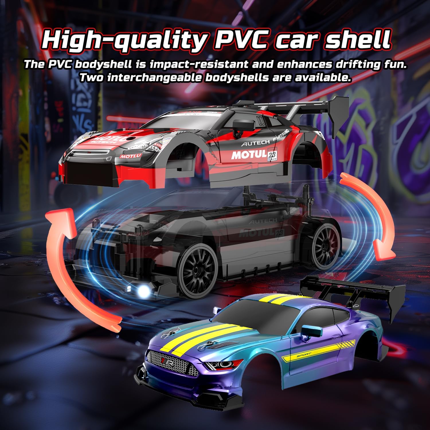 Auto da deriva RC multifunzione con 4WD: dotata di un potente motore e azionamento 4WD, questa auto da deriva RC supporta la marcia avanti/indietro, sterzo sinistra/destra e manovre di deriva complete. Con protezione anti-urto, allarme di bassa tensione, illuminazione regolabile e controllo della velocità a 2 velocità, perfetto per bambini e appassionati di RC. Telecomando a 2,4 GHz e illuminazione a LED: la moderna tecnologia radio a 2,4 GHz consente una portata di oltre 35 metri e corsa simultanea di più auto senza interferenze di segnale. Le luci anteriori, sottoscocca e posteriori regolabili in modo indipendente offrono il pieno controllo degli effetti di luce. I fari a LED luminosi rendono la guida notturna più spettacolare. Velocità massima e lunga durata della batteria: contiene due batterie ricaricabili da 3,7 V 500 mAh per un totale di 20 minuti di riproduzione e raggiunge velocità fino a 20 km/h. L'auto alla deriva avvisa quando la batteria è scarica grazie alla luce lampeggiante e si arresta automaticamente per risparmiare la durata della batteria. Ampia dotazione: include 2 carrozzerie intercambiabili per un design personalizzato, 4 pneumatici per un rapido passaggio tra modalità corsa e deriva e 8 cappelli stradali per costruire i propri circuiti da corsa. Ideale per pavimenti lisci, piastrelle o piste da corsa. Lavorazione robusta e di alta qualità: realizzato in telaio ABS antiurto e corpo flessibile in PVC. È durevole e facile da mantenere grazie ai pneumatici ispessiti e resistenti all'usura e ai mozzi rimovibili.