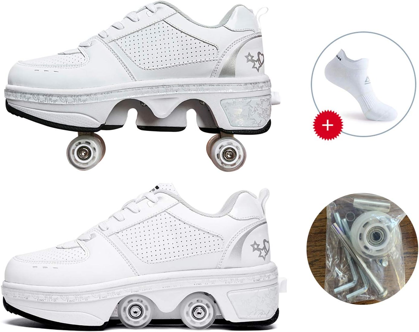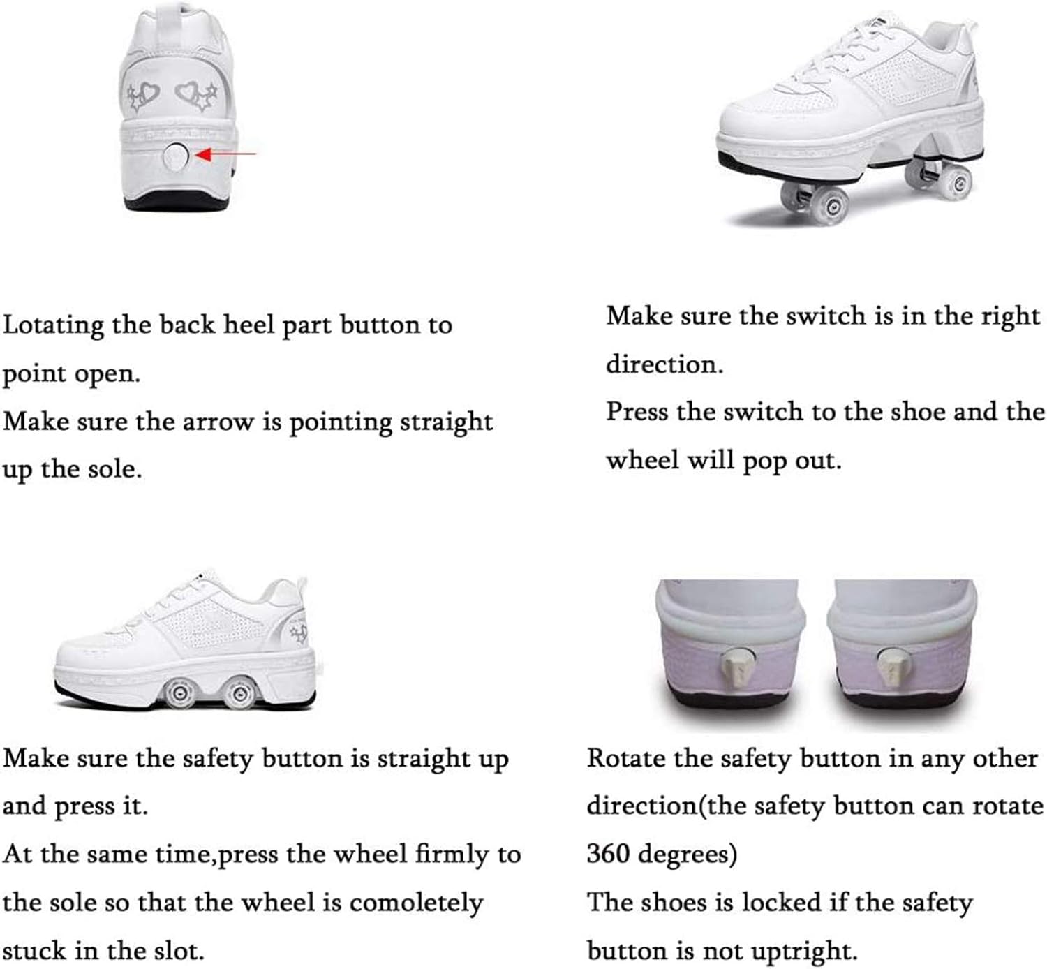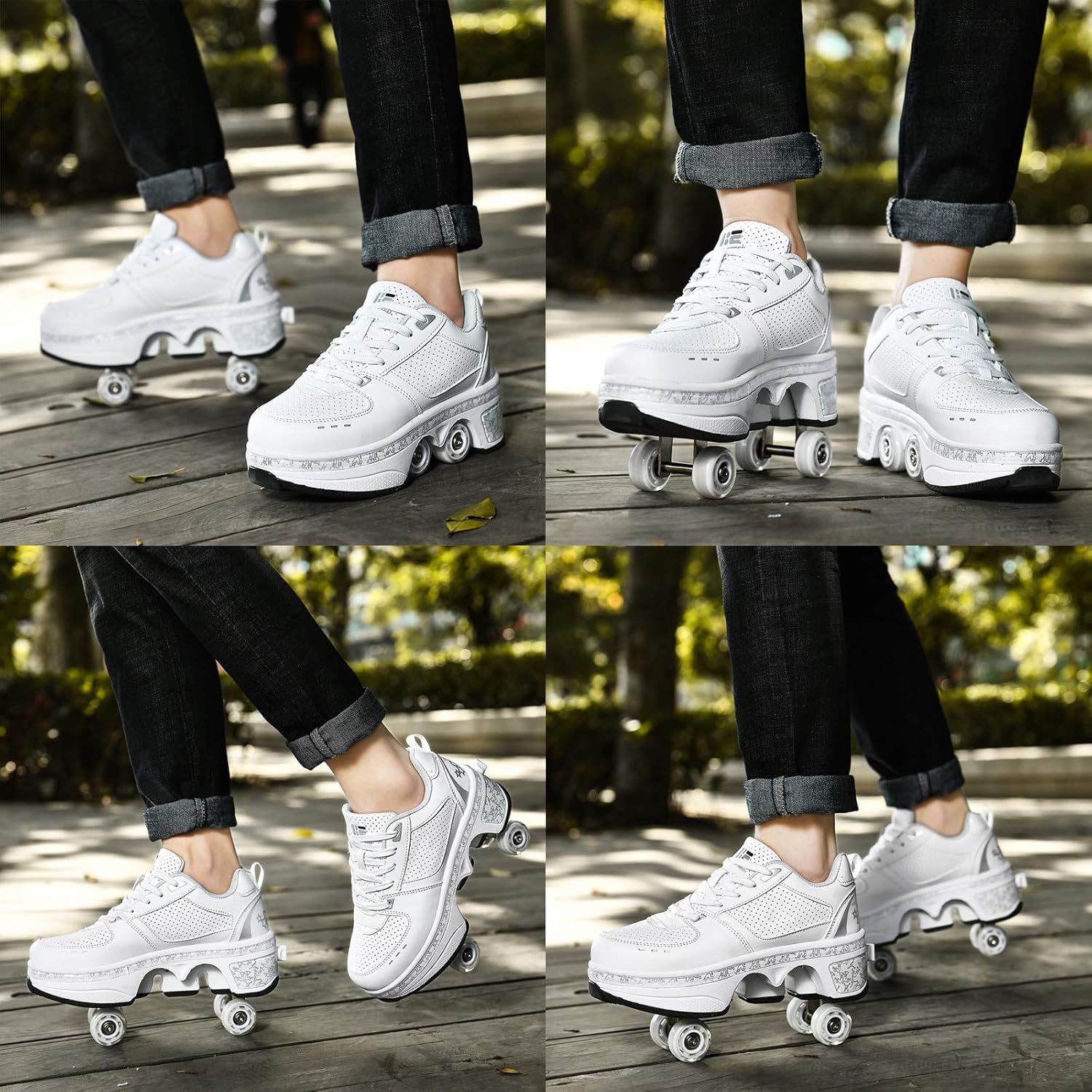★ Molto Creativo: è Scarpe Da Skateboard Sneakers 2 In 1! La Sua Suola Ha Un Paio Di Ruote Nascoste. Quando Vuoi Scivolare, Basta Girare L'interruttore Del Tallone E Aprire La Ruota, Puoi Aggiungere Queste Scarpe Uniche Alla Squadra Di Volo Del Tuo Amico! Non Solo Può Essere Utilizzato Per Il Pattinaggio A Rotelle, Ma Può Anche Essere Camminato. ★ Design Unico Di Invisibile: è Pattini A Rotelle! Pulsante Per Impedire L'apertura Accidentale, C'è Un Pulsante Sul Retro Della Scarpa, Premilo E La Ruota Si Aprirà. Tenere Premuto Il Pulsante, Spingere La Ruota Nella Piastra Inferiore E Rilasciarla. ★ Comodo Spazio Interno: è Pattini A Rotelle Regolabili! Il Tipo Di Materiale Interno è Una Rete Traspirante, Progettata Per Raggiungere Un Elevato Grado Di Ventilazione E Molto Confortevole. Non Riposa Sul Piede E Può Proteggere Meglio I Tuoi Piedi. ★ Materiali Di Alta Qualità: è Un Pattino Quad A 4 Ruote! Lo Strato Esterno Della Scarpa è Realizzato Con Materiali Altamente Anti-incrostanti E Resistenti All'idrolisi. La Testa Anticollisione è Progettata Per Proteggere I Tuoi Piedi Mentre è Impermeabile E Traspirante Per Il Comfort Dei Tuoi Piedi. ★ Tendenza Moda: Sono Le Scarpe A Rulli Deformate! Scarpe Da Deformazione Multifunzionali Eleganti E Alla Moda Sneaker Di Moda Per Pattinaggio / Festa / Discoteca / Danza / Compleanno / Natale.