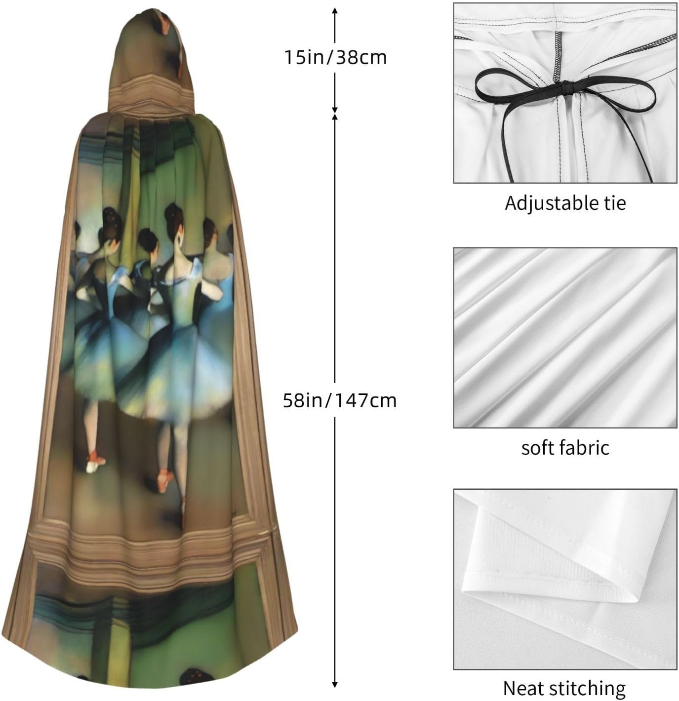 TheDegas Ballet Adult Hooded Halloween Cape è un accessorio costume premium progettato per il massimo comfort e versatilità. Caratterizzato da un cappuccio oversize e una cravatta sicura al collo, questo mantello garantisce una vestibilità aderente senza il fastidio delle cerniere. Realizzato in tessuto resistente e privo di prurito, fornisce una lunga durata e confortevole. Perfetto per una varietà di eventi tra cui Halloween, cosplay, spettacoli teatrali, feste in maschera, feste a tema, balli e convegni a fumetti, questo mantello è un must per chiunque cerchi di fare una dichiarazione. I suoi materiali di alta qualità assicurano che resista all'usura, rendendolo un'aggiunta affidabile alla tua collezione di costumi.