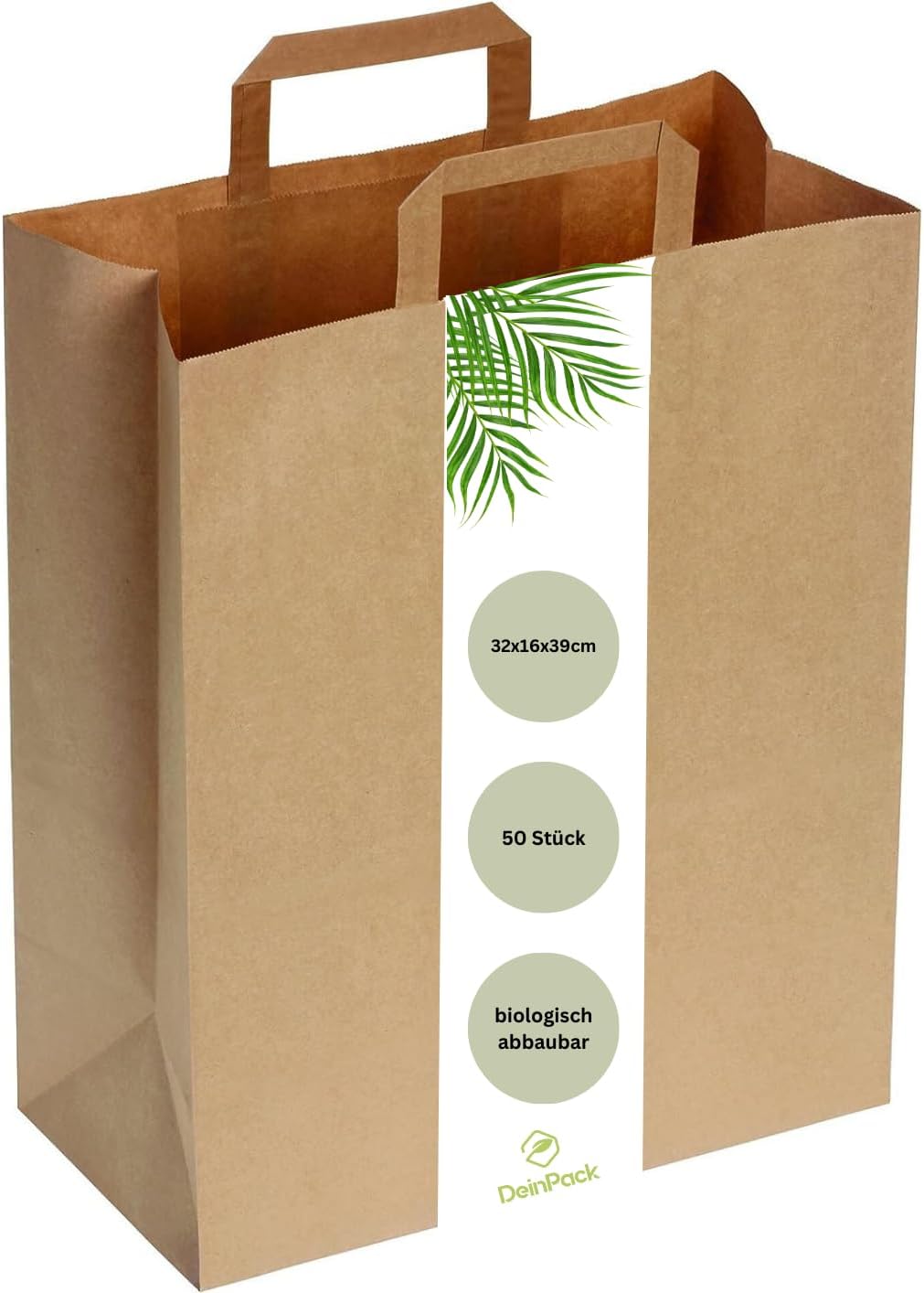 SACCHETTI DI CARTA REALIZZATI IN MATERIALE ECOLOGICO: Sacchetti di carta marrone realizzati con carta kraft di alta qualità, un materiale sostenibile e biodegradabile, questi sacchetti di carta marrone sono un'alternativa ecologica ai tradizionali sacchetti di plastica. BORSE DI CARTA ROBUSTE E DUREVOLI: La struttura robusta delle borse di carta, le borse di carta marrone assicurano che possano trasportare anche gli acquisti pesanti in modo sicuro e affidabile. VERSATILI: I sacchetti di carta grandi sono ideali per la spesa di tutti i giorni, biscotti di Natale, frutta, prodotti farmaceutici e altri piccoli oggetti. Perfetto per confezionare un matrimonio o un regalo aziendale. Sacchetti di carta marrone, sacchetti di carta, sacchetti regalo di carta, sacchetti di carta per feste, sacchetti di carta, sacchetti per la spesa, sacchetti per la spesa, sacchetti da asporto, sacchetti per la spesa, sacchetti regalo grandi e altro ancora. BORSA TOTE ECOLOGICA: L'aspetto naturale della carta kraft conferisce alle borse un fascino rustico e le rende accattivanti. PERSONALIZZABILITÀ: Questi sacchetti regalo di grandi dimensioni possono essere facilmente personalizzati poiché non sono stampati. Che si tratti di adesivi, timbri o altre decorazioni personalizzate, puoi persino creare il tuo calendario dell'Avvento fai da te. Ampio assortimento: nel nostro negozio DeinPack troverete sacchetti di carta in molte dimensioni: 26 x 17 x 26 cm I 32 x 18 x 26 cm I 32 x 22 x 27 cm I 18 x 7 x 25 cm I 22 x 10,5 x 30 cm I 26 x 10 x 36 cm I 32 x 12 x 40 cm I 32 x 16 x 39 cm I 32 x 17 x 44 cm Fornitura: 50 sacchetti di carta marrone 32 x 16 x 39 cm