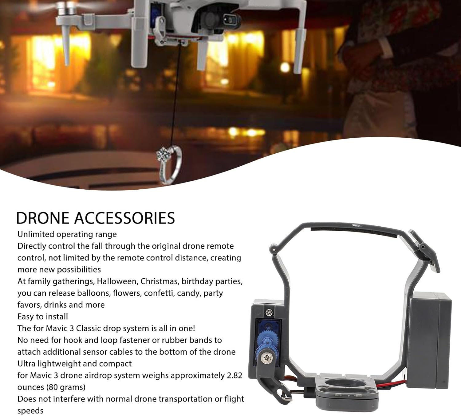 [Compatibilità della larghezza] Adatto per droni 3 e 3 Pro con una capacità di carico massima di 500 g. [Long Endurance] Batteria di litio da 150 mAh integrata, che può essere completamente caricata in 1,5 ore e utilizzata fino a 300 volte. [Facile da installare] Nessun cavo sensore aggiuntivo, design per arredi e utilizzo veloci. [Applicabile] Controlla il telecomando AirDrop, riposati con palloncini, dolci e altro alle riunioni e feste. [Ultra Light] Con un peso di 2,82 once, non ha alcun effetto sulla velocità o sulle prestazioni del drone durante il volo.