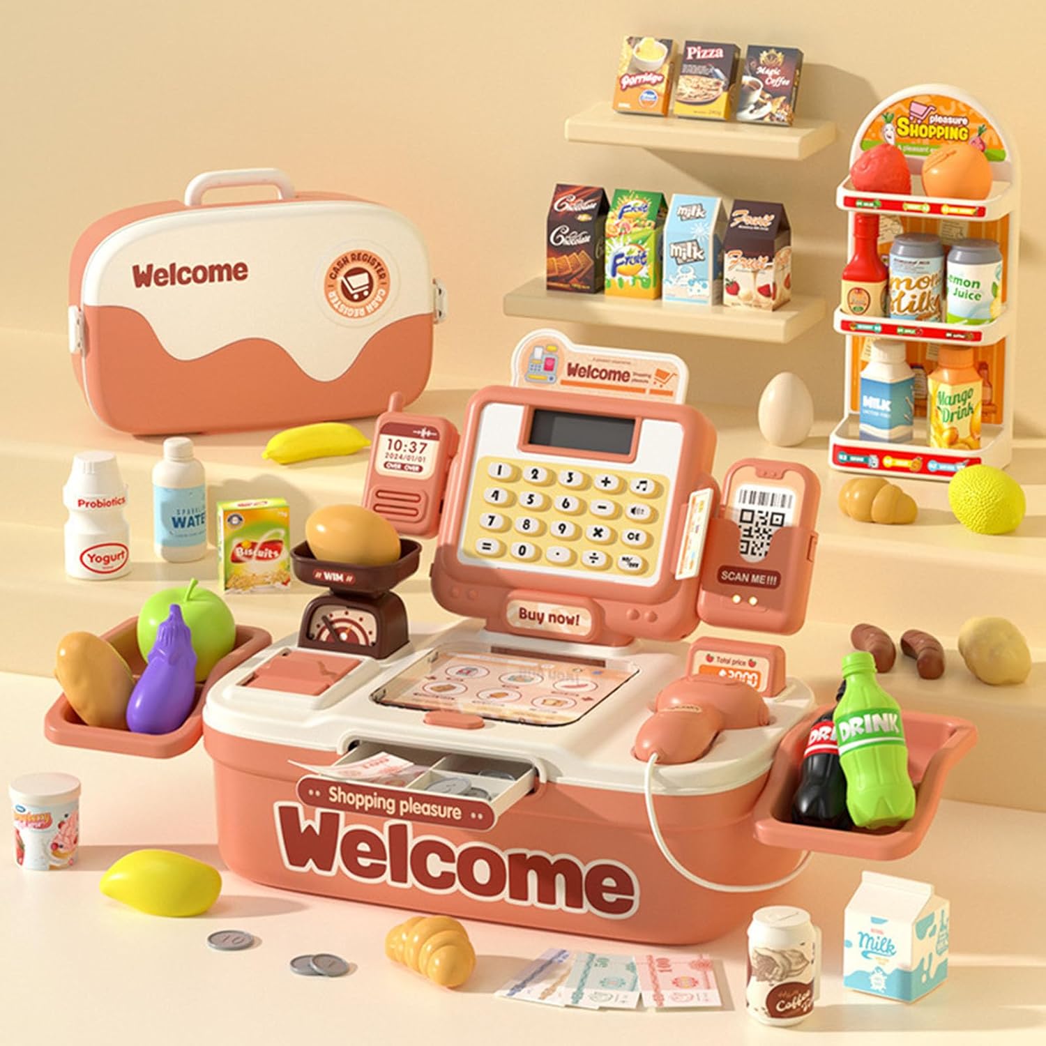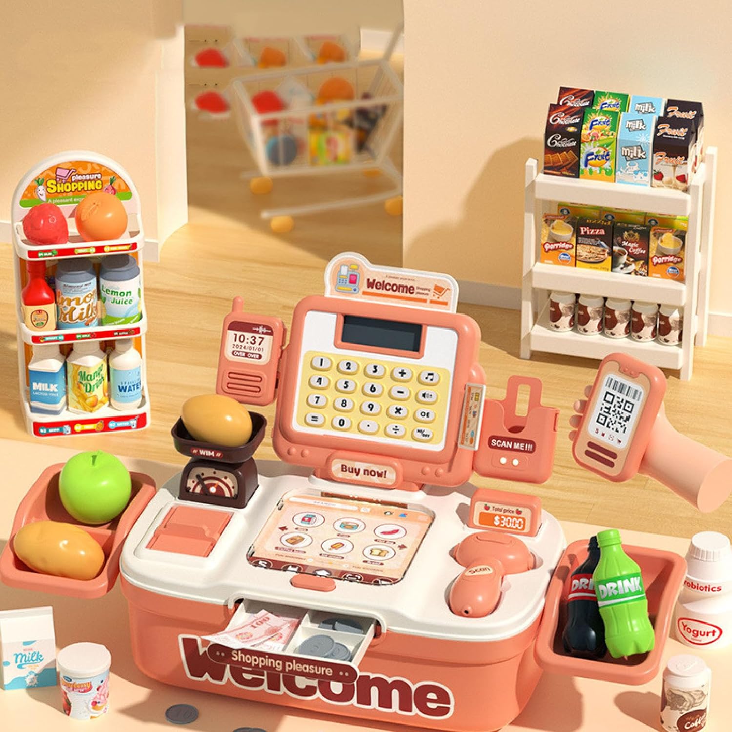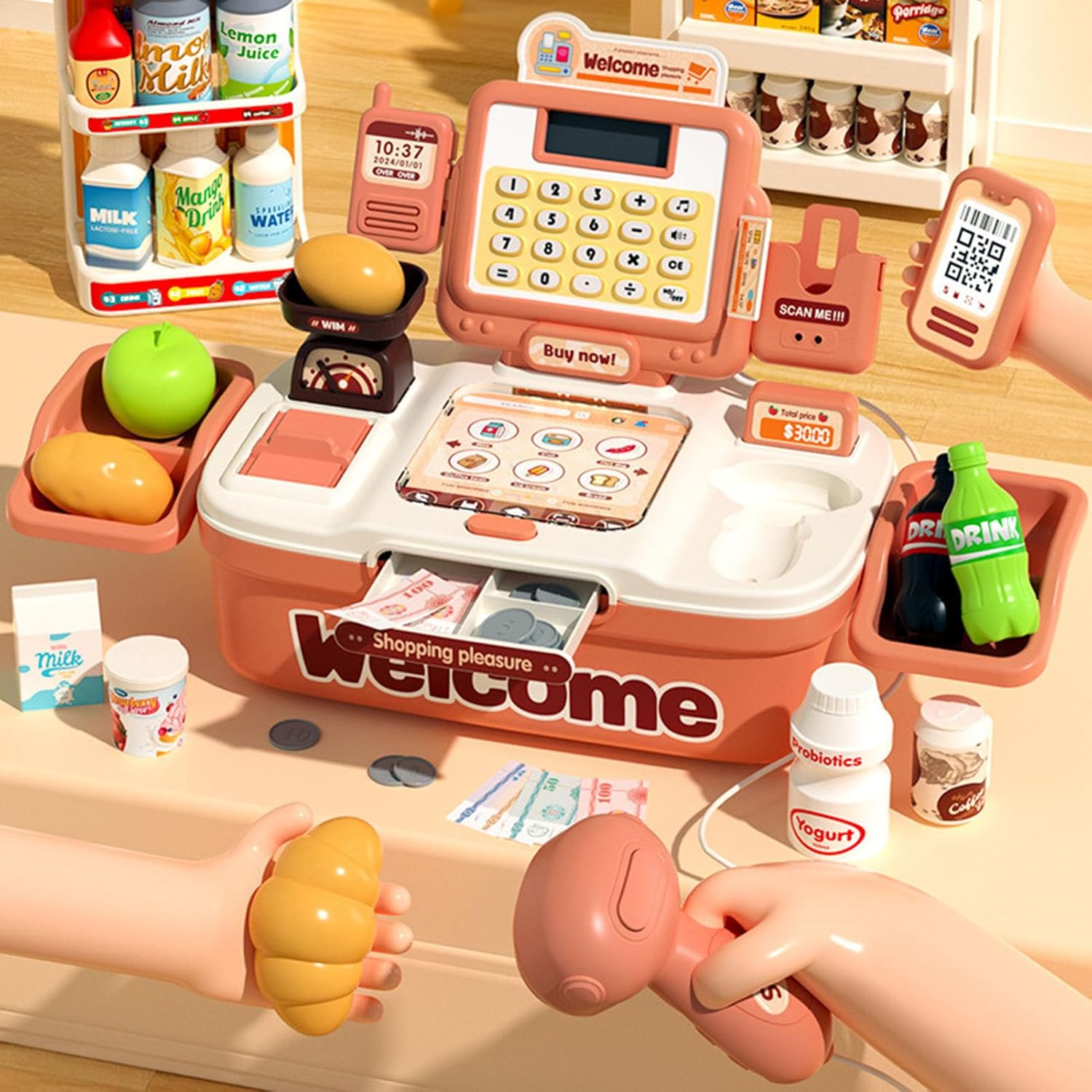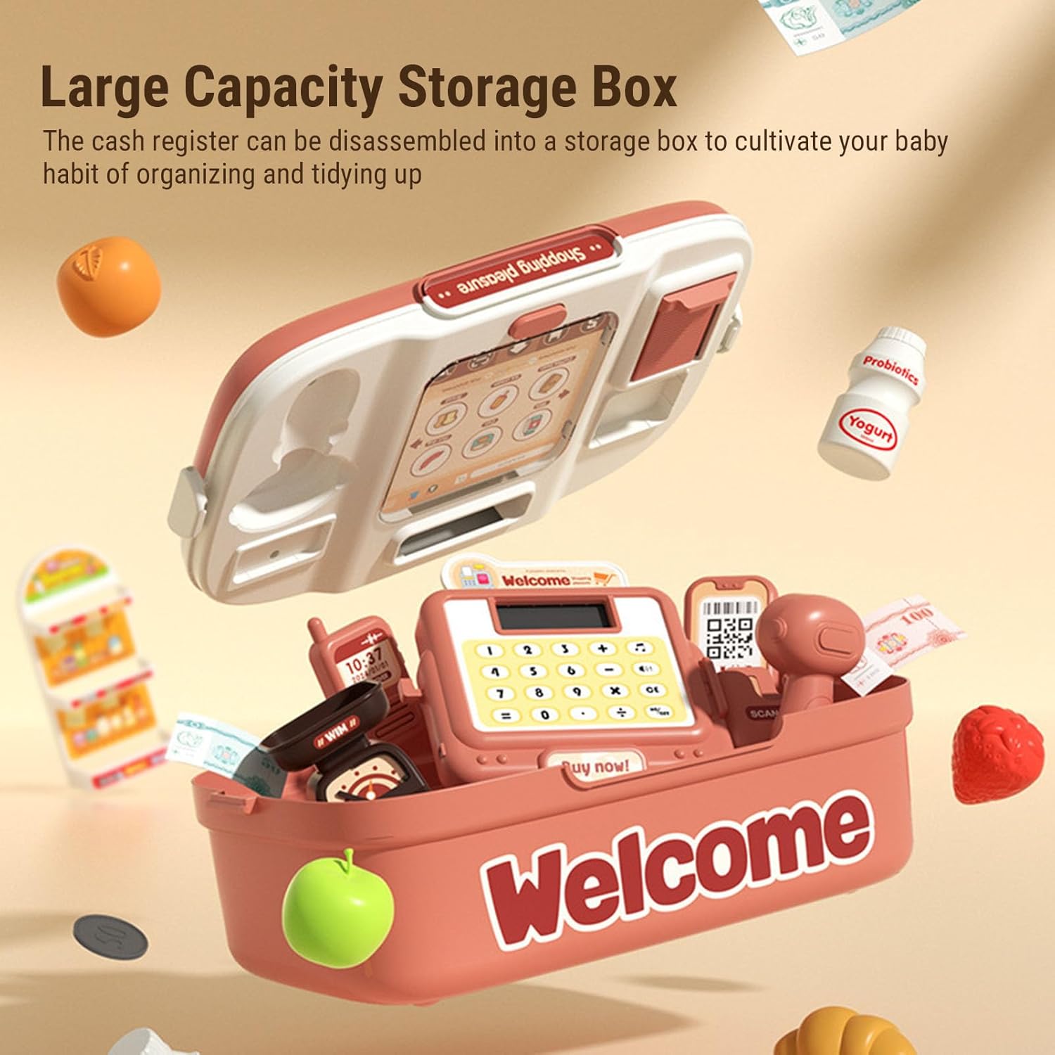 COSTRUZIONE IN PLASTICA : questo set di giocattoli per registratore di cassa è realizzato in plastica ABS, con angoli arrotondati e senza sbavature o bordi incisivi, garantendo un gioco sicuro. È adatto a tutti i bambini che amano i giochi di ruolo, è un premuroso per compleanni e feste SET PER L'APPRENDIMENTO SVILUPPO: questo kit giocattolo consente ai bambini dai 3 ai 6 anni di esercitarsi nel conteggio, nell'aritmetica di base e nell'espressione linguistica nel gioco di ruolo. Aprendo e chiudendo il cassetto e posizionando le monete, esercita le loro capacità motorie e la coordinazione occhio-mano MONETE E CARTE MERCE: Include banconote cartacee e monete di plastica simulate per esercitarsi a contare, apportare modifiche ed eseguire transazioni, con opzioni espandibili per giochi di determinazione dei prezzi personalizzati per esercitare la cognizione matematica e il pensiero logico dei bambini FINTA REGISTRATORE DI CASSA: questo giocattolo da cassiere imita la vera cassa di un supermercato con colori vivaci e forme carine, dotato di cassetto della cassa, fessura, tastiera, ecc., scatenando giochi di ruolo fantasiosi mentre i piccoli acquirenti imparano le abilità di gestione del denaro a casa EFFETTO SUONO E LUCE: il giocattolo interattivo con registratore di cassa risponde con melodie allegre, segnali acustici e luci lampeggianti delicate quando si premono i pulsanti o si apre il cassetto, creando un'atmosfera da supermercato coinvolgente per un gioco prolungato