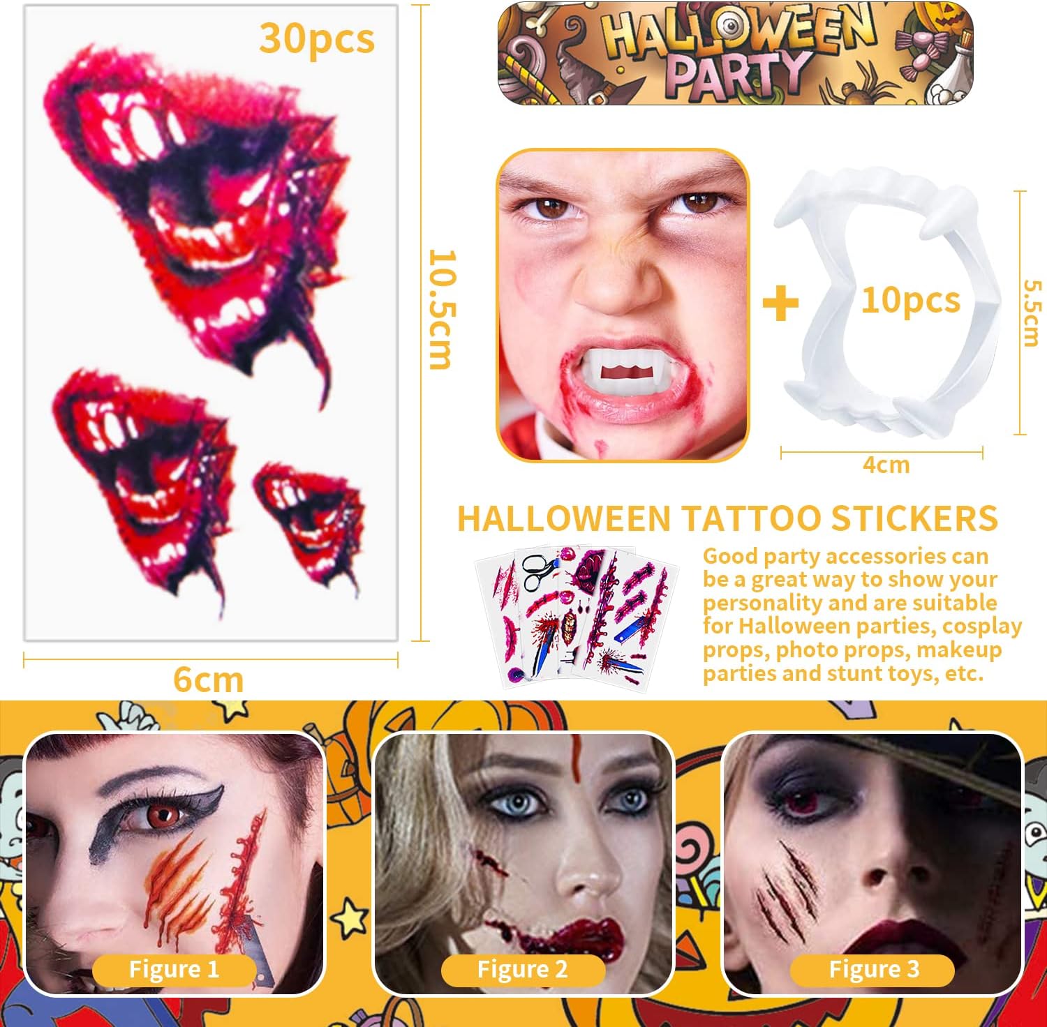 ❤ 【Set Halloween】: inclusi 10 misure 5 x 6,5 cm, 10 pezzi di zanne da vampiro 30 pezzi di tatuaggi temporanei di Halloween, quantità sufficiente per te, possono aiutarti con la tua festa. licantropo il gioco, decorazione della festa di Pasqua ❤ 【Materiale】: realizzato in plastica con pregevole fattura, non tossico, flessibile e confortevole, facile da indossare senza colla, spaventoso e divertente da indossare, buono per i costumi, un buon giocattolo per alleviare lo stress o intrattenere nel tuo tempo ❤ 【Ampiamente uso】: applicali al gioco dei personaggi, adatti come accessori per costumi di vampiri, lupi mannari, zombi e cosplay. Possono anche essere inviati come regali ad amici o familiari, aggiungendo più divertimento ❤ 【Il miglior travestimento di Halloween】: le zanne da vampiro di Halloween possono essere utilizzate come i migliori oggetti di scena per gli eventi di Halloween. Le zanne da vampiro possono darti uno stile di abbigliamento molto nuovo e molto popolare. Le zanne da vampiro squisite sono buone per il gioco dei personaggi di gruppo. ❤【Servizio di qualità】:Se hai problemi con l'acquisto e un uso eccessivo, ti preghiamo di contattarci. Abbiamo servito per te in qualsiasi momento.