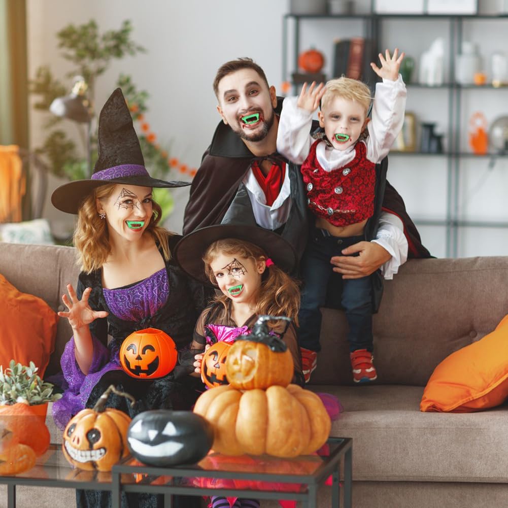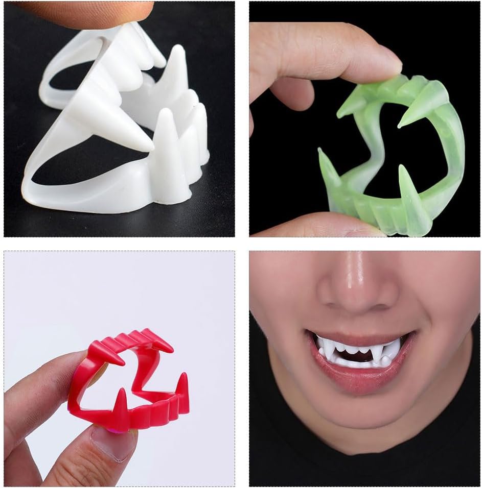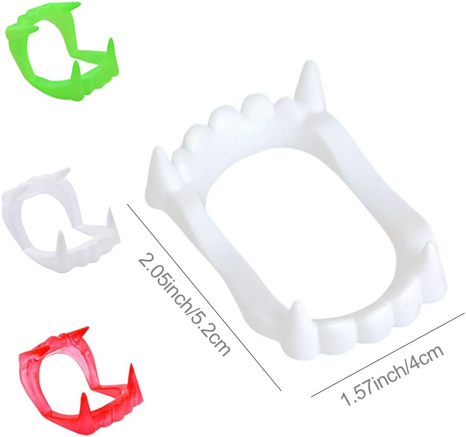 Dimensioni: Riceverai 24 denti da vampiro per Halloween, 8 rossi, 8 bianchi e 8 verdi fosforescenti. La dentiera è lunga circa 5,2 cm e larga 4 cm, adatta alla maggior parte dei bambini e degli adulti. Facile da riporre e trasportare, ideale come accessorio per Halloween. Materiale: I denti da vampiro sono realizzati in plastica, morbidi e flessibili, senza spigoli vivi, comodi da indossare. Il peso è molto leggero, quindi non sentiremo pressione se li indossiamo tutto il giorno. Non si deformano facilmente, possono essere utilizzati a lungo. Denti da Vampiro Realistici: I denti da vampiro in plastica per Halloween presentano forme realistiche, con zanne sia sulla parte superiore che inferiore, per un'atmosfera ancora più spettrale, aggiungendo un tocco spettrale e autentico al tuo costume. Il verde fosforescente brillerà anche al buio, aggiungendo un'atmosfera spaventosa ad Halloween. Facili da Indossare: I denti da vampiro di Halloween sono realizzati in un unico pezzo, molto comodi da indossare e da togliere, e non richiedono molto tempo. Con fessure facili da indossare e che non si spostano facilmente, le fessure hanno abbastanza spazio per adattarsi meglio ai denti. Uso Versatile: I denti da vampiro sono perfetti per essere usati per travestire vampiri, lupi mannari, orchi o zombi e personalizzare il tuo look. Queste zanne da vampiro sono ottimi accessori da abbinare ai costumi, adatti per Halloween, Natale, feste in maschera, cosplay, feste a tema horror, spettacoli teatrali e così via. Aggiungono un tocco festoso e spaventoso a qualsiasi evento.