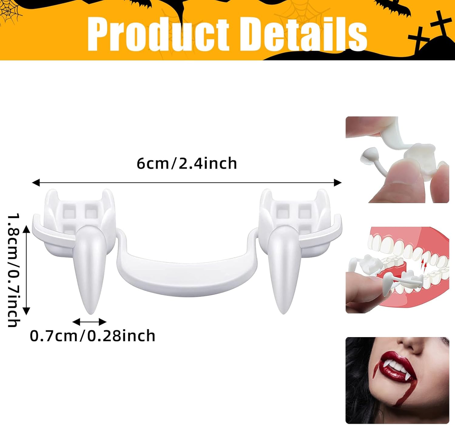 🧛♀️Zanne da vampiro uniche: che tu stia facendo cosplay da vampiro, lupo mannaro o zombi, con questi denti sei pronto per qualsiasi costume spaventoso. 🧛♀️Zanne realistiche: indossa le nostre zanne da vampiro per rendere il tuo costume da cosplay più realistico, abbinale al tuo costume da vampiro, stordisci tutti e regala un'esperienza indimenticabile. 🧛♀️Design retrattile: le zanne da vampiro retrattili sono molto facili da usare. Puoi controllare l'aspetto e la scomparsa dei denti muovendoli orizzontalmente su e giù con la lingua, consentendoti di passare rapidamente da vampiro a umano. 🧛♀️Alta qualità: il materiale è robusto, sicuro, durevole e lavabile, quindi i tuoi possono essere riutilizzati. 🧛♀️Ampia applicazione: le zanne da vampiro retrattili di Halloween sono perfette per feste a tema horror, feste di Halloween, feste di gioco di ruolo, feste in maschera, carnevali, Natale.