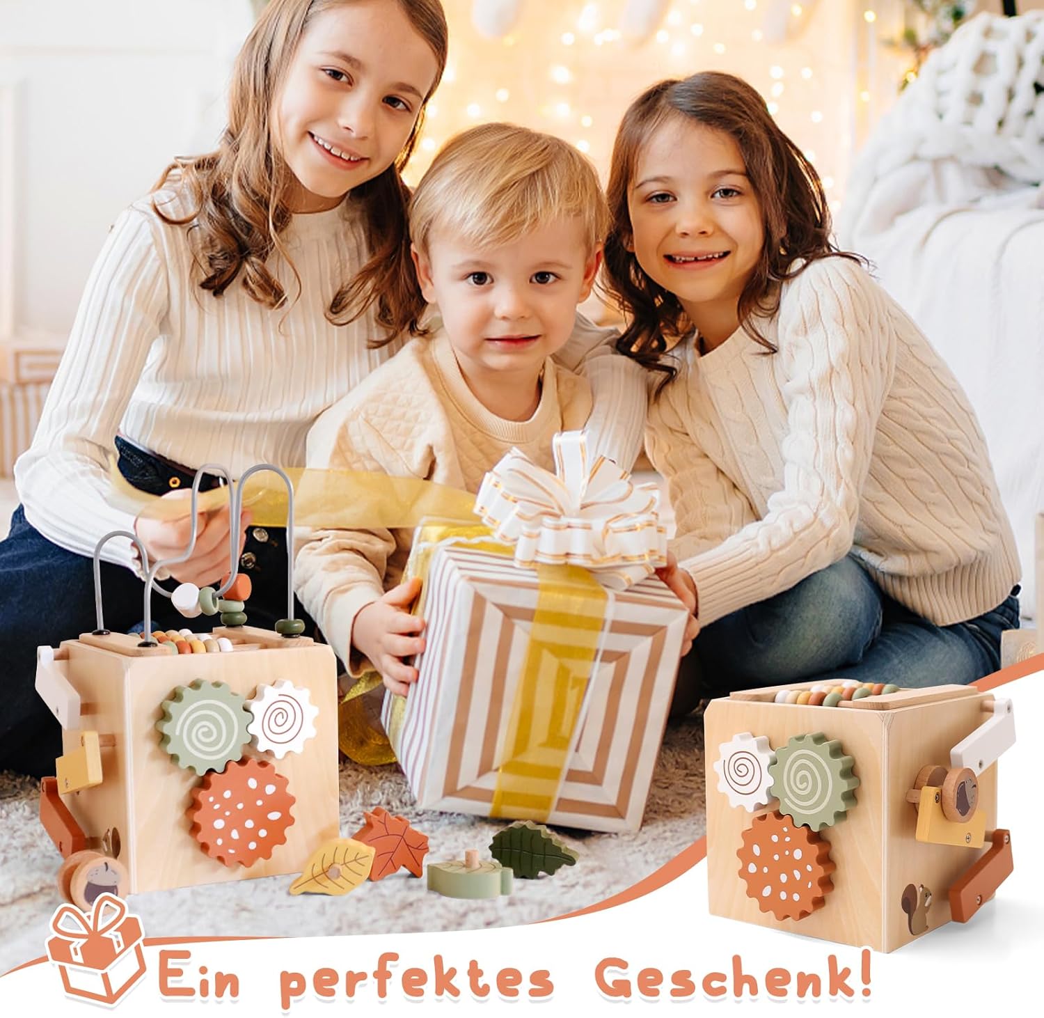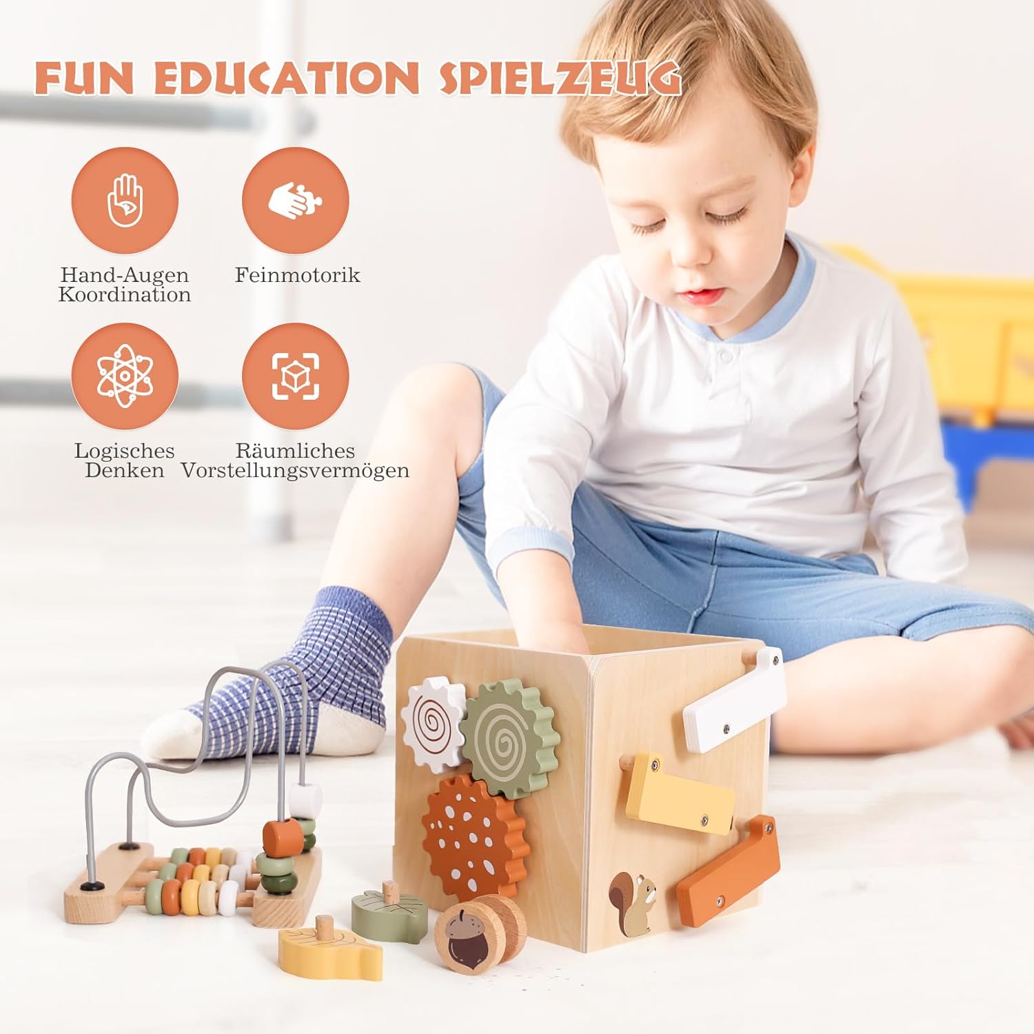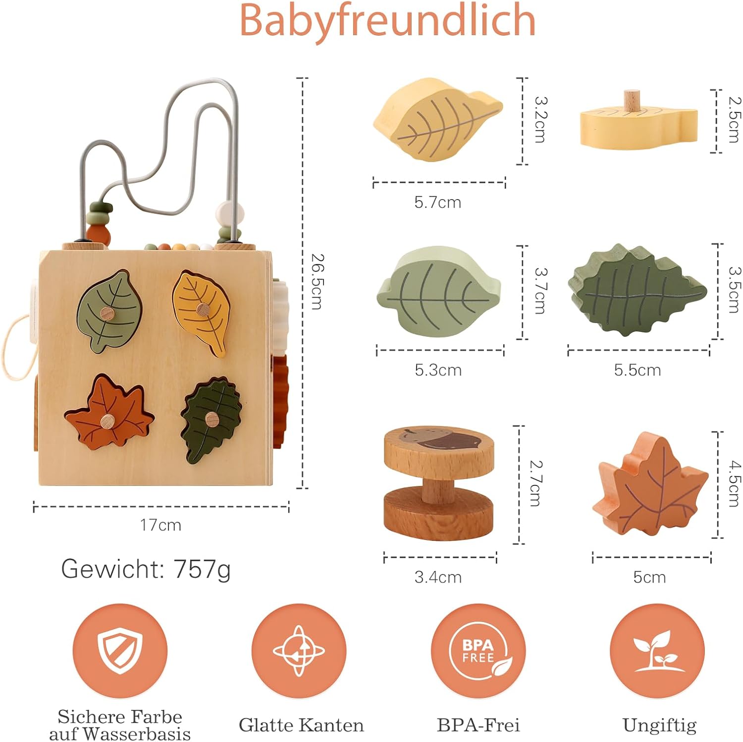 【Cubo di attività in legno 6 in 1】 Questo cubo di abilità motorie ha 5 diversi lati di gioco (6 tipi di gioco): labirinto di perline, selezionatore di forme di foglie, ingranaggi rotanti, abaco, scivolo per scoiattolo, apertura e chiusura di porte e finestre. È un meraviglioso giocattolo didattico in modo che i bambini possano esplorare, sperimentare e scoprire giocando. 【Sicurezza e qualità】 Il giocattolo per abilità motorie WOODEN TEETHER è realizzato in legno naturale, dipinto con vernici a base d'acqua non tossiche, robusta struttura in legno con bordo arrotondato e tavolozza di colori leggera e delicata. Dimensioni: 26,5*17 cm, peso: 757 g, per un divertimento sostenibile e senza preoccupazioni per i più piccoli. 【Divertente giocattolo educativo】 L'esclusivo giocattolo in legno WOODEN TEETHER promuove le capacità motorie del bambino, il riconoscimento della forma e la coordinazione occhio-mano. I cubi di gioco offrono un divertimento senza fine ai bambini. Deve essere un buon partner affinché il bambino cresca e diventi il miglior giocattolo educativo. 【Giocattolo da viaggio portatile】 Il coperchio del centro attività per bambini è rimovibile e può essere invertito per adattarsi alla scatola. Tutti i blocchi di foglie si adattano alla scatola, rendendola un giocattolo da viaggio facilmente trasportabile per i più piccoli. 【Regalo perfetto per il bambino】 La simpatica immagine dello scoiattolo sull'arco delle abilità motorie cattura rapidamente l'attenzione del bambino. Se stai cercando un regalo di compleanno o di festa che sia allo stesso tempo educativo e divertente, questo cubo di attività è la scelta giusta. Se hai domande, ti preghiamo di contattarci e ti risponderemo entro 24 ore.