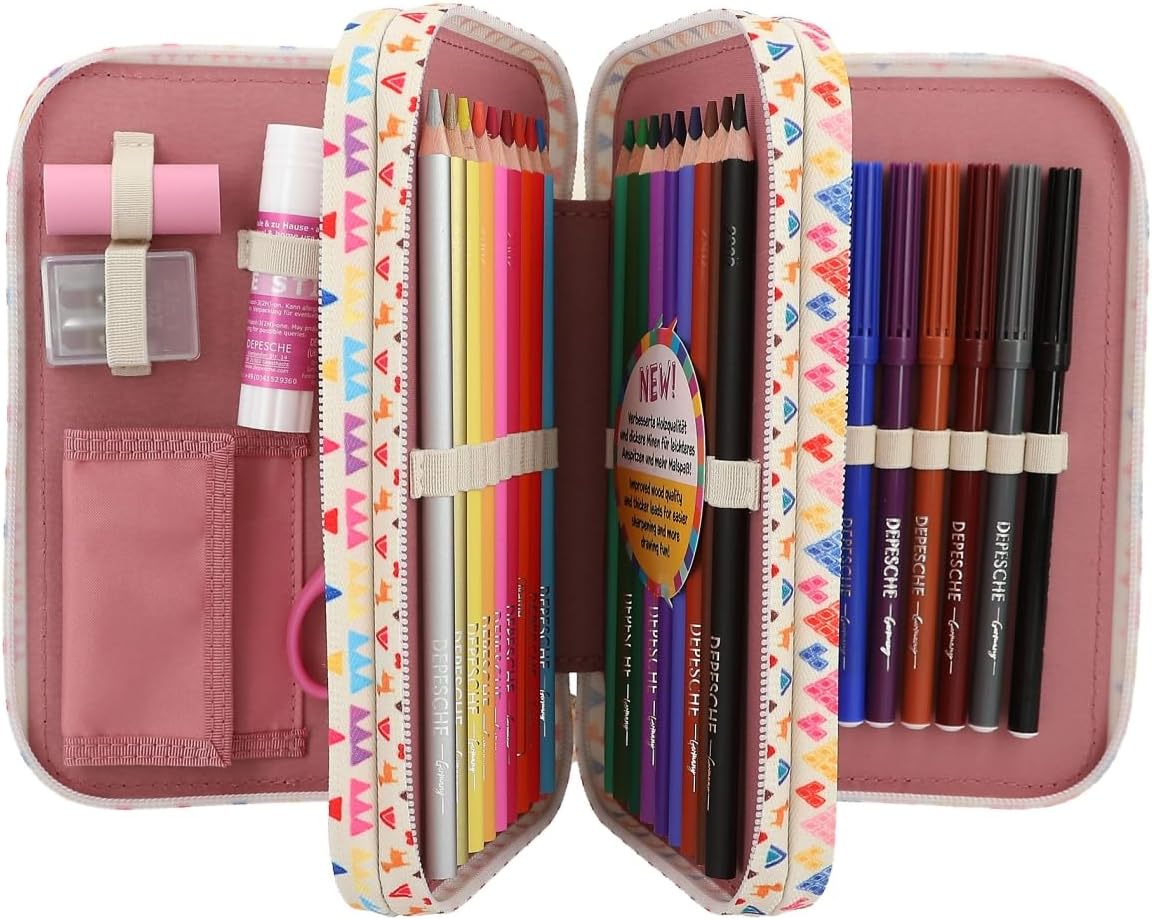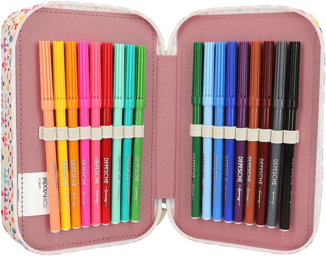 Descrizione Nello scomparto inferiore ci sono 18 matite in fibra di diversi colori, nello scomparto centrale 18 matite colorate e lo scomparto superiore contiene un righello, 2 matite, una matita per colla, forbici, gomma e temperino. Come extra è presente un cordoncino blu, un passante aggiuntivo per la propria penna stilografica e un piccolo scomparto per cartucce d'inchiostro, graffette o foglietti. Caratteristiche: Tre scomparti principali con chiusura lampo. L'astuccio è completamente riempito, con tutto il necessario a scuola. Dimensioni: Profondità: 7 cm Altezza: 20 cm Larghezza: 13 cm Peso: 0,55 kg. Indirizzo del produttore: Depesche Vertrieb GmbH & Co. KG Quattro Paesi Strada 14 21502 Geesthacht Germania E-mail: info@depesche.com Sito web: https://www.depesche.com Telefono: +49 4152 9360 Avviso di sicurezza Attenzione! Pericolo di soffocamento. Piccole parti. Non adatto a bambini di età inferiore a 36 mesi.