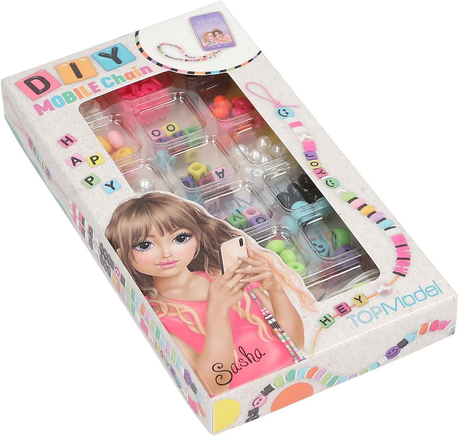 Set di gioielli per bambini per ragazze e menti creative Design: Catena mobile fai da te TOPModel di Depesche - Con perline colorate in vari motivi, comprese le lettere Sono incluse più di 300 perline colorate (lettere), istruzioni illustrate e 2 nastri (circa 2,5 m ciascuno) per realizzare e progettare bellissimi ciondoli per cellulari Con questo set fai-da-te, avrete a disposizione materiali sufficienti per realizzare ciondoli di grande effetto per amici e parenti. Dimensioni della scatola: circa 17,5 x 9,5 x 2 cm, comprese le istruzioni