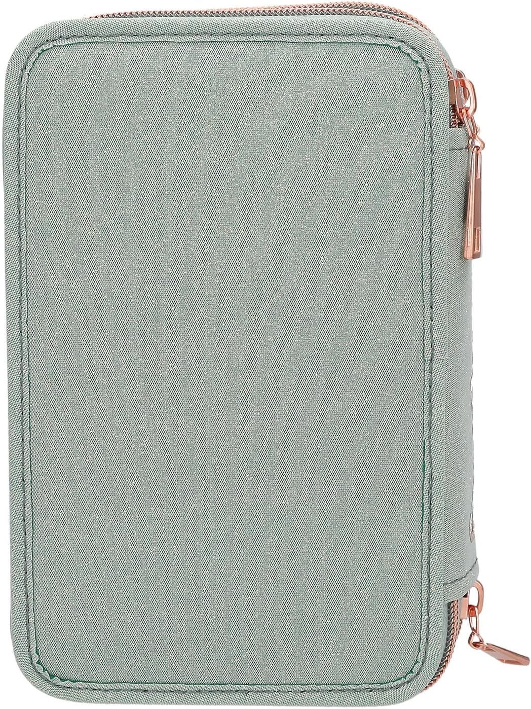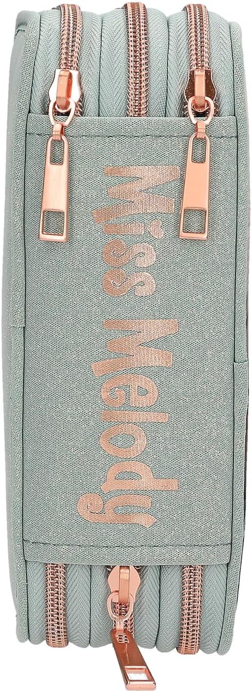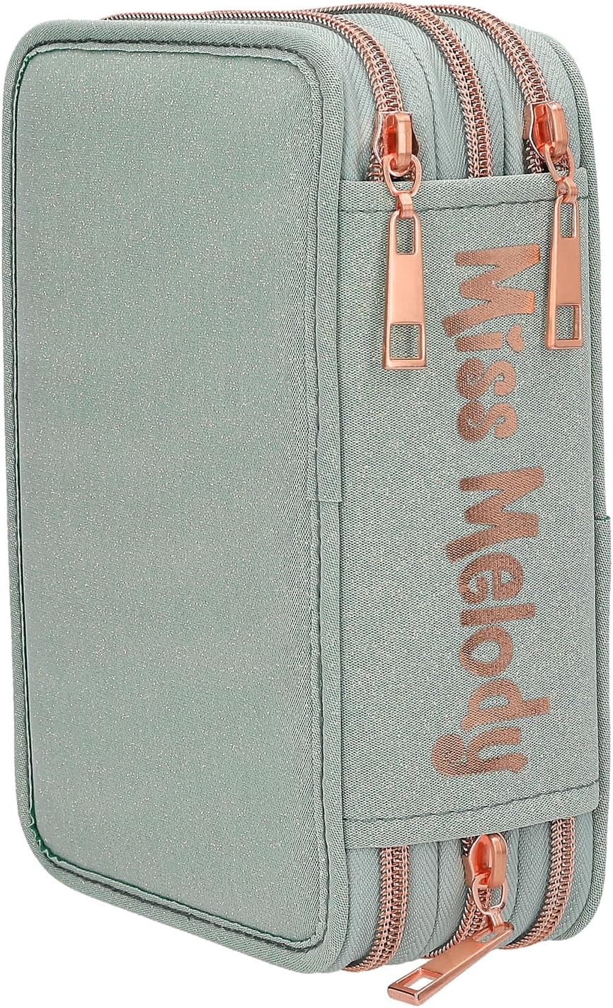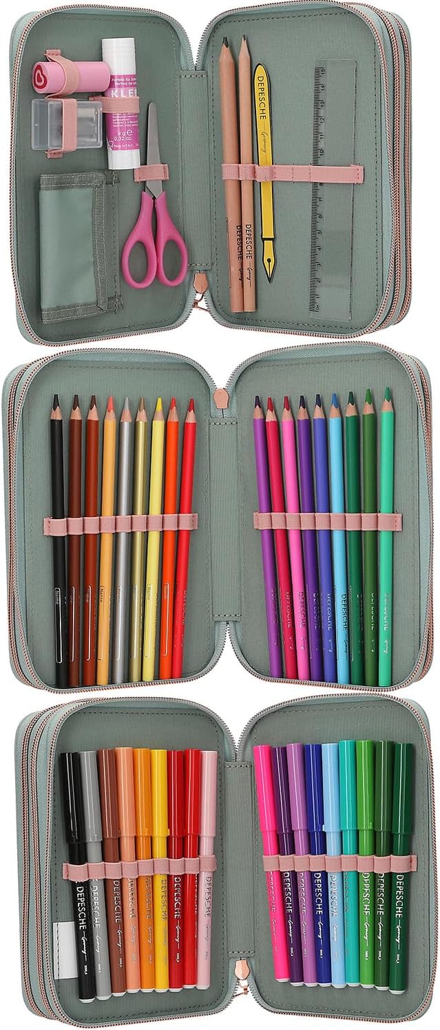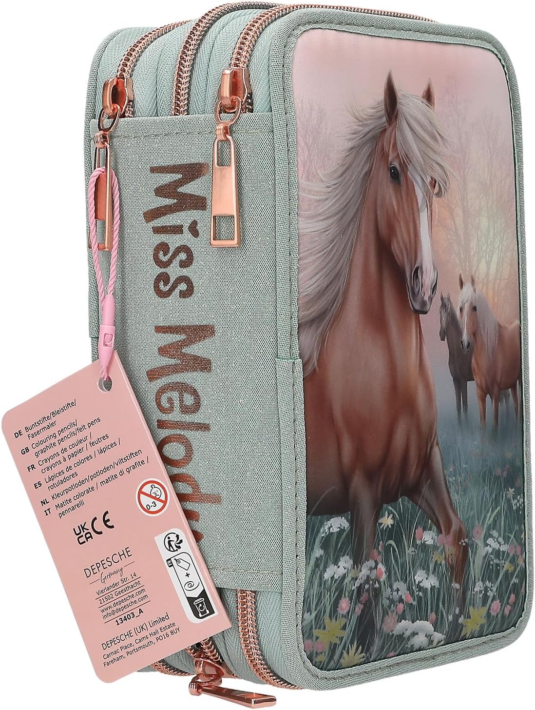 Astuccio per matite per ragazze a scuola, all'asilo e nel tempo libero Design: Miss Melody di Depesche - In verde salvia e rosa, con motivo di cavalli, glitter, alba e un prato di fiori Con 18 pennarelli colorati e 18 pennarelli, 2 matite, doppio temperino, gomma, righello, forbici, colla stick e astuccio in velcro. Un extra interessante: le cerniere in oro rosa e la stampa del logo, che hanno una bella lucentezza. Dimensioni: circa 20 x 13 x 7,5 cm