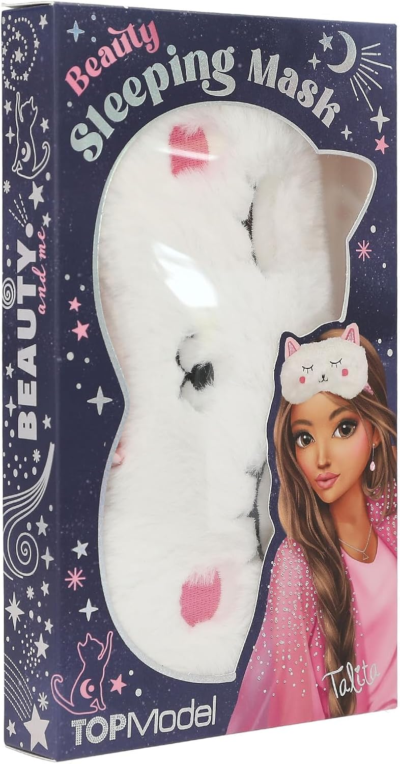 Maschera per dormire per bambine e amici gatti Design: TOPModel Beauty and Me by Depesche - In bianco e rosa, con un simpatico musetto di gatto, glitter, morbido peluche e orecchie di gatto applicate La maschera è leggermente imbottita per essere indossata comodamente durante la notte La fascia in raso arricciata assicura una vestibilità comoda e si adatta bene alla testa Dimensioni: circa 18,5 x 11 x 2,5 cm