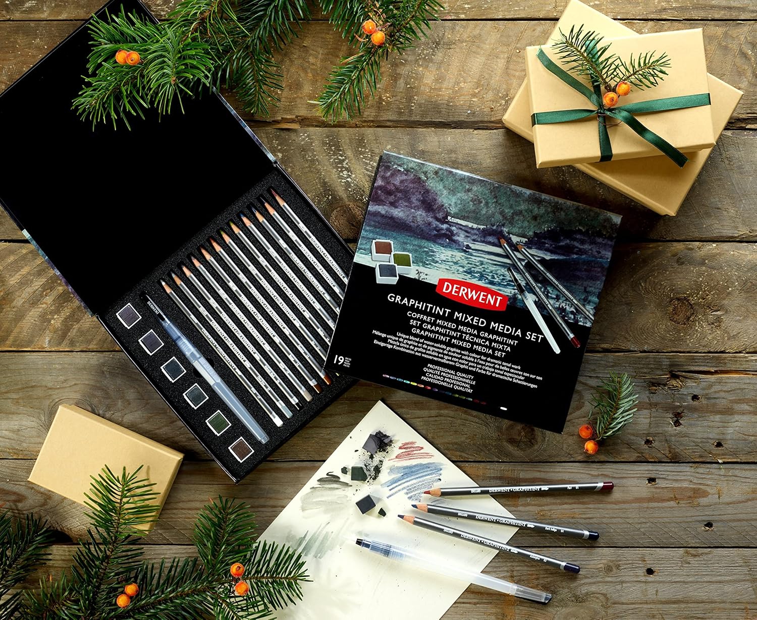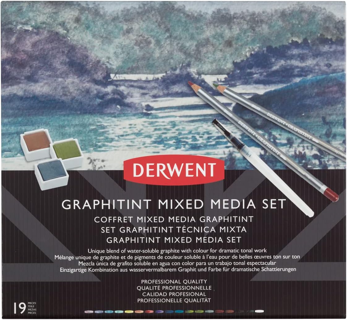 Set Derwent: le matite e le tempere Graphitint, sono formulate con una miscela di grafite e colore, che permette di realizzare lavori tonali dal carattere appassionato Versatili: le matite Graphitint possono essere utilizzate da asciutte per accenni di colore, o da bagnate per donare al quadro sfumature vibranti Vernici Derwent Graphitint: i colori tenui arricchiti dalla lucentezza della grafite, permettono di realizzare sfondi tenui e delicati Combinazioni vincenti: le matite e le vernici Graphitint sono abbinabili alla carta per acquerello pressata a freddo, per realizzare paesaggi urbani e naturali o arte espressiva Contenuto del set Derwent Graphitint: confezione regalo da 12 x matite colorate idrosolubili, 6 x vernici e 1 x waterbrush