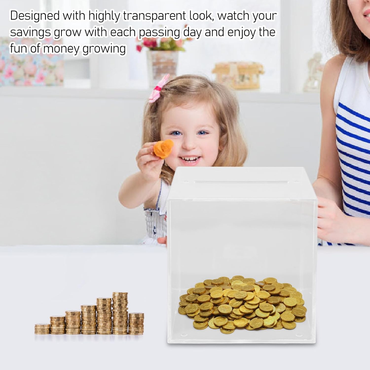 [MONITORARE IL RISPARMIO] - Il design trasparente consente un facile monitoraggio della crescita del denaro, aggiungendo entusiasmo al processo di risparmio. [BREAK-REQUIRED] - Richiede l'interruzione per l'accesso, scoraggiando la spesa impulsiva e promuovendo abitudini di risparmio coerenti. [ACRILICO SICURO] - Realizzato in materiale acrilico resistente, garantisce sicurezza e longevità rispetto ad alternative fragili o difficili da aprire. [FUNZIONE LUCE LED] - La luce brillante si attiva ad ogni deposito, motivando il risparmio e insegnando preziose abitudini finanziarie. [GRANDE CAPACITÀ] - Le ampie dimensioni di 4,7x4,7x4,7 pollici soddisfano vari obiettivi di risparmio, rendendolo ideale per qualsiasi fascia d'età.