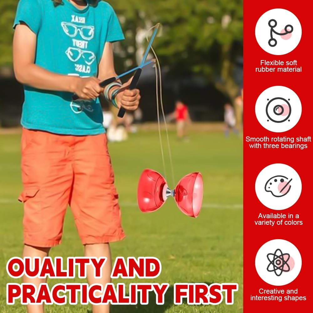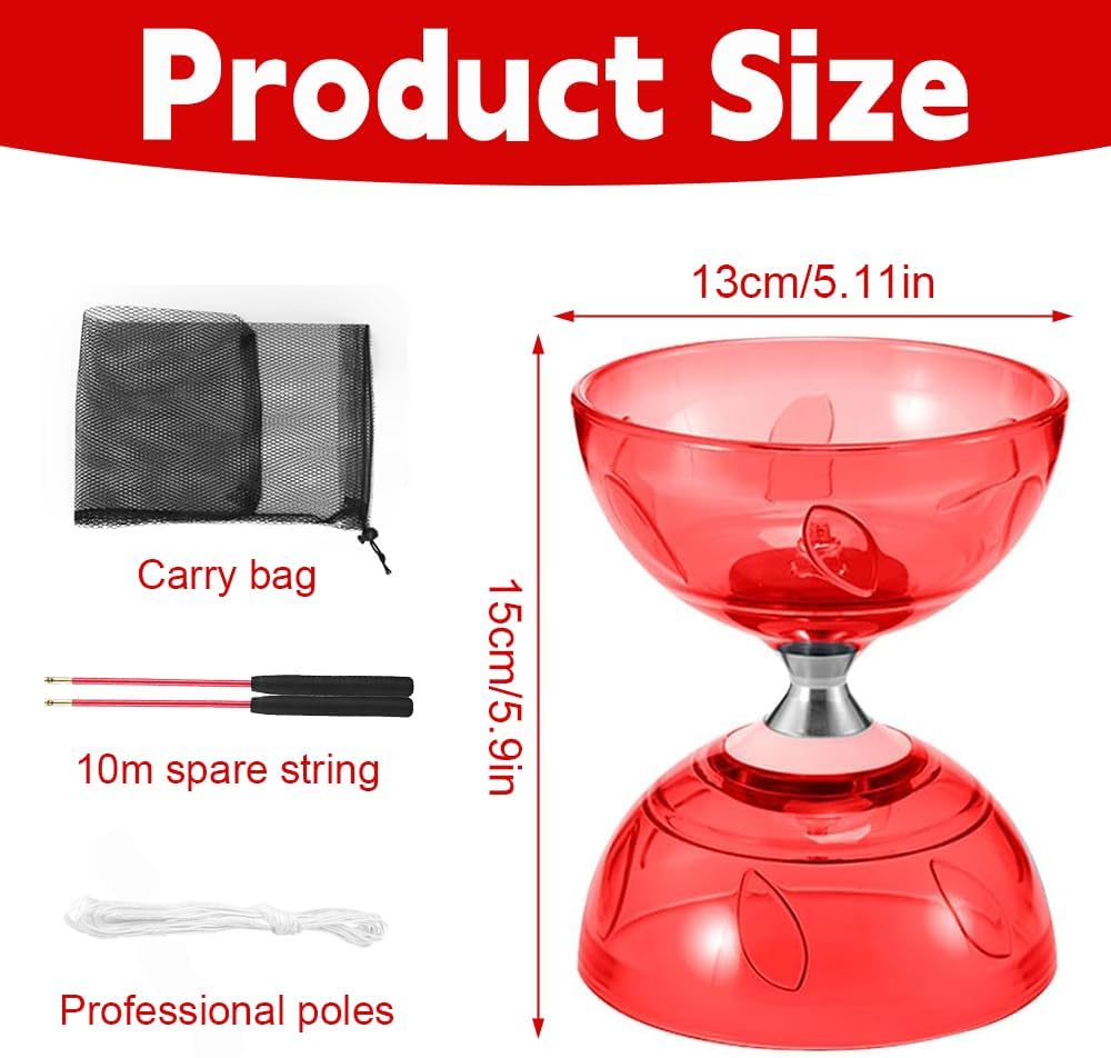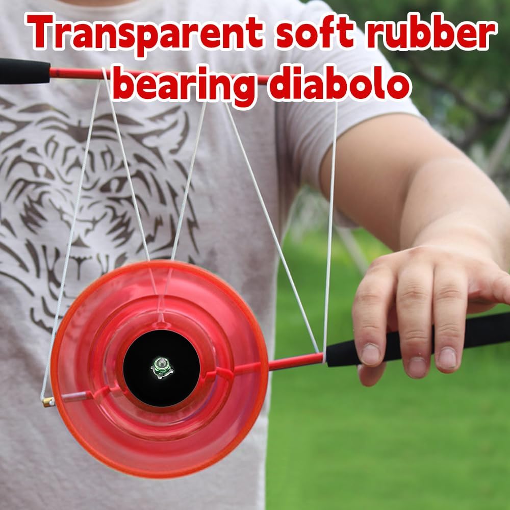 【Diabolo con Cuscinetti a Sfera】Questo Set Diabolo A Triplo Cuscinetto include un diabolo, due bastoncini di bambù, una corda di ricambio da 10 m e una borsa a rete. Il design trasparente permette inoltre ai bambini di vedere direttamente la struttura interna, rendendolo ancora più divertente. Il design portatile e leggero ne facilita il trasporto, che rende facile portare il divertimento ovunque 【Materiale di alta qualità】Il Diabolo con Cuscinetti a Sfera con cuscinetti a sfera è realizzato in gomma morbida trasparente di alta qualità, che offre una buona resistenza all'usura ed elasticità, garantendo che non si deformi o si danneggi facilmente durante l'uso. Il triplo cuscinetto non solo prolunga i tempi di rotazione, ma è anche rivolto ai giocatori avanzati che cercano un gameplay di livello professionale 【Design dei cuscinetti durevole】Dotato di un cuscinetto a movimento scorrevole, offre una rotazione rapida, una maneggevolezza fluida e un'eccellente durata. La sua stabilità, la potenza di rotazione e il peso gestibile consentono l'apprendimento di trucchi avanzati, rendendolo adatto a tutte le età. Il Diabolo con Cuscinetti a Sfera con cuscinetti a sfera scivola dolcemente nell'aria, consentendo una più ampia varietà di trucchi e movimenti di giocoleria 【Adatto ai principianti】Il Diabolo con Cuscinetti a Sfera con cuscinetti a sfera è progettato appositamente per bambini e principianti, con dimensioni moderate, un'impugnatura comoda e un funzionamento semplice e facile da imparare. Il diabolo traslucido si illumina su entrambi i lati con accattivanti luci LED, migliorandone l'aspetto. - Perfetto per i principianti che vogliono imparare ed esplorare il mondo della giocoleria 【Incoraggia la pratica da più angolazioni】Le nostre ruote libere per diabolo con cuscinetti a sfera hanno le dimensioni giuste per un gioco e prestazioni ottimali. I bambini possono provare a tirare e ruotare da diverse angolazioni, il che non solo aumenta il divertimento di questo sport, ma arricchisce anche le loro abilità. Il controllo multi-angolo aiuta anche ad allenare la flessibilità di polsi e dita e migliora la coordinazione dei movimenti