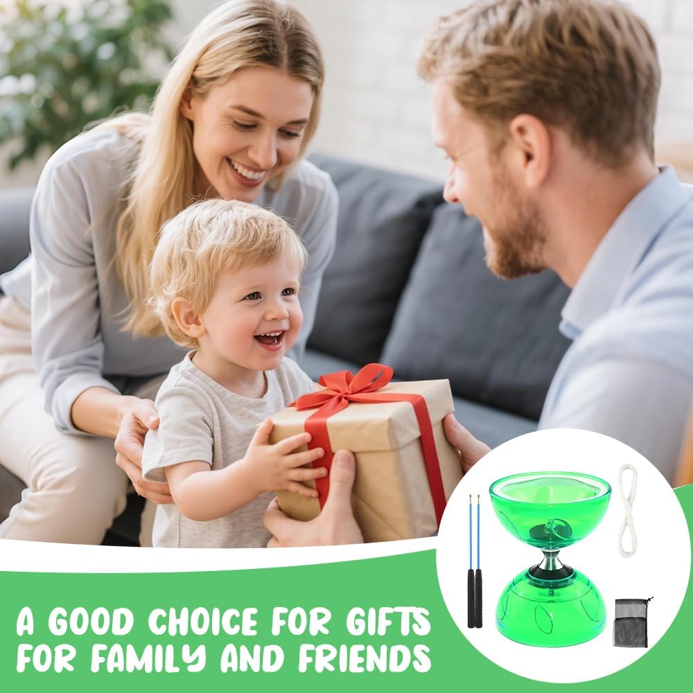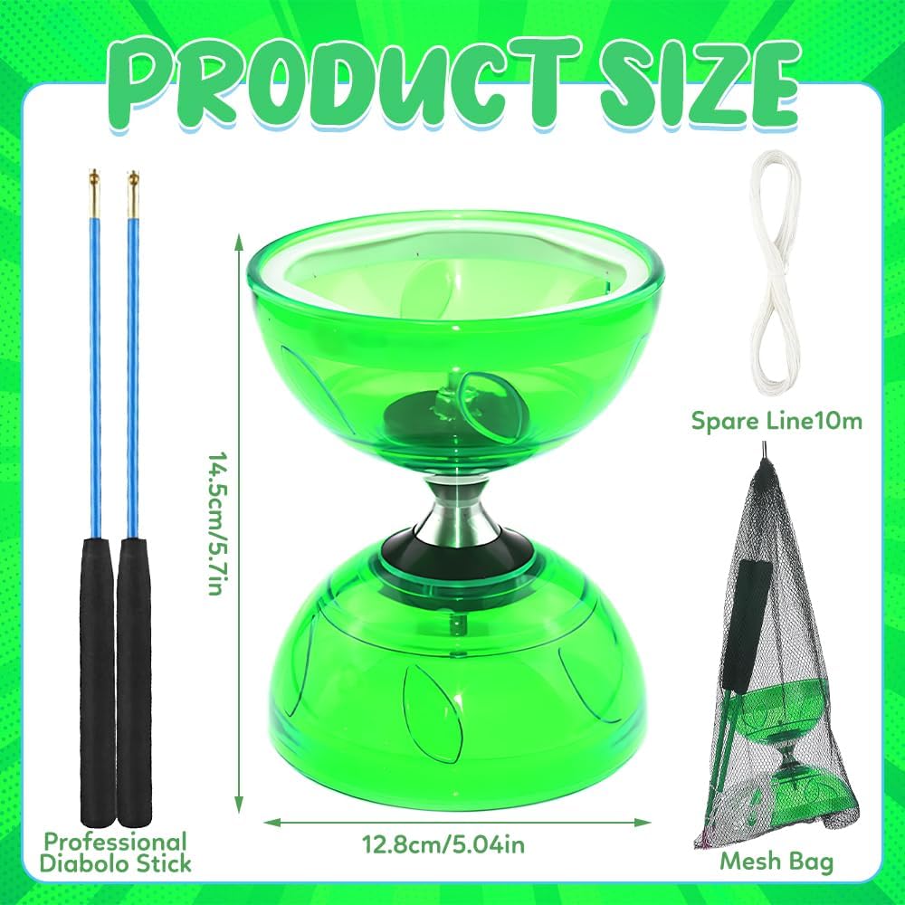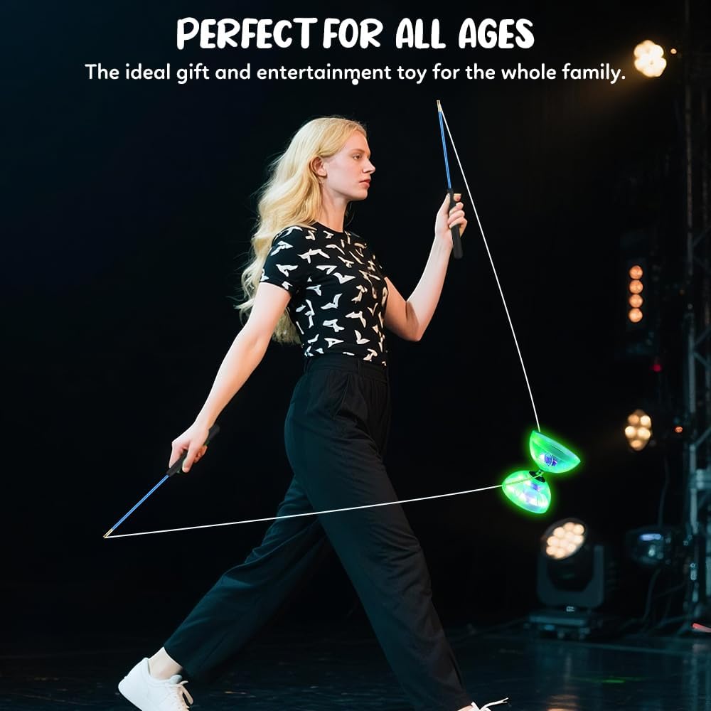 Diabolo luminoso: il diabolo con cuscinetti a sfera brilla su entrambi i lati con attraenti luci a LED che esaltano il suo fascino visivo. Prova l'emozione di giocare con un diabolo luminoso che si illumina al buio, aggiunge una dimensione emozionante alle tue ore di giocoleria e ti regala un'esperienza fresca. Diabolo di alta qualità: questo diabolo con cuscinetti a sfera è realizzato in gomma robusta e si distingue per l'eccellente durata e resistenza. Il materiale in gomma assorbe gli urti, resiste agli urti e previene le rotture. Il cuscinetto triplo monouso non solo prolunga i tempi di ripresa, ma è anche rivolto a giocatori avanzati che cercano un gameplay di livello professionale. 【 Facile giocoleria 】 Provate movimenti fluidi e senza sforzo durante la giocoleria, con la certezza che il vostro Diabolo è saldamente fissato per garantire prestazioni stabili e controllate. Scivola dolcemente nell'aria e consente una maggiore varietà di trucchi e manovre di giocoleria. 【Per professionisti e adulti】 Questo LED Diabolo è stato sviluppato sia per principianti che per professionisti e garantisce stabilità e facilità d'uso a diverse velocità. Grazie alla sua stabilità, forza di rotazione e peso maneggevole, l'apprendimento di trucchi avanzati è possibile per adulti e professionisti. Divertimento senza limiti: il diabolo con cuscinetti a sfera viene fornito con una borsa portatile in rete, che lo rende facile da portare ovunque tu vada. Goditi il tempo allegro nel tuo tempo libero.