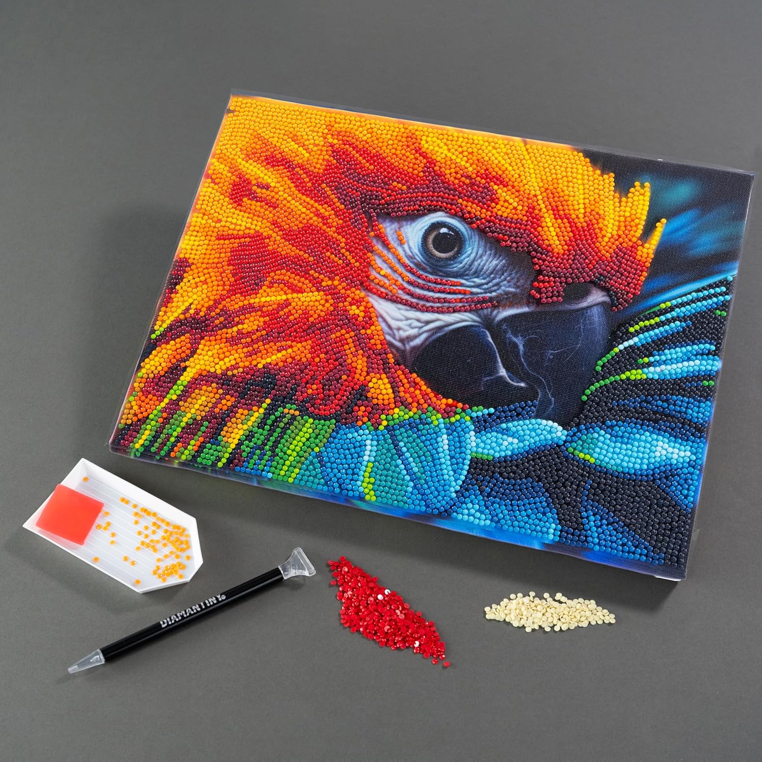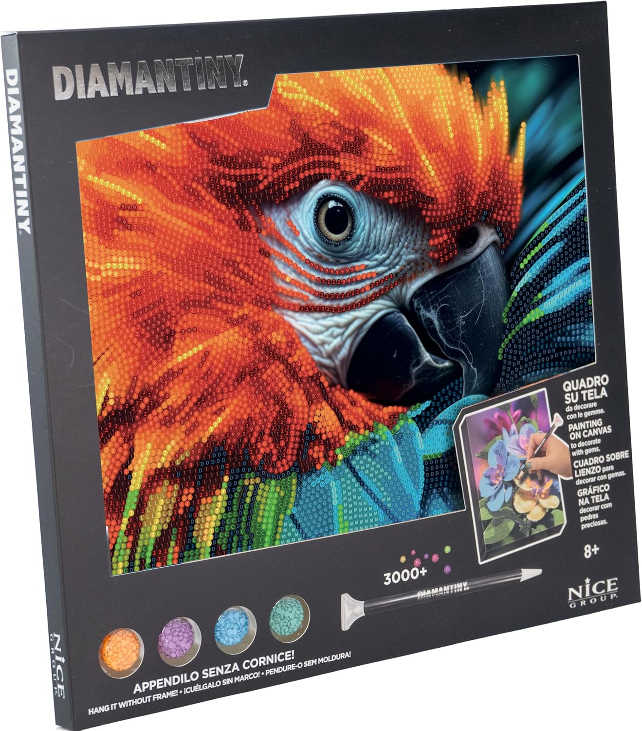 DIAMANTINY LEVEL UP: è l’attività crystal art per creare mosaici fai-da-te, in rilievo, con coloratissime gemme 3D. Disponibile nella versione QUADRO Animale Pappagallo Ara da gemmare. TECNICA: per decorare il mosaico a forma di quadro su tela Canvas Pappagallo Ara da appendere devi utilizzare la tecnica "crystal art, colora con i numeri”, applicando le gemme ai numeri. Il foglio di istruzioni ti guida nell’applicazione. FUNZIONE: questa attività è molto semplice e rilassante. Aiuta i bambini e i giovani a sviluppare la manualità, la coordinazione e la concentrazione. CONTENUTO: il set contiene 1 quadretto di cm 32 x 30 con base adesiva e guida colore, 3000+ cristalli colorati, 1 vassoio raccoglitore, 1 penna con cui applicarli e 1 quadratino di cera. Prodotto ORIGINALE Diamantiny. Età consigliata: 8+