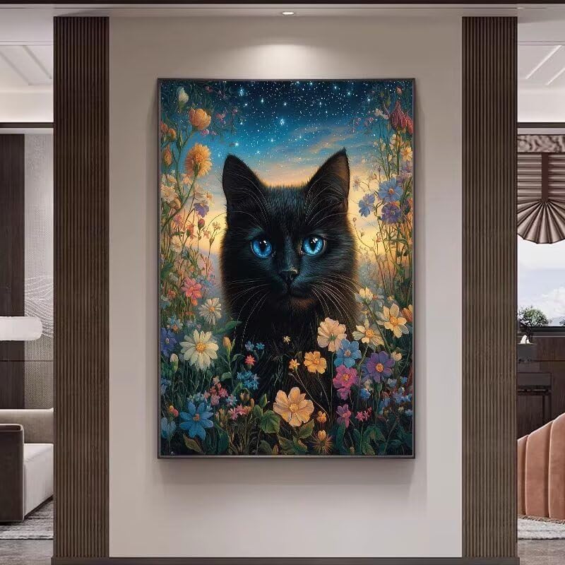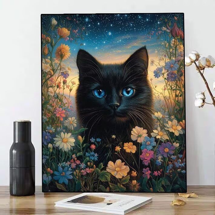 Diamond Painting Gatto nero fiore Diamond Painting Kit Completo, 5D Pittura Diamante Kit per Adulti Principianti, DIY Strass Croce Craft Arts Mosaici Pittura Diamante for Home Wall Decor 25x35cm s-124