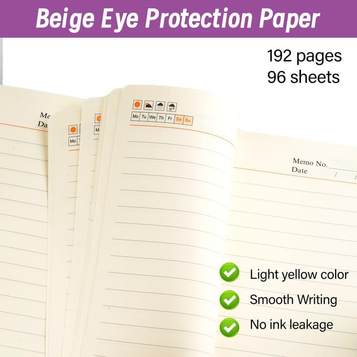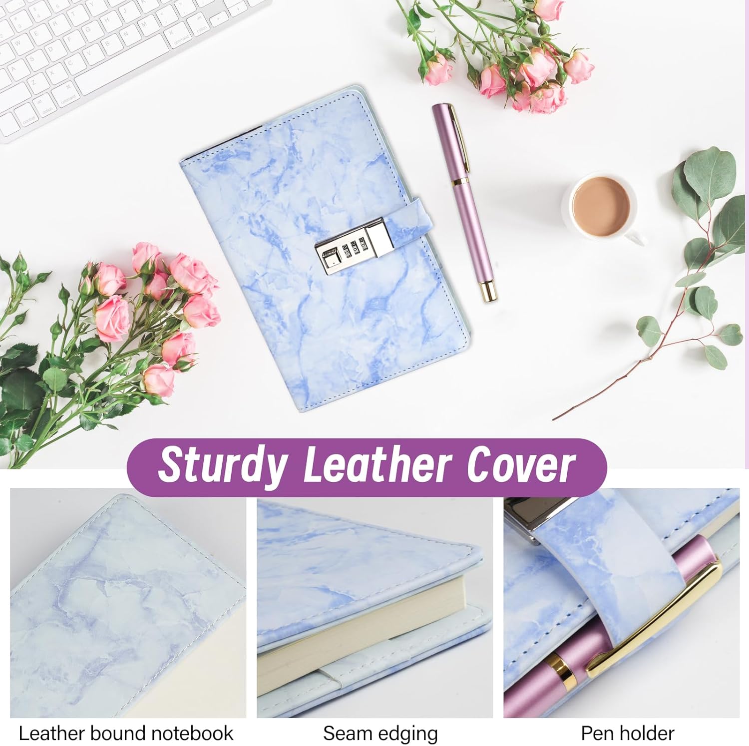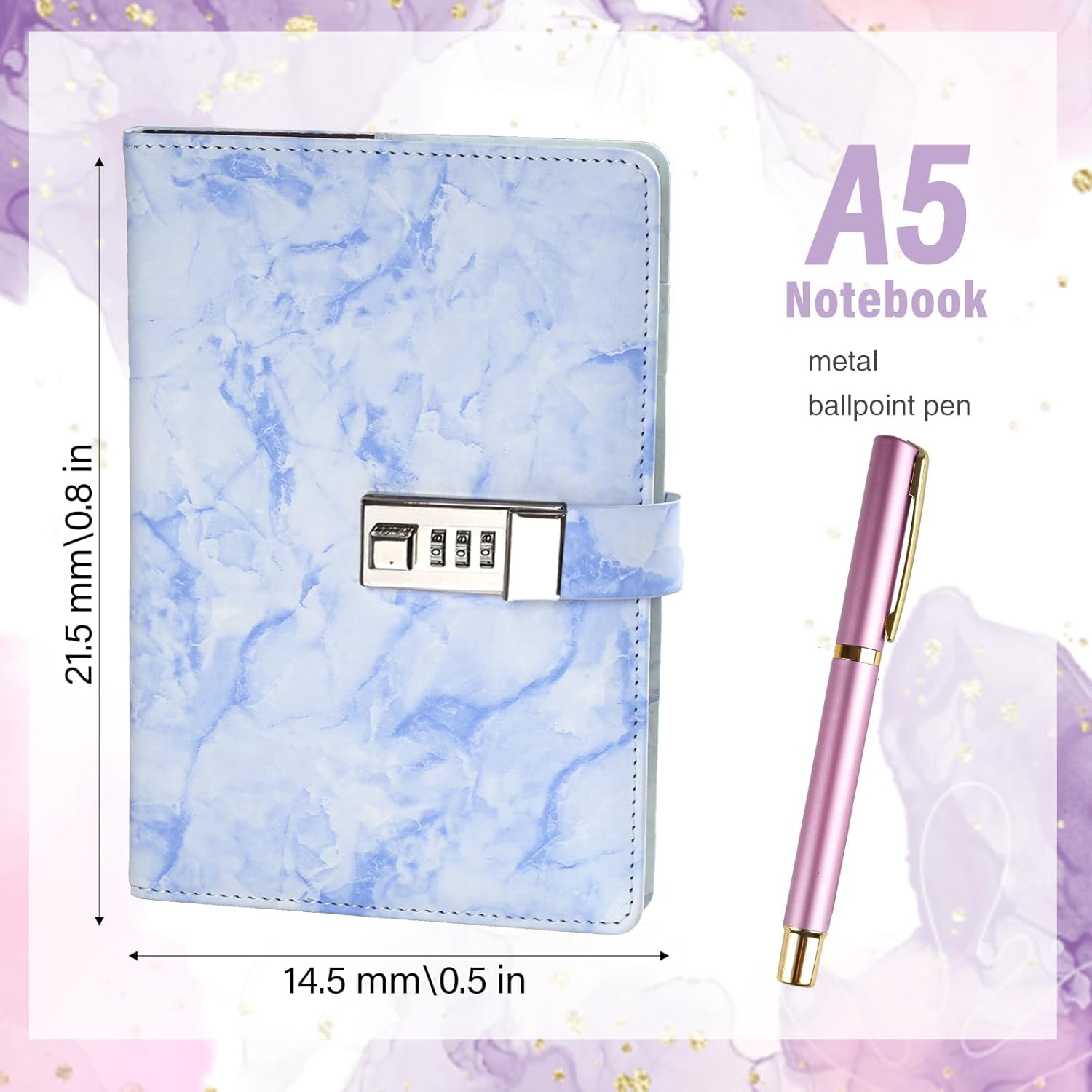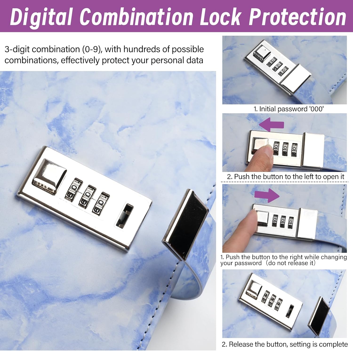 Diario A5 con serratura: Il quaderno con serratura ha un formato A5, circa 21x15 cm, e contiene 192 pagine (96 fogli). È portatile e conveniente, viene fornito con una penna a sfera in metallo, facile da usare. Carta delicata per gli occhi: l'agenda A5 con blocco a codice utilizza carta giallo chiaro progettata per essere gradevole agli occhi. La consistenza liscia della carta offre un'esperienza di scrittura confortevole, previene la fuoriuscita dell'inchiostro e riduce l'affaticamento degli occhi. Design con lucchetto a combinazione: le agende sono dotate di un lucchetto che consente una combinazione a 3 cifre (0-9), con centinaia di combinazioni possibili. Ciò fornisce una protezione efficace per le tue informazioni personali e i contenuti importanti (il codice predefinito è 000). Copertina in pelle resistente: la copertina in pelle PU è resistente all'usura e alle macchie e fornisce protezione impermeabile e antipolvere per le pagine interne. La copertina presenta un motivo marmorizzato viola, che gli conferisce un aspetto unico ed elegante. Taccuino versatile: il diario digitale delle password è versatile, ideale non solo per le voci del diario, ma anche per la pianificazione quotidiana, i diari di viaggio, gli schizzi e la scrittura creativa. È perfetto per studenti, professionisti e viaggiatori