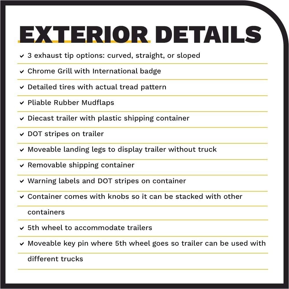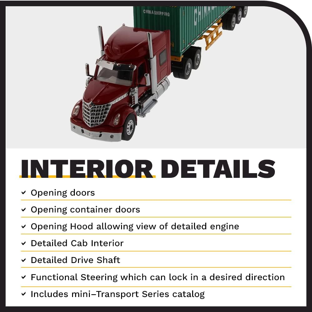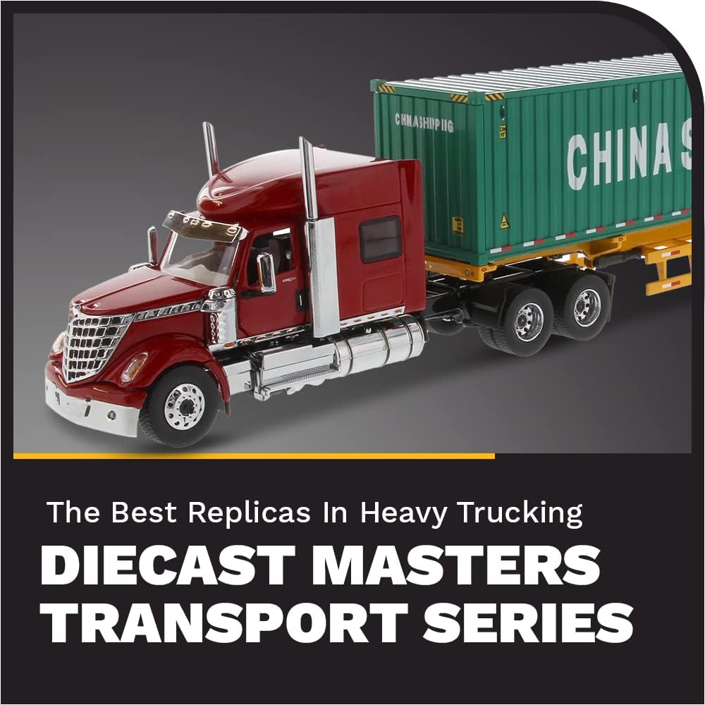 Scatola nuova. Pneumatici in vera gomma. Prodotto con licenza ufficiale. Camion ha apertura cofano e porte. Interno dettagliato, esterno, vano motore. Il contenitore è realizzato in plastica e ha porte apribili. Dimensioni approssimative: lunghezza 14, larghezza 2,5, altezza 8,6 cm. Camion e rimorchio sono realizzati in pressofusione con alcune parti in plastica. Serie di trasporto Imballaggio: Confezione in stile slide-box Premium stampata con grafica a colori e specifiche di autocarri e rimorchi reali un livello di imballaggio che i collezionisti hanno apprezzato tutti i prodotti Diecast Masters.
