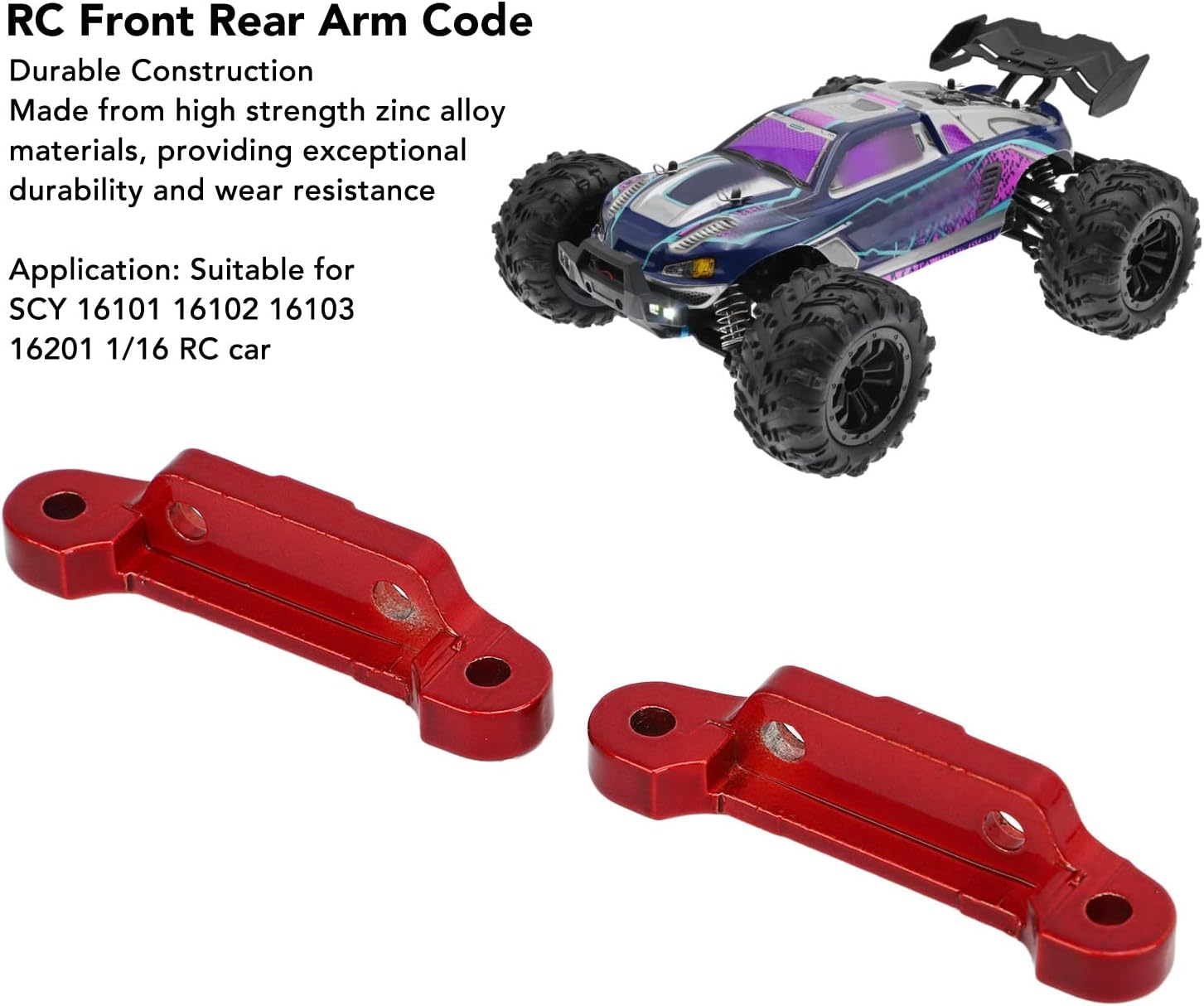 Costruzione durevole: realizzato con materiali in lega di zinco ad alta resistenza, il codice del braccio RC è costruito per durare, fornendo eccezionale durata e resistenza all'usura.,Codice del braccio posteriore anteriore RC Design elegante: con il suo aspetto e le prestazioni stabili, il codice del braccio RC aggiunge tocco di realismo alla tua auto telecomandata, rendendola più bella e pratica.,Codice del braccio RC Facile da installare: il set di codici del braccio è facile da installare e rimuovere, consentendo la sostituzione diretta di parti danneggiate o usurate per ottenere una maggiore resistenza.,Codice del braccio RC 1/16 Leggero e robusto: caratterizzato da design leggero ma robusto, il codice del braccio RC offre prestazioni stabili senza aggiungere peso extra al tuo veicolo telecomandato., Leggero e robusto: caratterizzato da design leggero ma robusto, il codice del braccio RC offre prestazioni stabili senza aggiungere peso extra al tuo veicolo telecomandato.,Sostituisci il codice del braccio RC