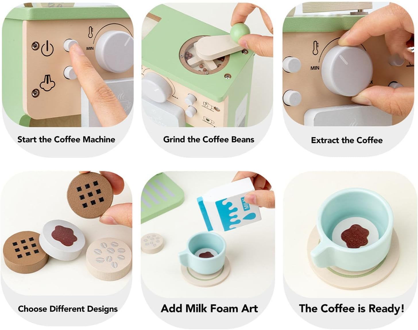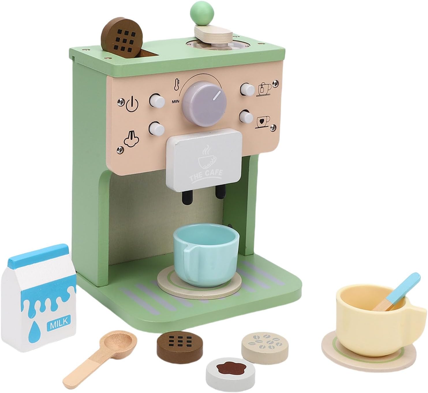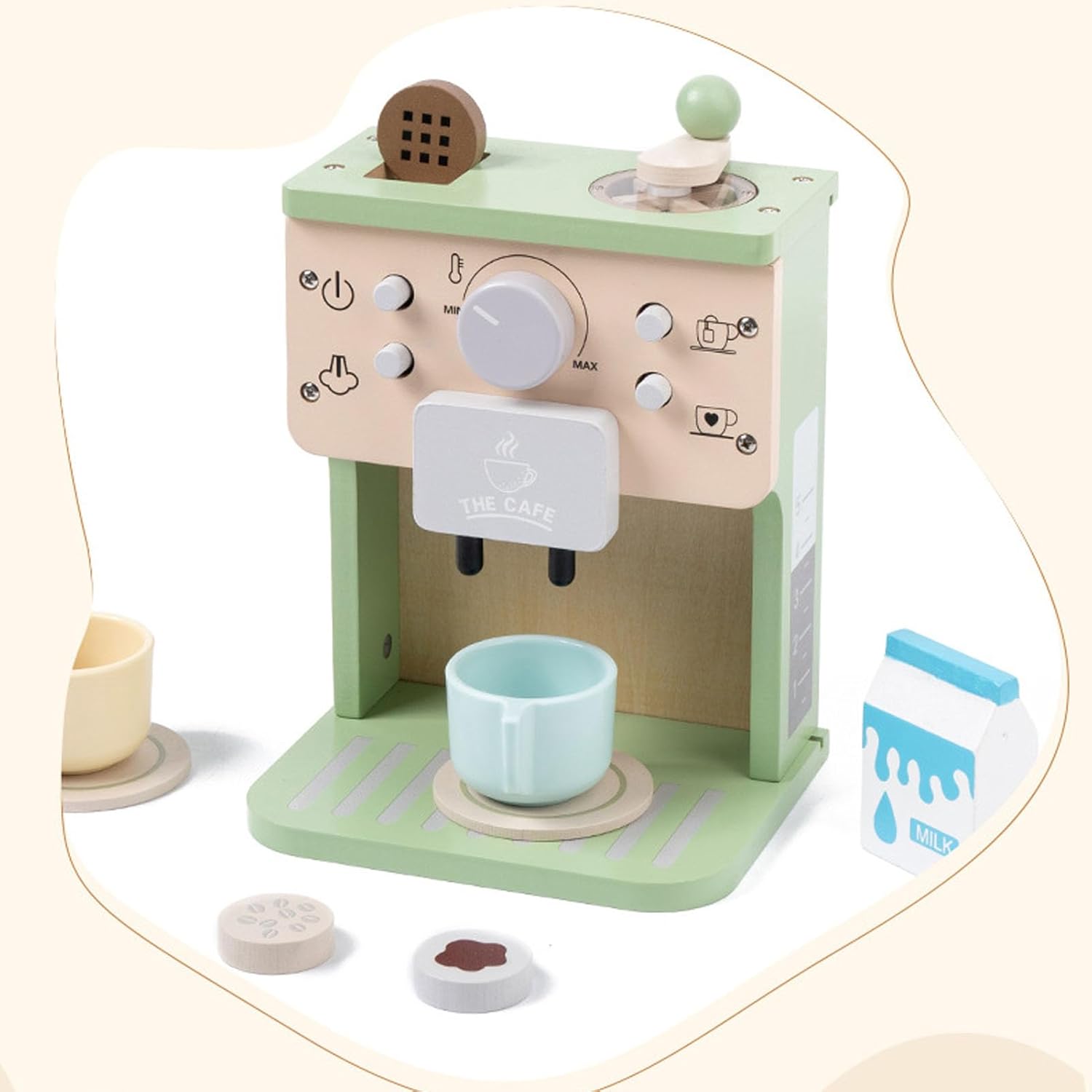 Compagno giocattolo da cucina: questa postazione da caffè autonoma è stata progettata per integrare le configurazioni di cucine da gioco esistenti. Offre funzionalità realistiche per scenari di gioco drammatici per ambienti di apprendimento domestici e prescolari. Vecchia struttura in plastica ABS: questo giocattolo per caffettiera è realizzato in legno di prima qualità e plastica ABS sicura per i bambini con colori non corrosivi. Set completo da caffè: questo coinvolgente set da gioco include una caffettiera in legno, un cartone del latte, due tazze con sottobicchieri, cucchiai e zollette di zucchero, fornendo tutto il necessario per un coinvolgente gioco di ruolo da barista. Vantaggi per lo sviluppo educativo: incoraggia la creatività, le abilità sociali e il vocabolario attraverso il gioco drammatico, aiutando allo stesso tempo a sviluppare le capacità motorie e la coordinazione occhio-mano mentre prepara il caffè per i bambini piccoli: con il suo design affascinante e il valore educativo, questo set di giocattoli è per Caffettiera un meraviglioso compleanno, una vacanza o un regalo per ragazze dai 3 ai 5 anni. che amano i giochi di ruolo fantasiosi
