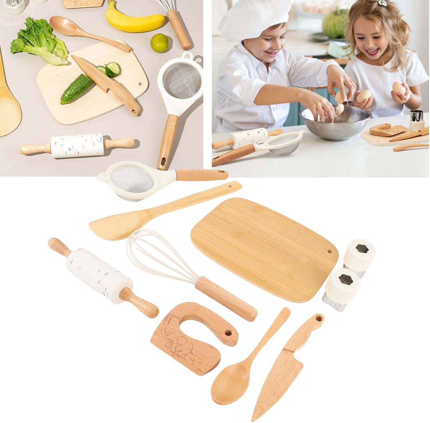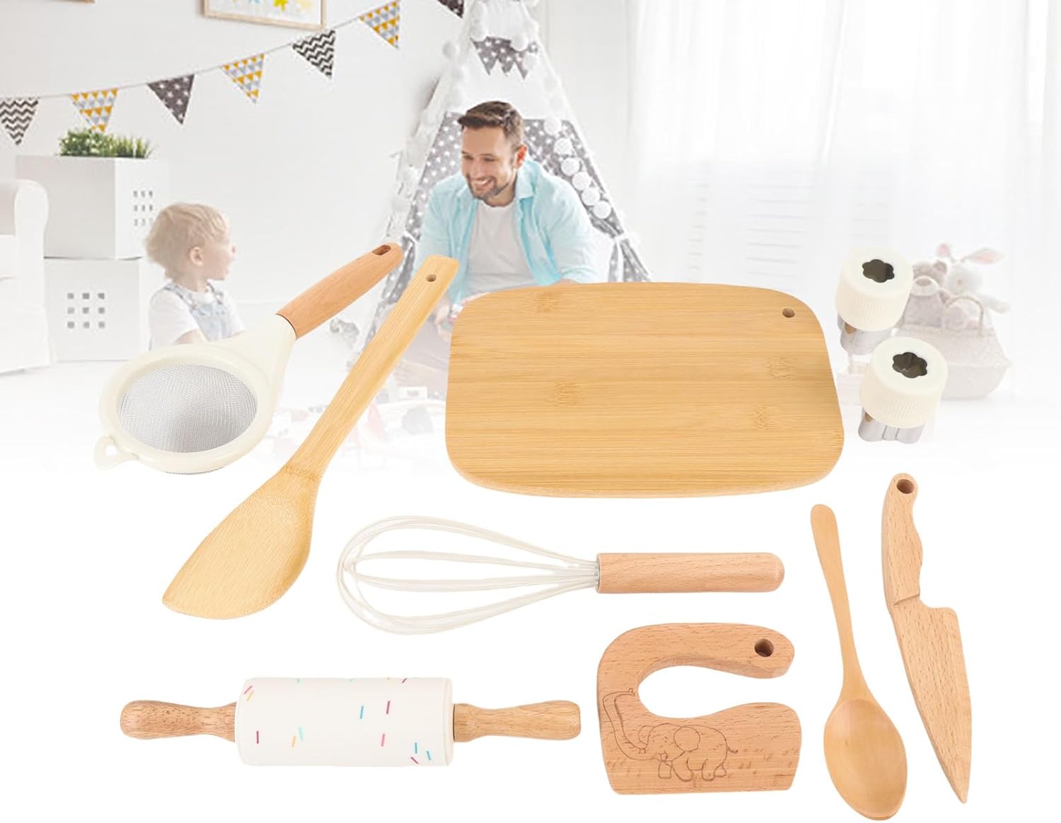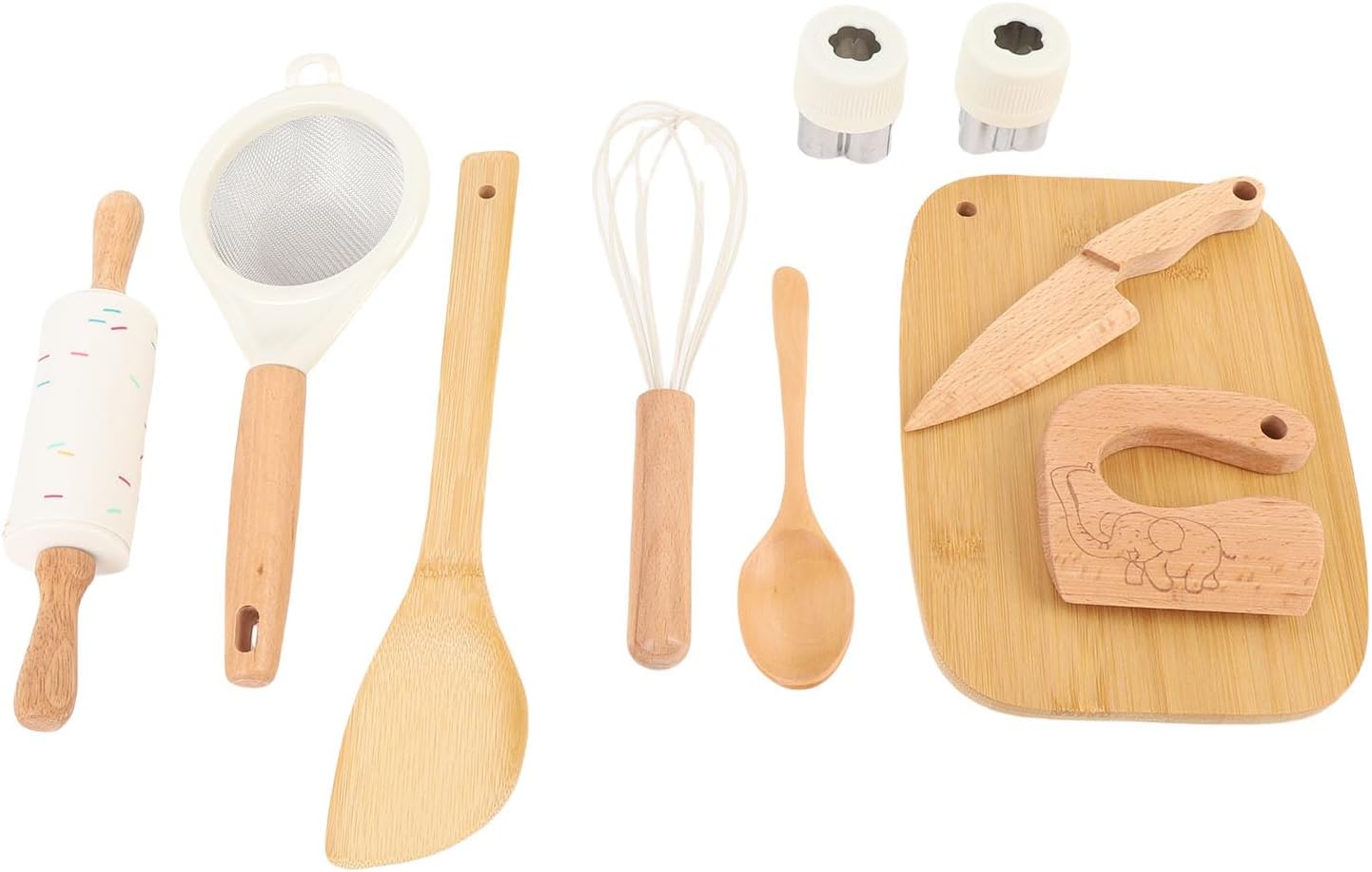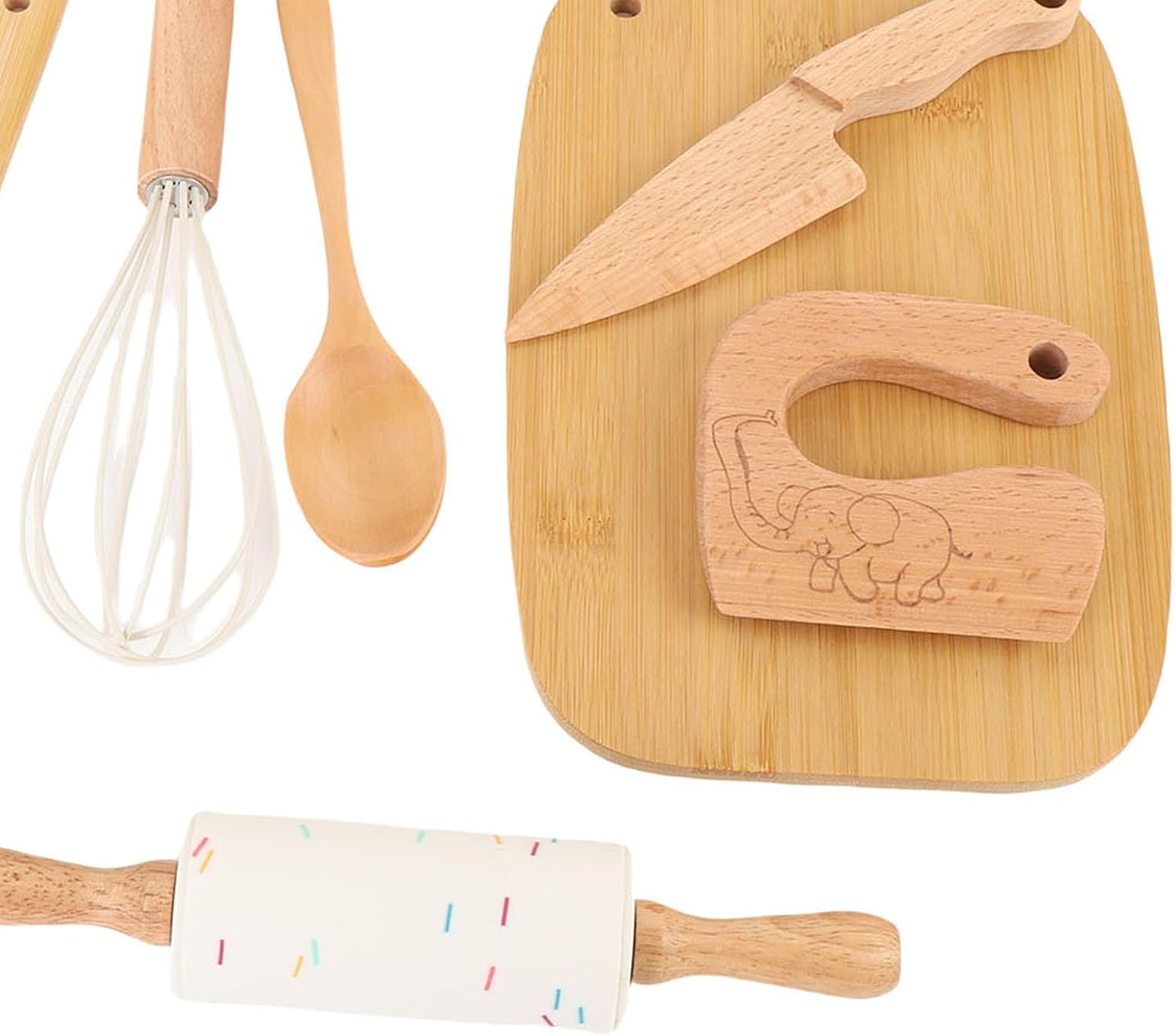 [Set da cucina da gioco finto completo] Questo set completo di coltelli per bambini in legno comprende 10 pezzi essenziali come un perno di rotolamento del cucchiaio da tagliere e altro ancora per fornire infinite ore di gioco fantasioso. per i piccoli chef che amano imitare veri scenari di cucina mentre sviluppano abilità di vita essenziali in modo divertente e coinvolgente. [Design sicuro e resistente] Realizzati in legno di faggio di alta qualità Questi giocattoli da cucina sono costruiti per resistere al gioco rigoroso garantendo al contempo la sicurezza completa per i bambini. I bordi lisci e la costruzione robusta li rendono ideali per le piccole mani che offrono un tempo di gioco senza preoccupazioni per genitori e bambini. [Benefici educativi e di sviluppo] progettati per i bambini di età pari o superiore a 3 anni promuove il coordinamento di Handye e il pensiero creativo per lo sviluppo motorio. Gli strumenti realistici della cucina incoraggiano lo sviluppo cognitivo attraverso il pretendente gioco che rende l'apprendimento divertente e interattivo. [Incoraggia l'interazione sociale] Questo Playset promuove il prezioso tempo di legame familiare mentre i bambini si impegnano in attività di cucina collaborativa con genitori o amici. La natura interattiva del set aiuta a sviluppare le capacità comunicative e il lavoro di squadra mentre scatenano esperienze gioiose condivise. [Strumenti da cucina realistici di alta qualità] Ogni pezzo di questo set è attentamente progettato per assomigliare a veri utensili da cucina che danno ai bambini un'esperienza di cottura autentica. La finitura in legno naturale e il dimensionamento proporzionato rendono questi strumenti perfetti per le mani piccole mantenendo un aspetto e un aspetto realistici.