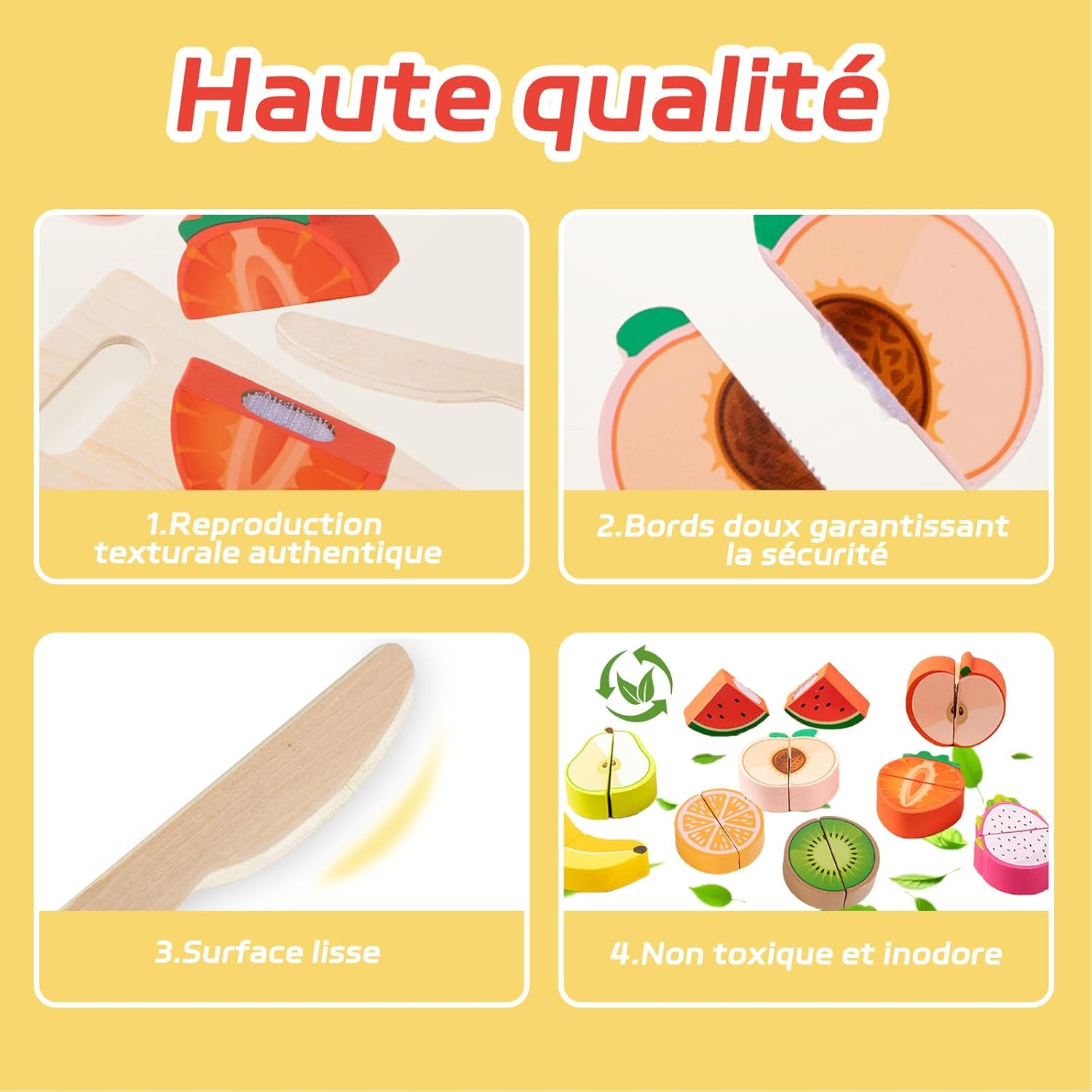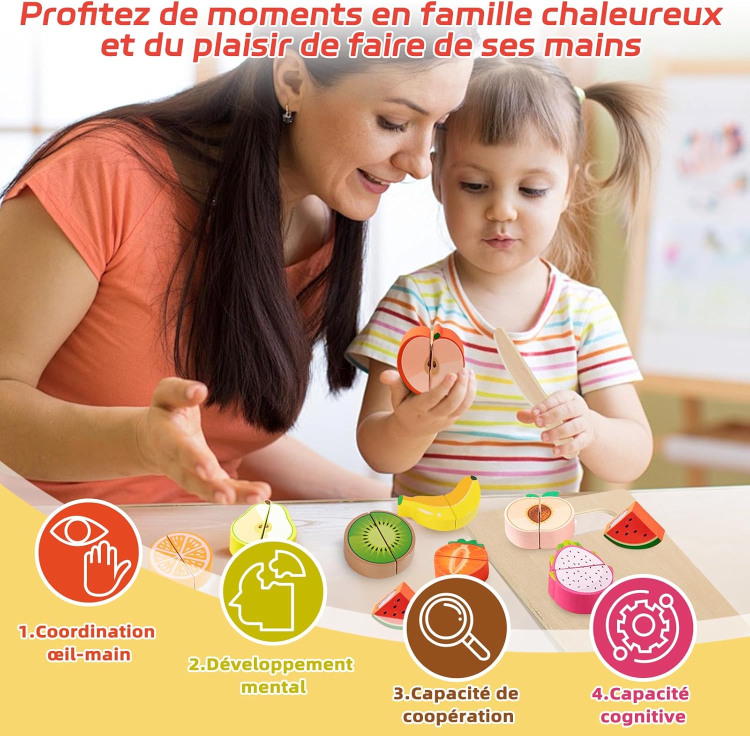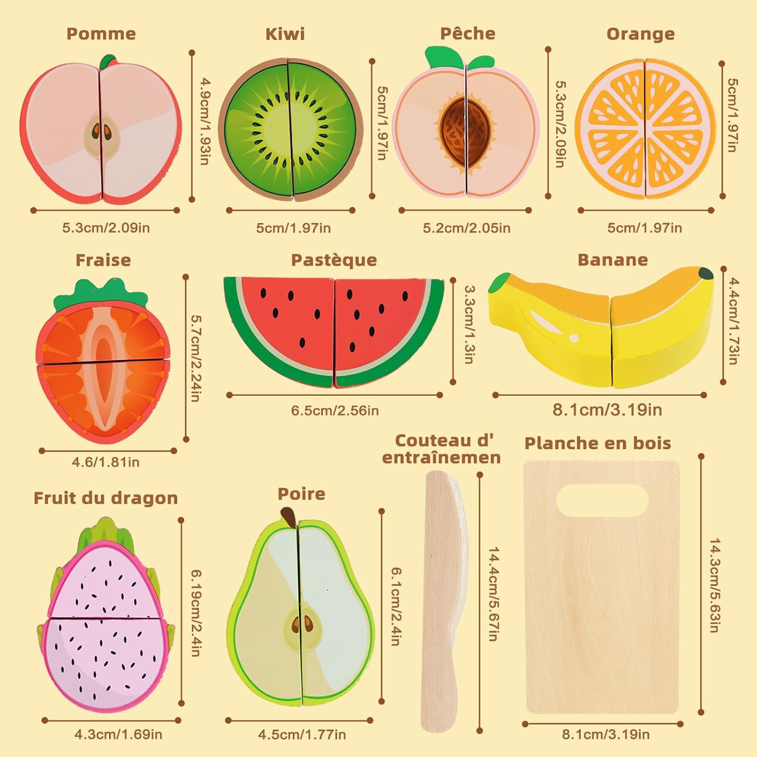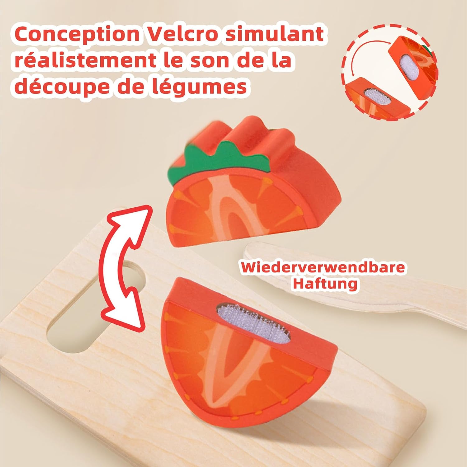 Dinette da cucina in legno per bambini – 9 pezzi di frutta colorata con morbide cuciture a strappo; il caratteristico “click” invita i piccoli chef a “tagliare” ancora e ancora. Giocattoli in legno per tagliare la frutta – Una volta terminata la "ricetta", mela, pera e compagnia ritornano nella scatola fornita; la cucina rimane in ordine e può iniziare la prossima partita. Set Completo per la Dinette Bambini - Nove succosi frutti in legno, robusta tavola quadrata e timbro in legno: ingredienti sufficienti per “creare” torte, macedonie o coloratissimi frullati. Perfetto per le mani dei più piccoli: i manici corti e spessi si adattano bene al palmo; pollice, indice e medio vengono naturalmente esercitati in ogni nuova scena culinaria. Sviluppo dai 2 anni – Iniziamo tagliando e ricostituendo, continuiamo nominando i colori, contando e seguendo i menu “reali” – un mondo di apprendimento senza schermo.