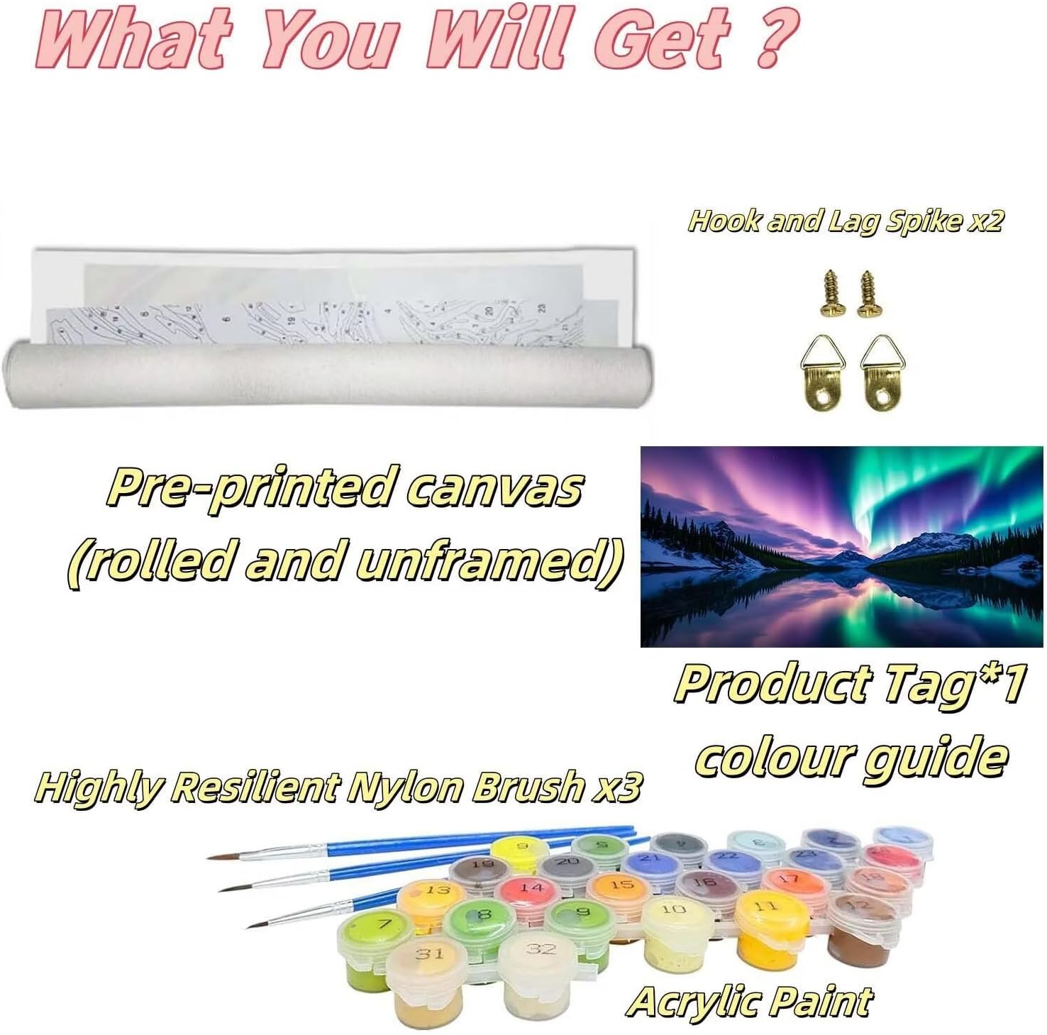 【Kit Dipingere Con I Numeri Adulti】 Include: 1 tela testurizzata prestampata 30x60cm (senza cornice), 3 pennelli, 1 set 36 pigmenti acrilici, 1 immagine campione. kit pittura adulti fai da te include tutto il necessario per iniziare senza dover acquistare altro 【II Numeri Sono Chiari E Sicuri Materiali】 Tela ad alta densità è resistente e facile da colorare, i numeri e le linee sono trasparenti. Vernici acriliche sicure di alta qualità, colorate, ricche e piene, impermeabili dopo l'asciugatura, numeri facili da leggere aiutano a identificare il colore corretto da utilizzare, nessun affaticamento degli occhi anche dopo lunghe ore di pittura, può essere conservato a lungo dopo il completamento 【Fai Da Te Creativo Adulti】 Kit pittura adulti con i numeri sono fantastici per gli adulti, che tu sia un principiante o un esperto. Puoi iniziare a dipingere opere d'arte dopo aver aperto la confezione. Paint by numbers adulti è un hobby creativi semplice e interessante, è facile per chiunque non abbia conoscenze di disegno realizzare un'opera d'arte classica. goditi il divertimento del fai da te e della colorazione in base ai numeri 【 Donne Hobby E Regali】Dipingere con i numeri adulti, un regalo speciale per la tua famiglia e i tuoi amici per compleanni o feste importanti, come san valentino, halloween, natale e capodanno, perfetti anche per decorare la casa e l'ufficio, questo è il modo moderno per illuminare le pareti della tua casa e rilassarti dopo il lavoro 【Paint By Numbers Servizio Per Adulti】 Se hai domande sul kit di pittura con i numeri dopo averlo ricevuto, il nostro servizio clienti è a portata di e-mail su amazon. Ti risponderemo molto presto e ci occuperemo delle tue preoccupazioni o dei tuoi problemi