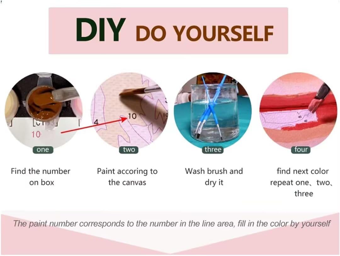 【Contenuto della Confezione】Il set Dipingere con i Numeri Adulti include una tela pre-stampata con texture (Dipingere con i Numeri con Telaio), un set di Pittura Acrilica, e un Kit di Pennelli (3 pennelli). Non è necessario acquistare ulteriori cornici, pratico per Hobby Creativi Adulti. 【Facile da Usare】Il kit Dipingi con i Numeri Adulti non richiede particolari abilità pittoriche. È sufficiente abbinare i numeri ai colori corrispondenti per ottenere un risultato soddisfacente, adatto anche ai principianti in Passatempo per Adulti. 【Portatile e Pratico】Il telaio in legno può essere facilmente montato e smontato, facilitando il trasporto. Una volta completato, il quadro Quadri da Dipingere Numerati può essere appeso al muro o appoggiato su una superficie, ideale per il Kit Fai Da Te Adulti. 【Tela ad Alta Definizione】La tela Dipinto con i Numeri per Adulti è realizzata con materiali di qualità che rendono le aree numerate chiare e facilmente distinguibili. Questo garantisce un'esperienza di pittura piacevole, perfetta per Tela da Dipingere con Numeri. 【Decorazione e Regalo Creativo】Il quadro finito Kit Pittura Adulti è ideale per decorare soggiorni, camere o uffici. È anche un'ottima idea regalo per compleanni, matrimoni o festività, adatta anche come Crafty by Numbers e per Creart.